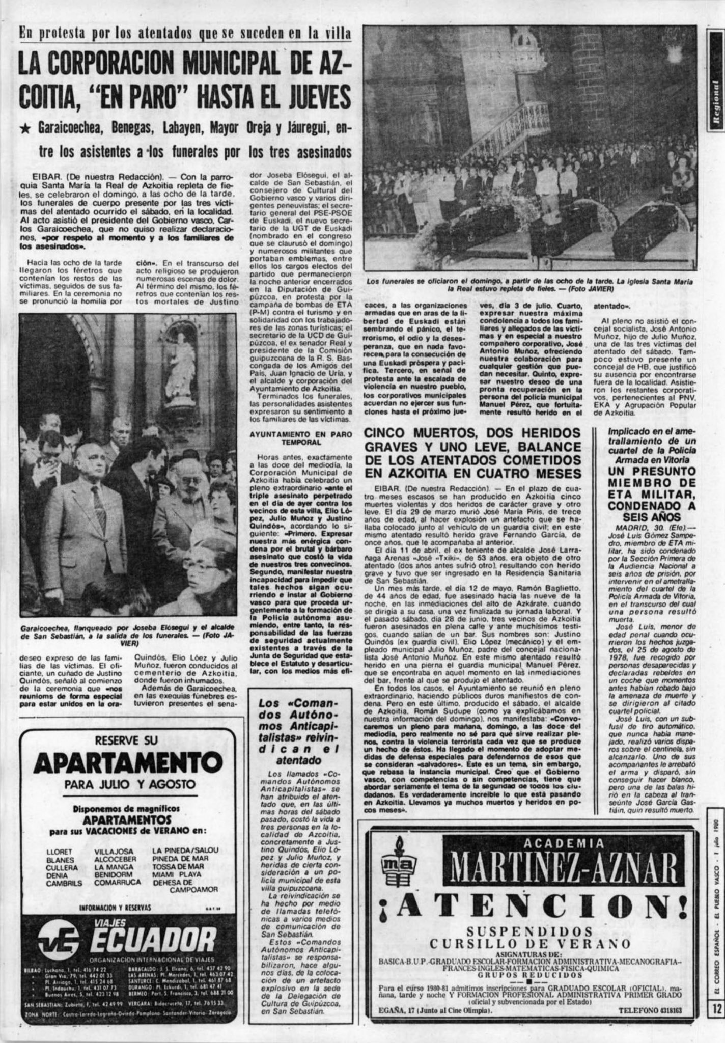 JULIO MUÑOZ GRAU asesinado el 28 de junio de 1980 en Azcoitia