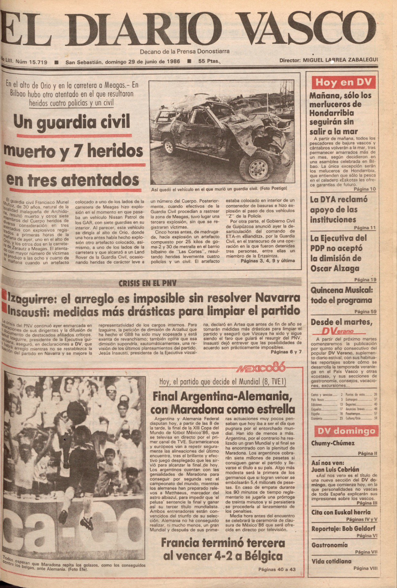 El 28 de junio de 1986, la banda terrorista ETA asesinó en Zarauz (Guipúzcoa) al guardia civil FRANCISCO MURIEL MUÑOZ, e hirió a varias personas más, todas ellas miembros de las fuerzas de seguridad del Estado, salvo un civil. Hacia las 8:30 horas,en un dispositivo de rastreo por parte de los Grupos Antiterroristas Rurales (GAR), que se desplazaron por la misma carretera que une Orio con Zaráuz hasta el Alto de Meagas, ya en el término municipal de esta segunda localidad. En ese momento, una bomba de considerable potencia alcanzaba de lleno a la furgoneta Nissan en la que viajaban los siete guardias civiles. Francisco Muriel Muñoz falleció prácticamente en el acto y cinco de sus compañeros quedaron gravemente heridos, con los cuerpos doblados y atrapados entre el amasijo de chatarra en que quedó convertida la furgoneta blindada.