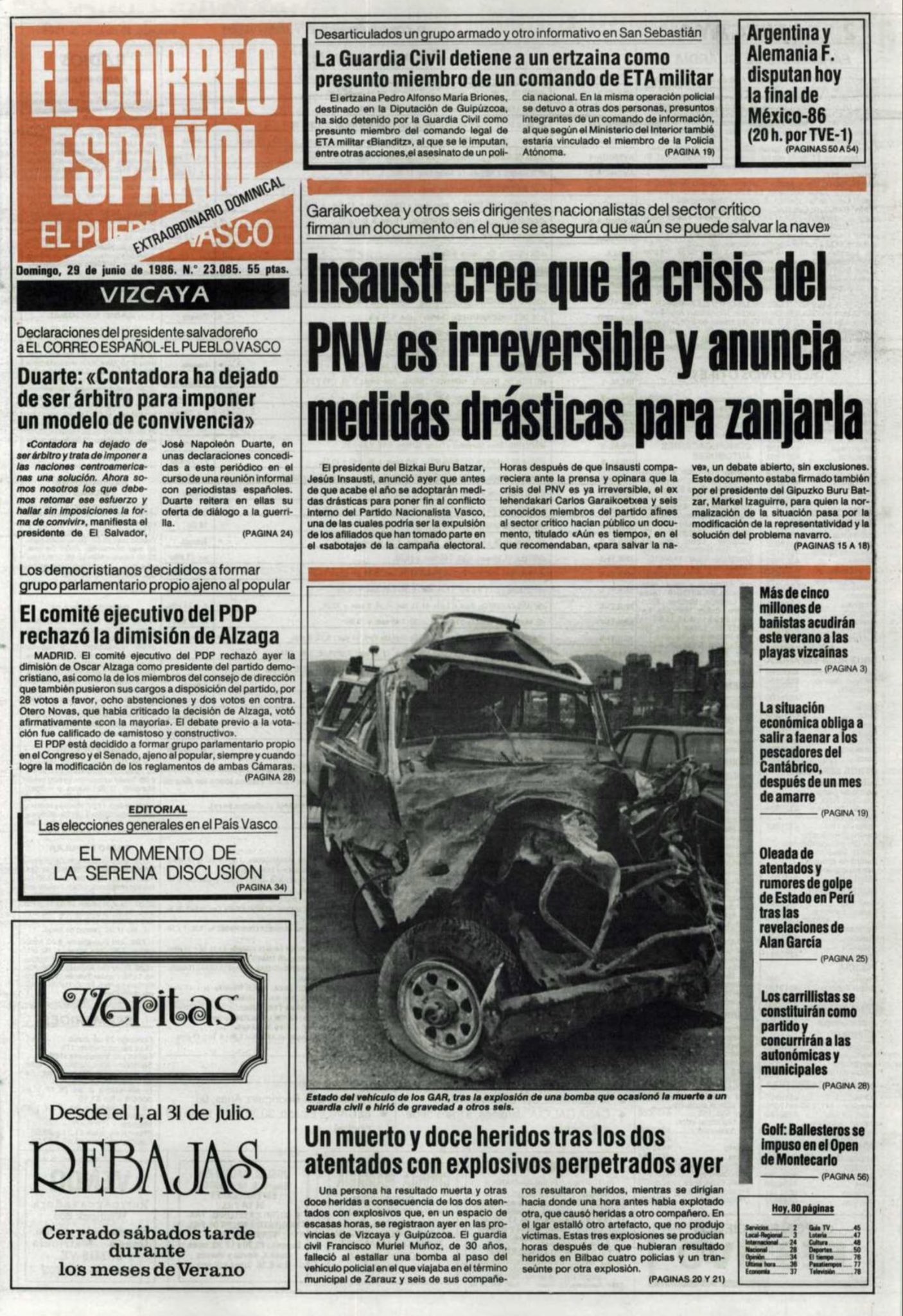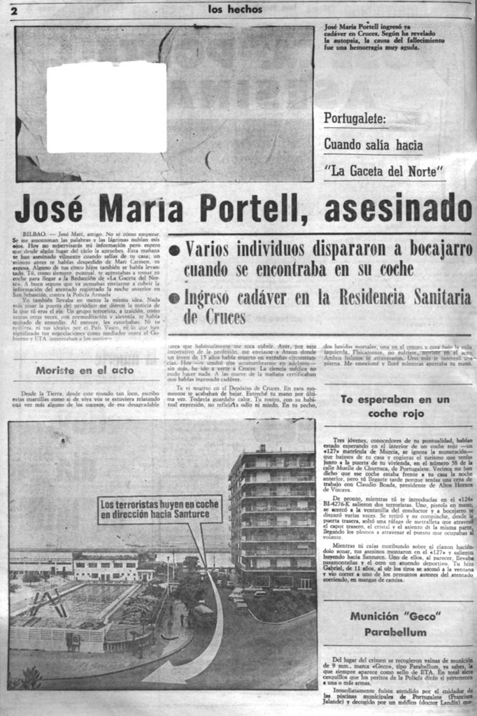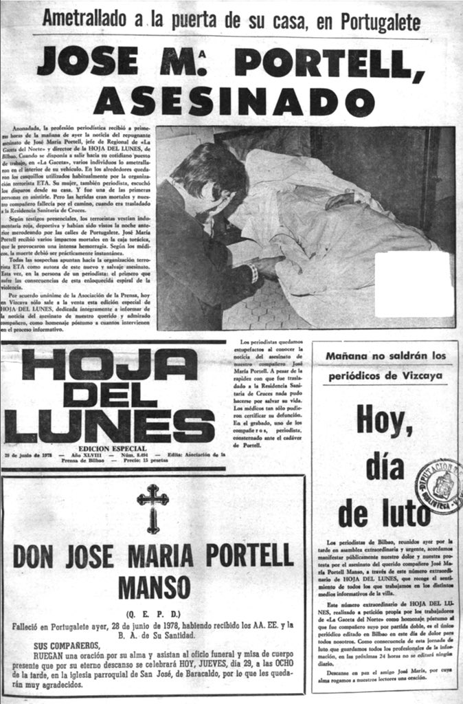 A las nueve menos cuarto de la mañana del 28 de junio de 1978, la banda terrorista ETA asesinaba a tiros en Portugalete (Vizcaya) al periodista JOSÉ MARÍA PORTELL MANSO, Dos etarras le dispararon varios tiros de pistola a bocajarro cuando se disponía a arrancar su coche, aparcado frente a su casa de la calle Muelle de Churruca.