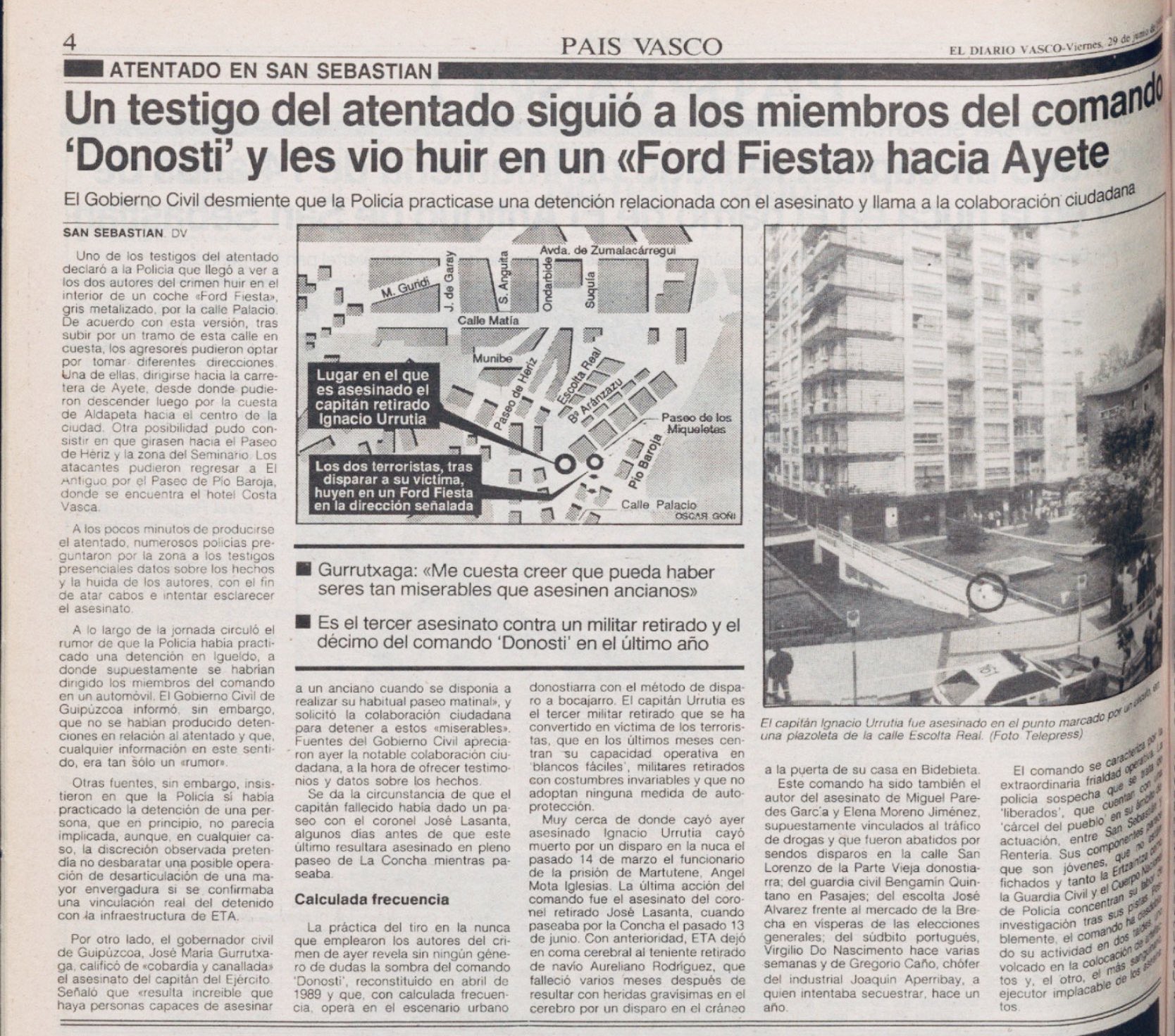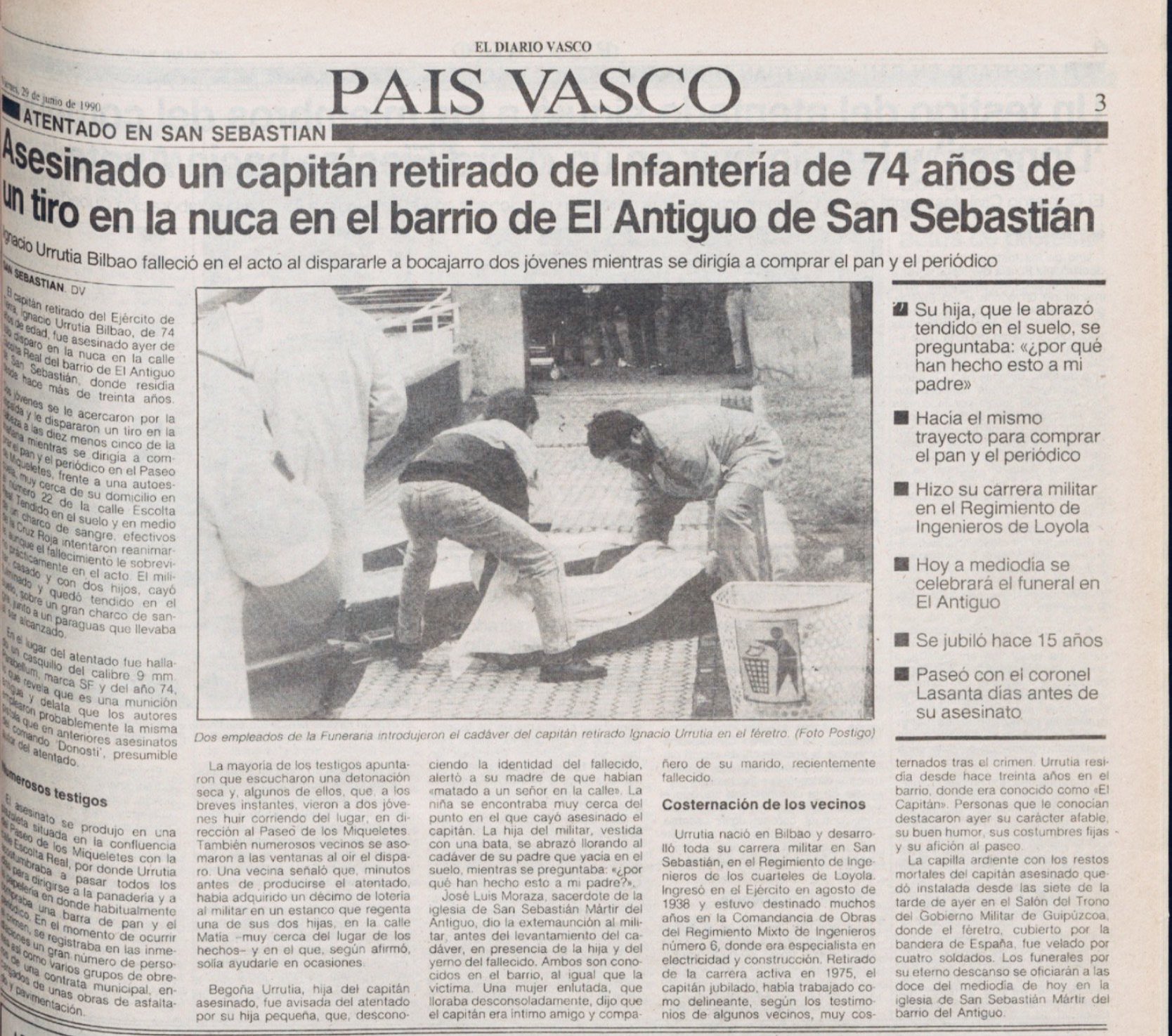 El 28 de junio de 1990 miembros de la banda terrorista ETA asestaron un tiro en la nuca al capitán del Ejército de Tierra retirado IGNACIO URRUTIA BILBAO. El atentado se produjo poco antes de las diez de la mañana en el barrio del Antiguo de San Sebastián y el militar murió en el acto. Urrutia acababa de abandonar su domicilio y fue abordado por dos terroristas en la confluencia de la calle Escolta Real y el paseo de los Mikeletes. Tras dispararle, los asesinos huyeron por el paseo de Pío Baroja.