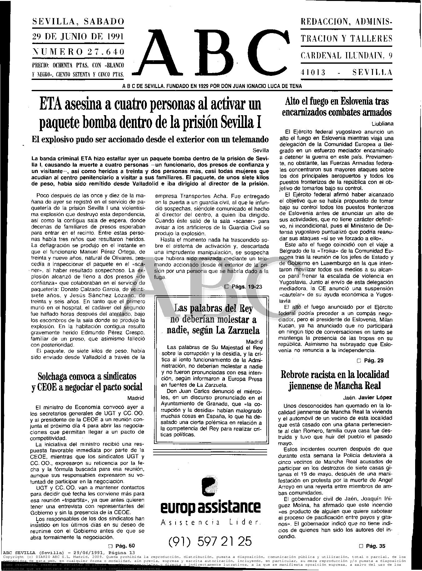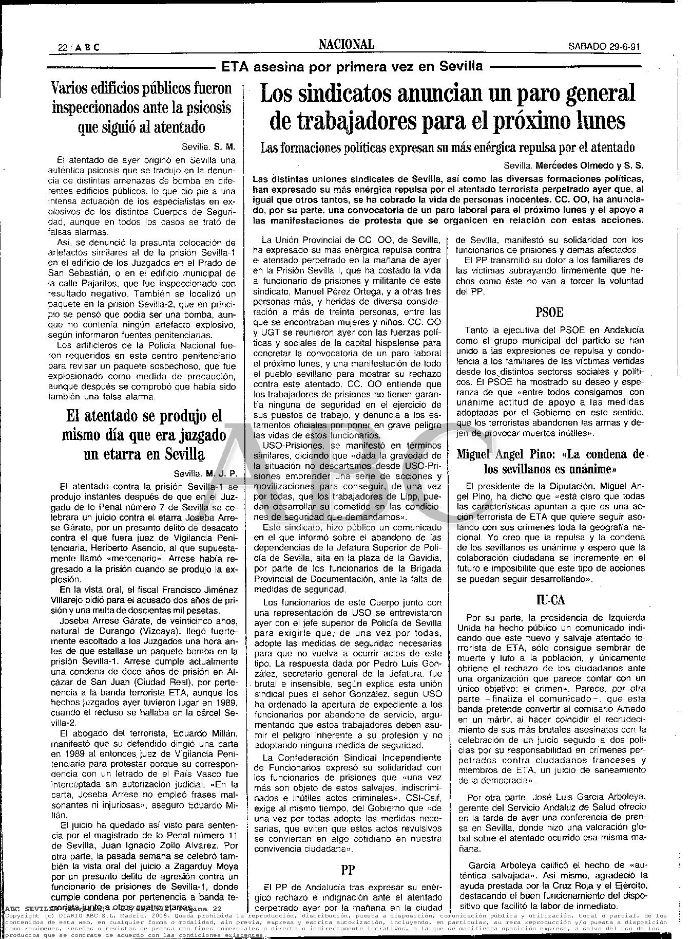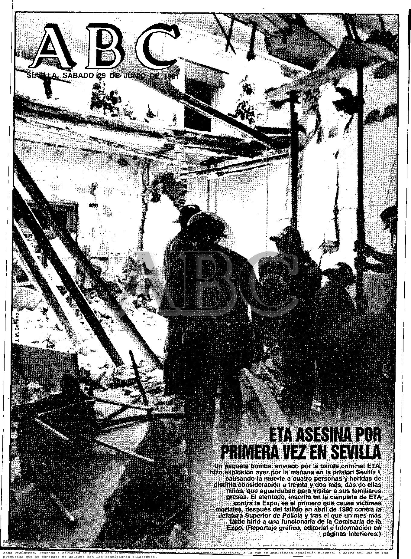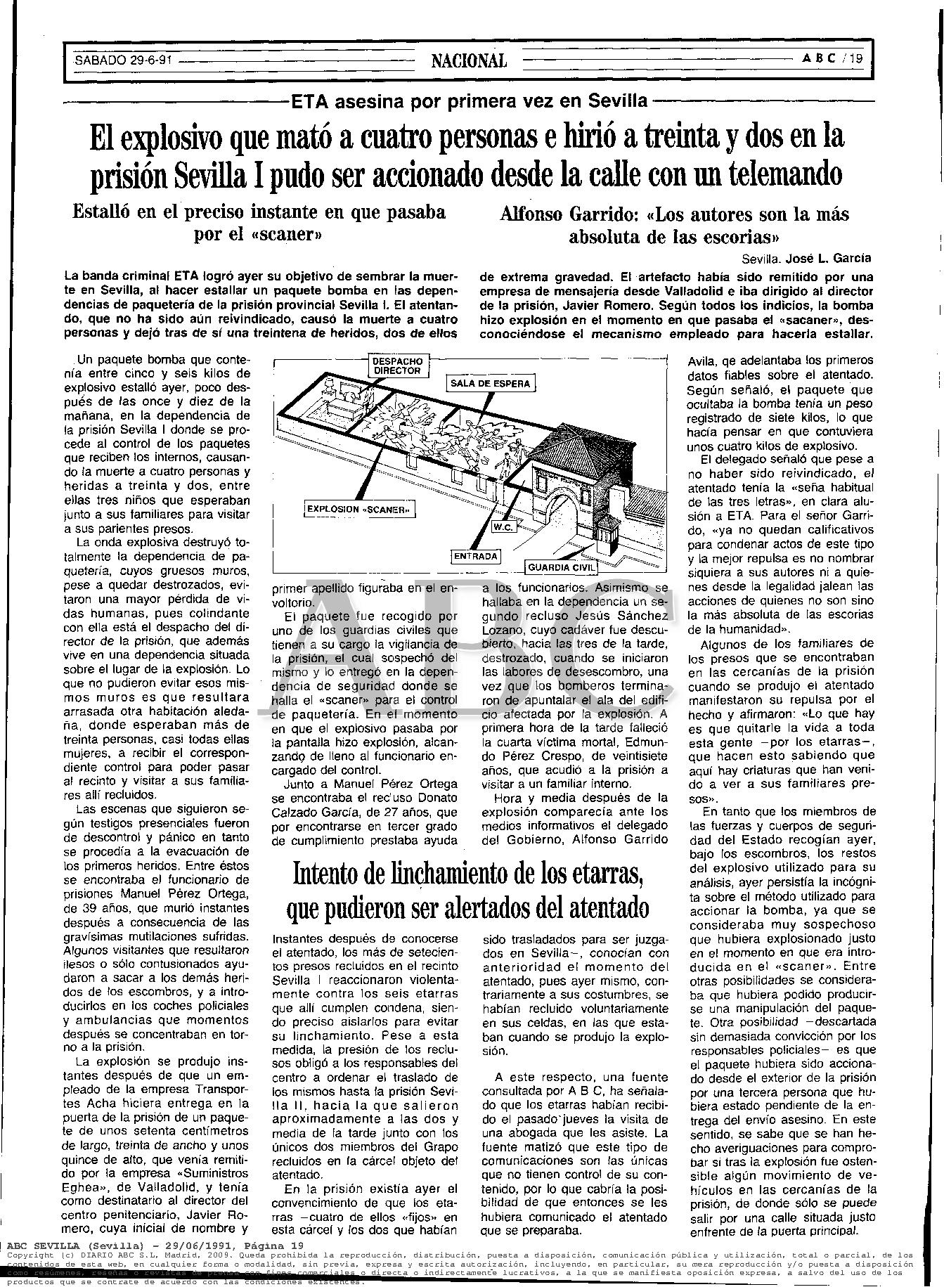 A las 11:20 horas del jueves 28 de junio de 1991, un paquete-bomba enviado por la banda terrorista ETA causaba la muerte en la cárcel de Sevilla-1 a cuatro personas: el funcionario de prisiones MANUEL PÉREZ ORTEGA; los reclusos JESÚS SÁNCHEZ LOZANO y DONATO CALZADO GARCÍA; y un familiar que había ido a visitar a otro interno en la prisión, RAIMUNDO PÉREZ CRESPO. La explosión, que destrozó varias salas del centro penitenciario, hirió a otras treinta personas, cuatro de las cuales fueron hospitalizadas en estado grave.