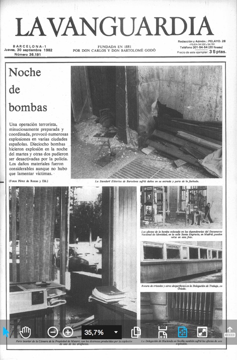 La madrugada del 29 de septiembre de 1982, los Grupos Revolucionarios Antifacistas Primero de Octubre (GRAPO) perpetraron una cadena de ataques terroristas en numerosas ciudades de España. Entre la una y las cinco de la madrugada, una veintena de artefactos explosivos de escasa potencia estallaron en localidades como Barcelona, Mataró, Valencia, Sevilla, Córdoba, Vigo y Oviedo, una lista que no se amplió gracias a los trabajos de los artificieros, que desactivaron artefactos en ciudades como Madrid. La mayoría estaban colocados en oficinas de la Administración y en empresas hidroeléctricas, y provocaron escasos daños materiales.