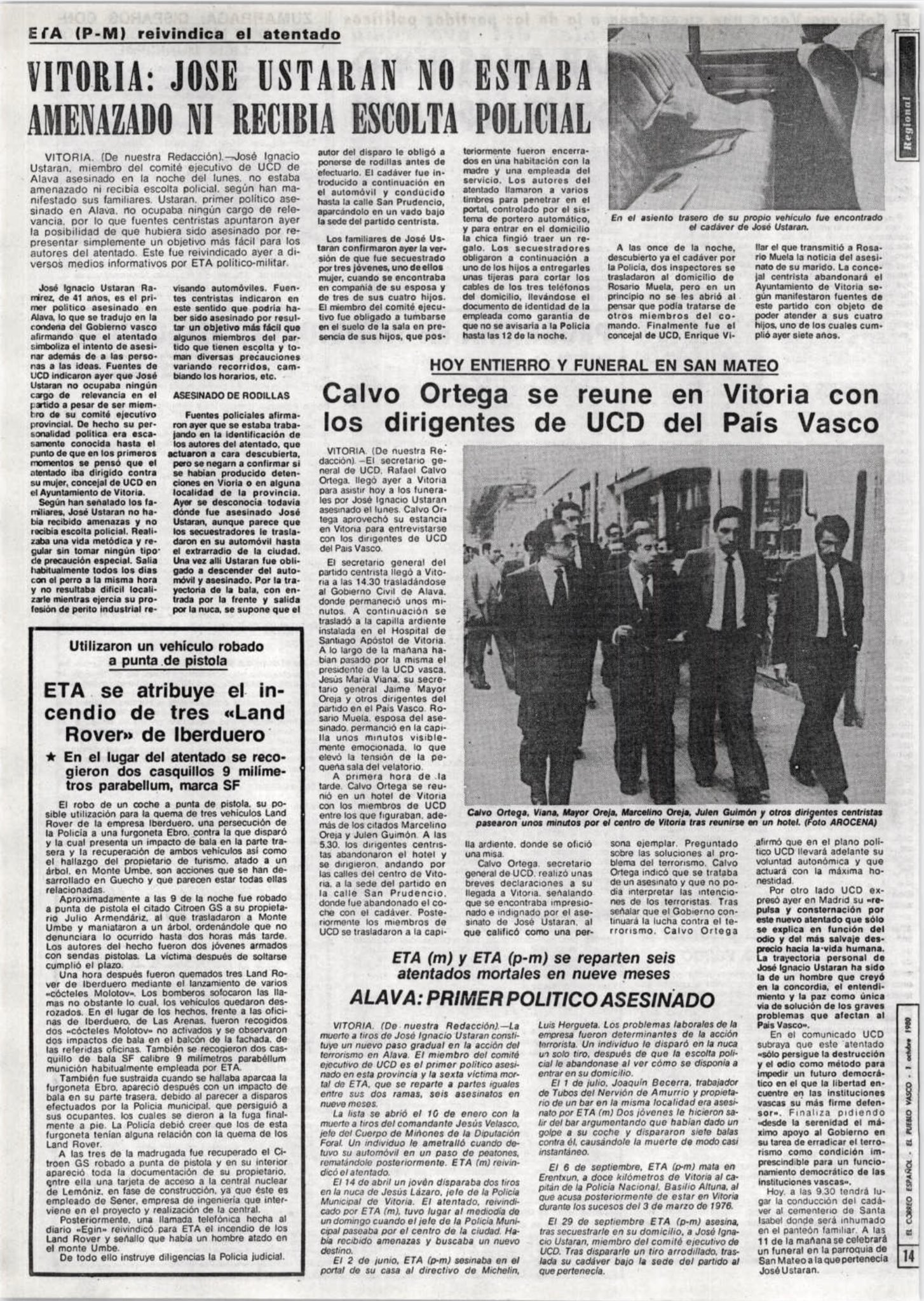 La noche del 29 de septiembre de 1980 la banda terrorista ETA secuestraba y asesinaba de dos tiros a JOSÉ IGNACIO USTARÁN RAMÍREZ, militante y miembro de la ejecutiva de Unión de Centro Democrático (UCD), y casado con Rosario Muela, concejala del mismo partido en el Ayuntamiento de Vitoria. Su cadáver apareció hacia las 22:30 horas en el asiento de su vehículo apenas hora y media después de que hubiese sido sacado por la fuerza de su domicilio.