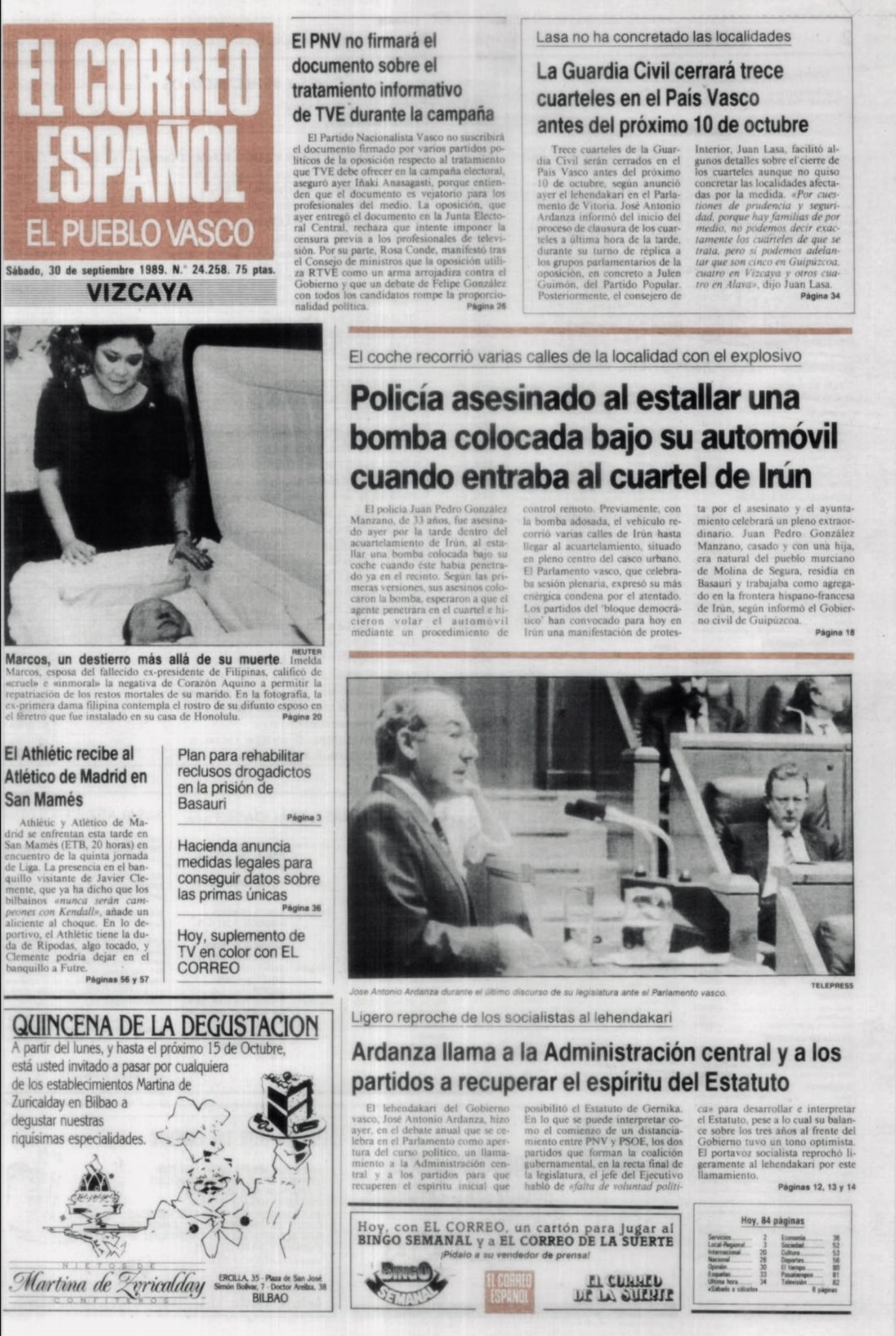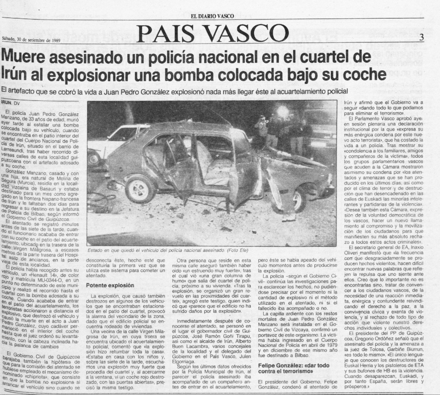 Minutos antes de las siete de la tarde del día 29 de septiembre de 1989 la banda terrorista ETA asesinaba en Irún (Guipúzcoa) al policía nacional JUAN PEDRO GONZÁLEZ MANZANO mediante una bomba colocada debajo del asiento del conductor de su coche particular. La bomba había hecho explosión cuando el funcionario policial entraba con su coche en el cuartel del Cuerpo Nacional de Policía de Irún, junto al antiguo hospital asilo en la parte vieja de la ciudad, y se disponía a aparcar el vehículo en el patio del acuartelamiento. Juan Pedro falleció en el acto.