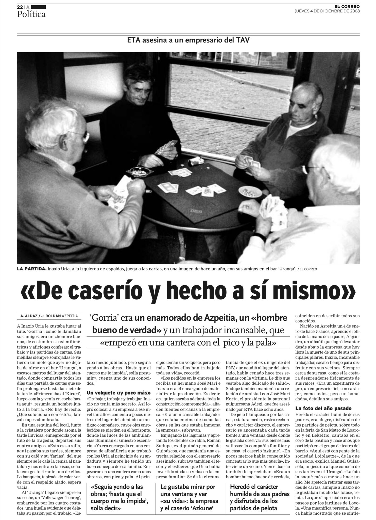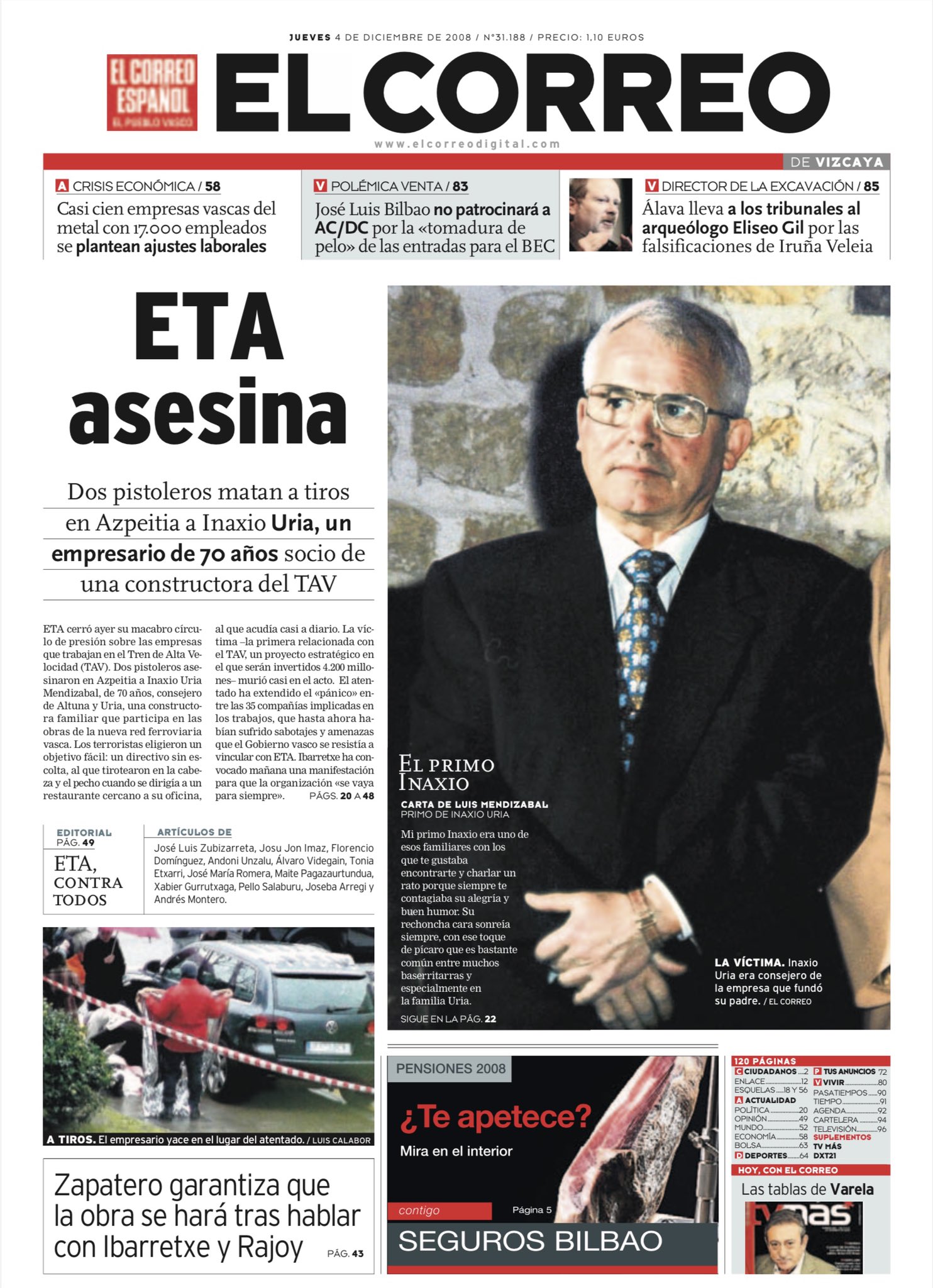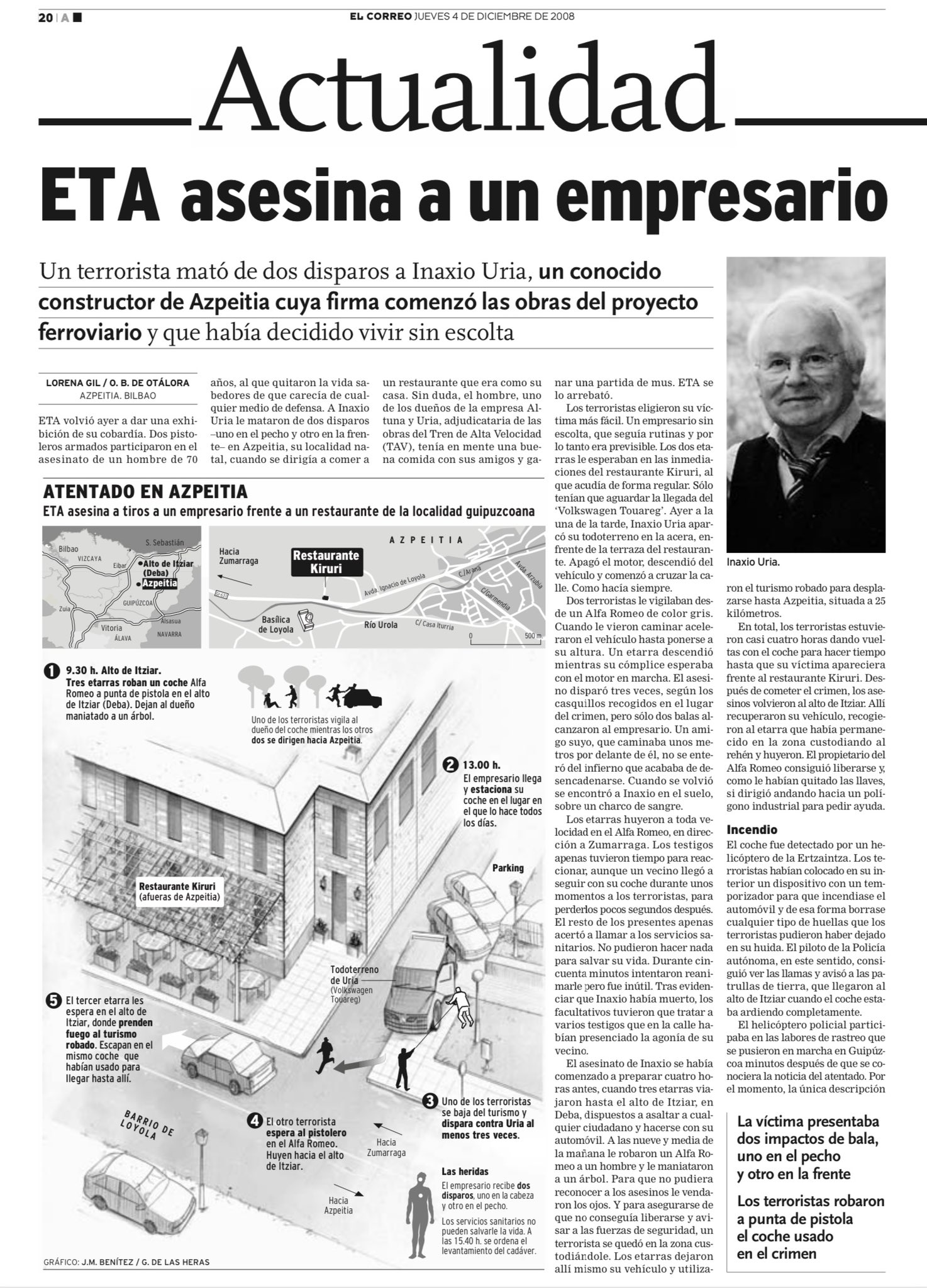 El 3 de diciembre de 2008 la banda terrorista ETA asesinaba a tiros en Azpeitia (Guipúzcoa) al empresario de la construcción IGNACIO URÍA MENDIZÁBAL. La víctima se dirigía a la cafetería donde diariamente jugaba al tute con sus amigos. Nada más aparcar su vehículo en las inmediaciones de la misma, dos terroristas lo acribillaron a balazos.