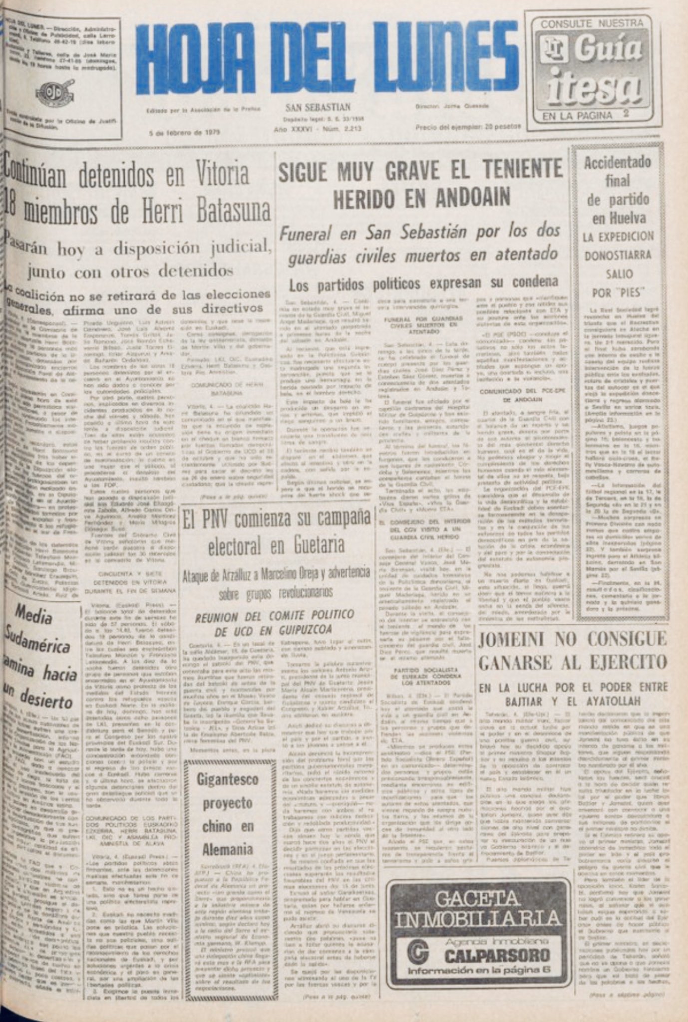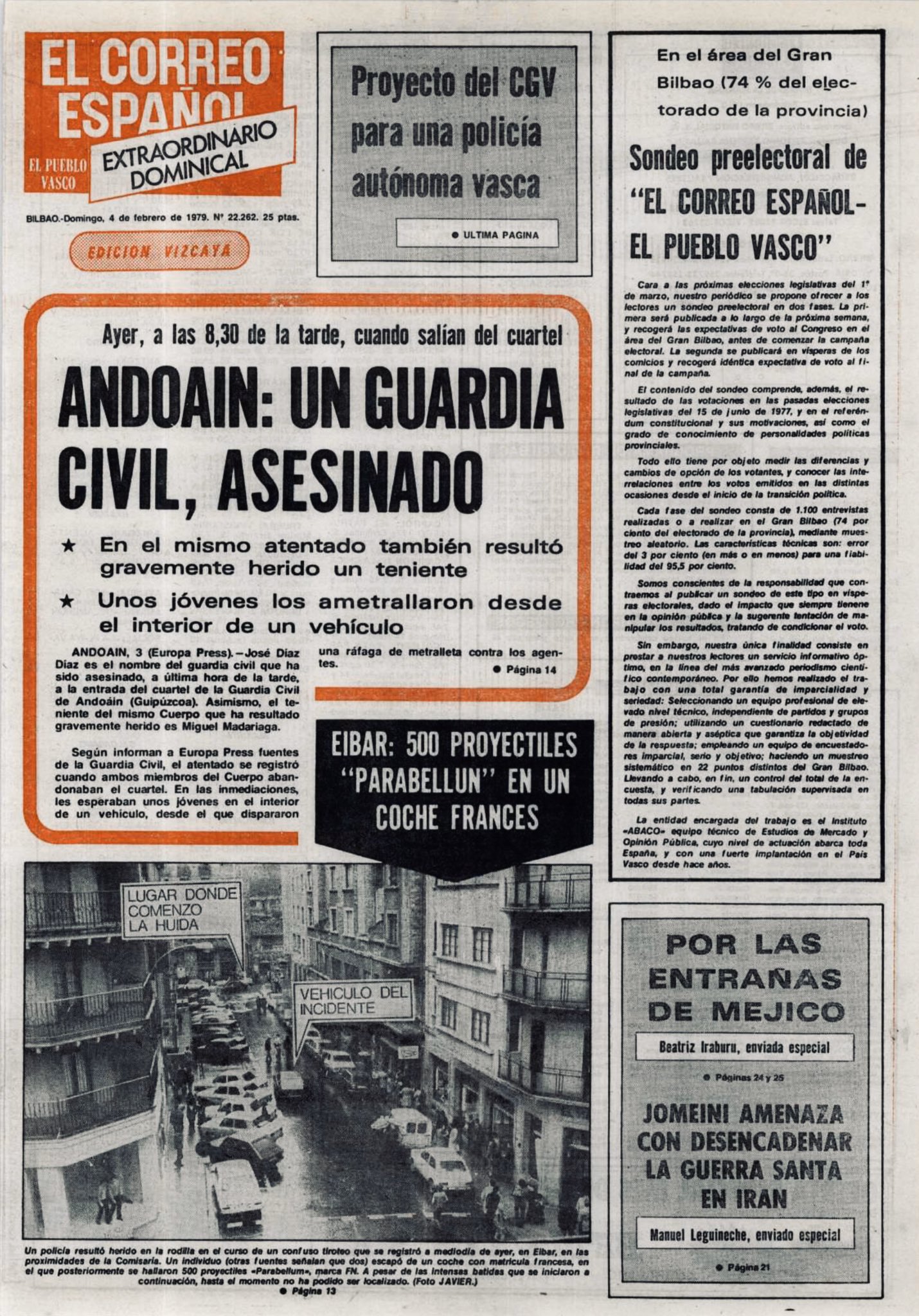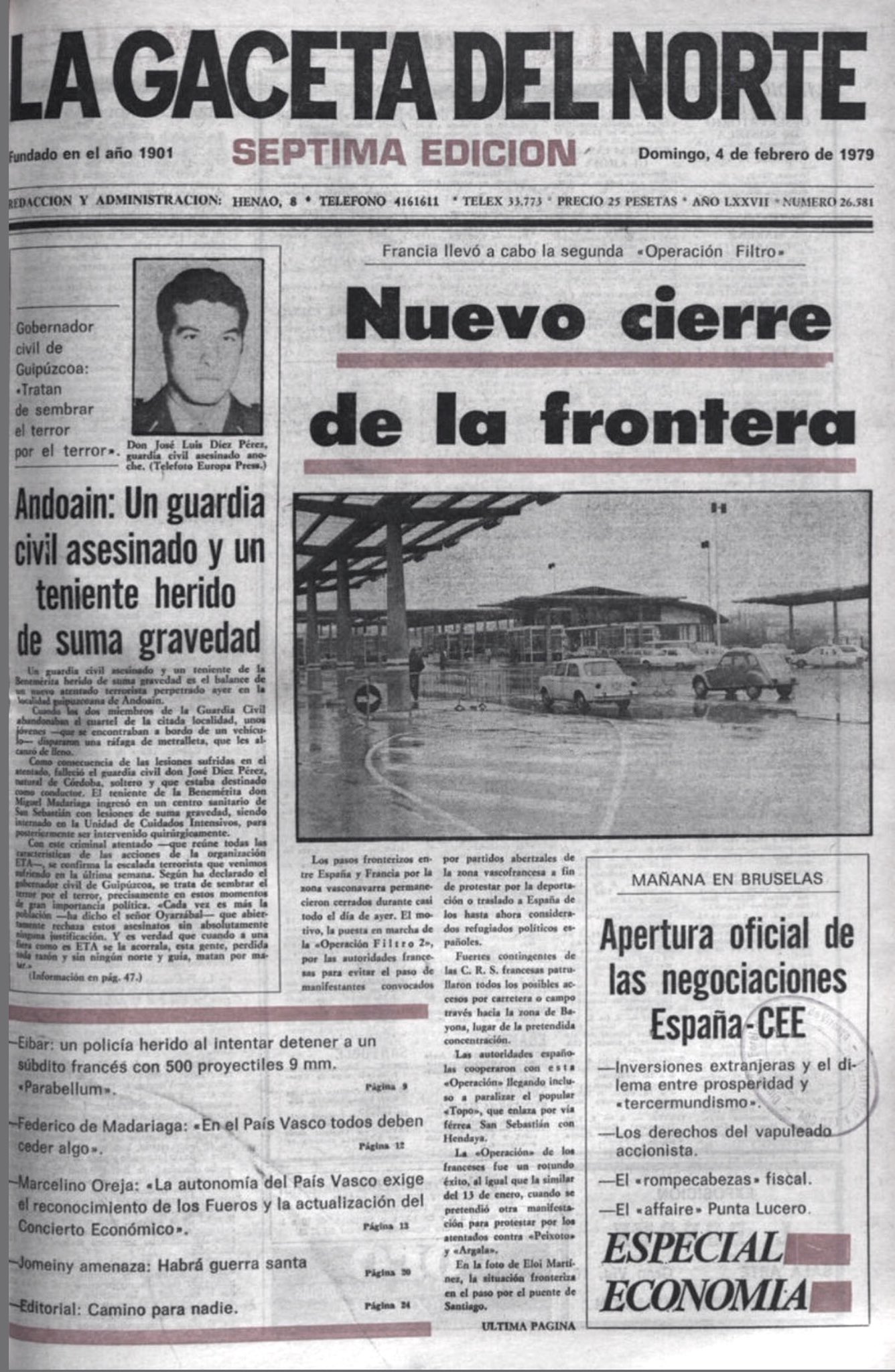 El 3 de febrero de 1979 la banda terrorista ETA asesina en Andoain (Guipúzcoa) al guardia civil JOSÉ DÍAZ PÉREZ. En el atentado resultaron heridos de gravedad sus compañeros Miguel Madariaga Lope y Antonio Piqueras.