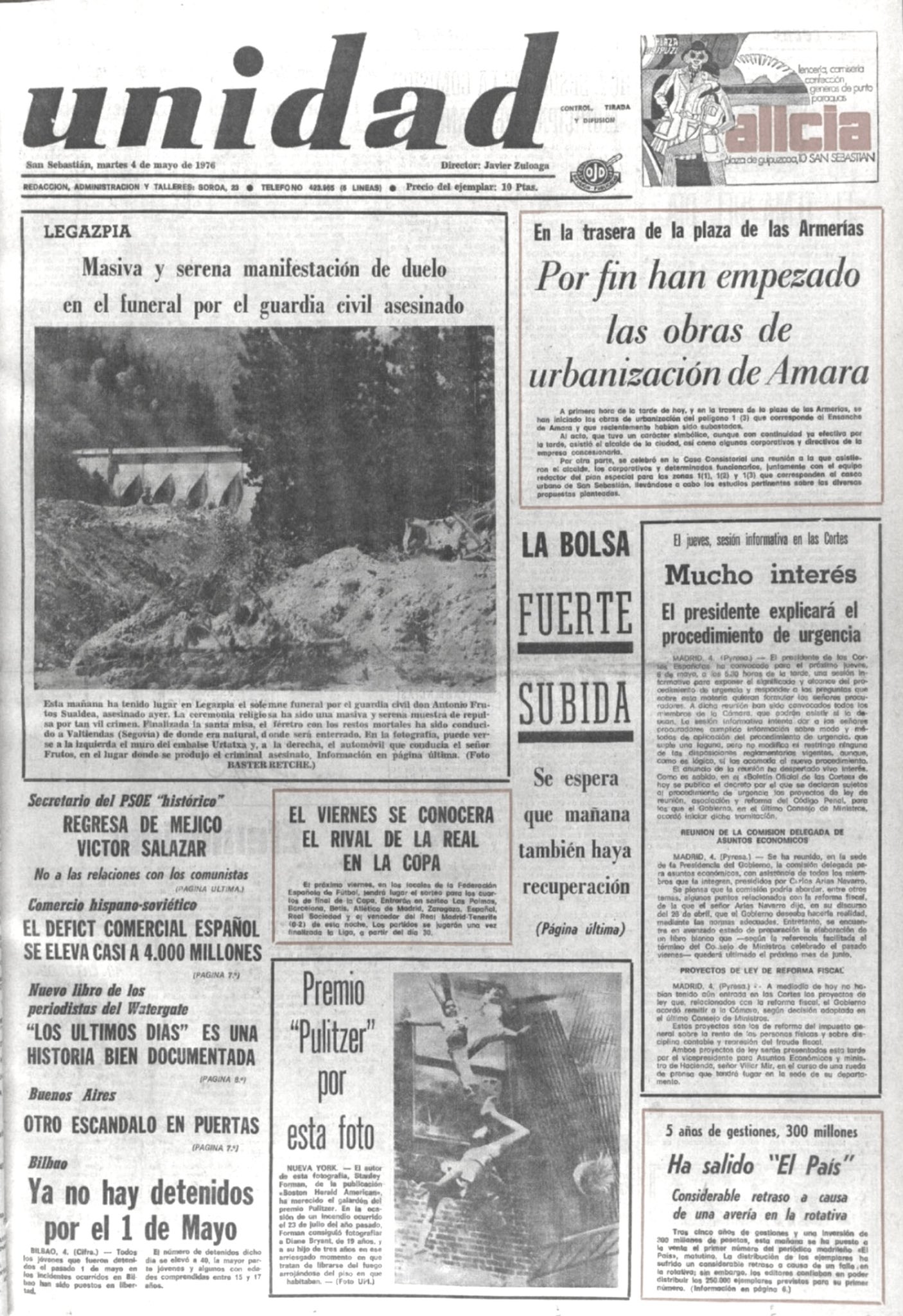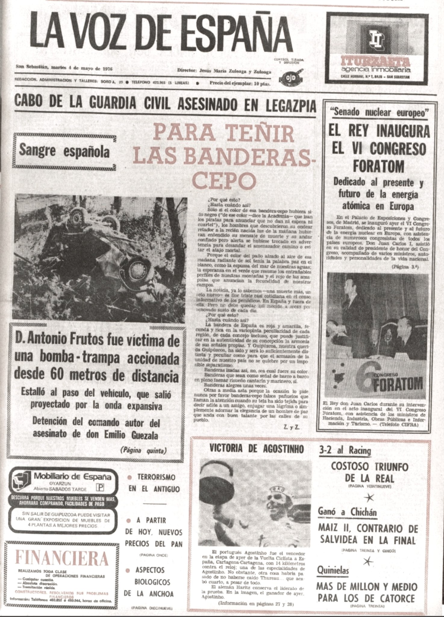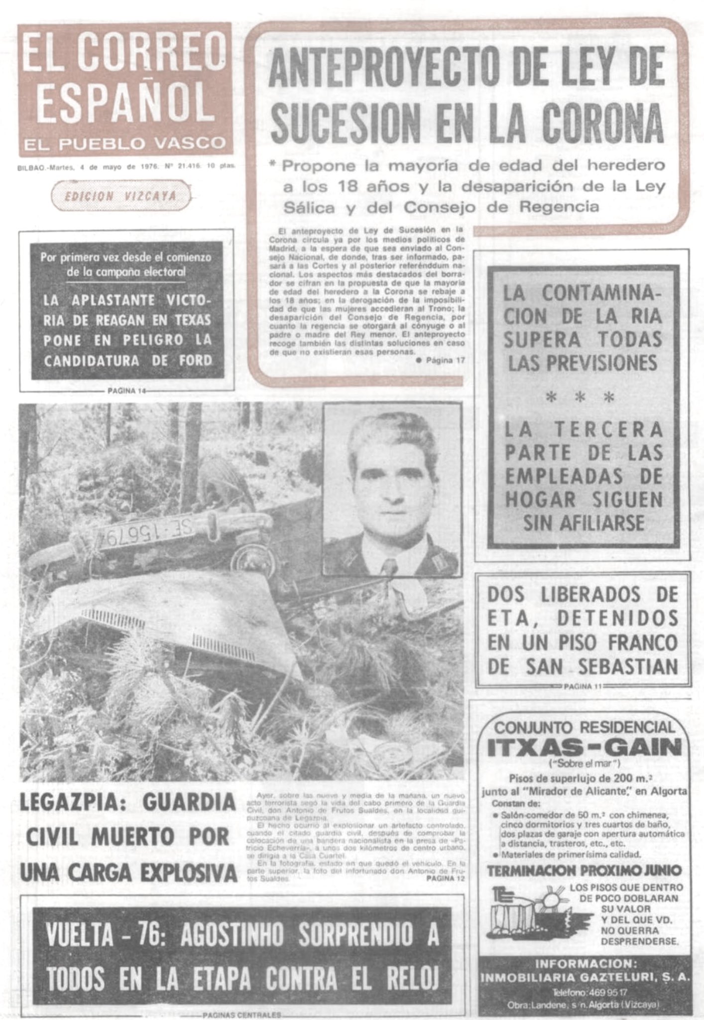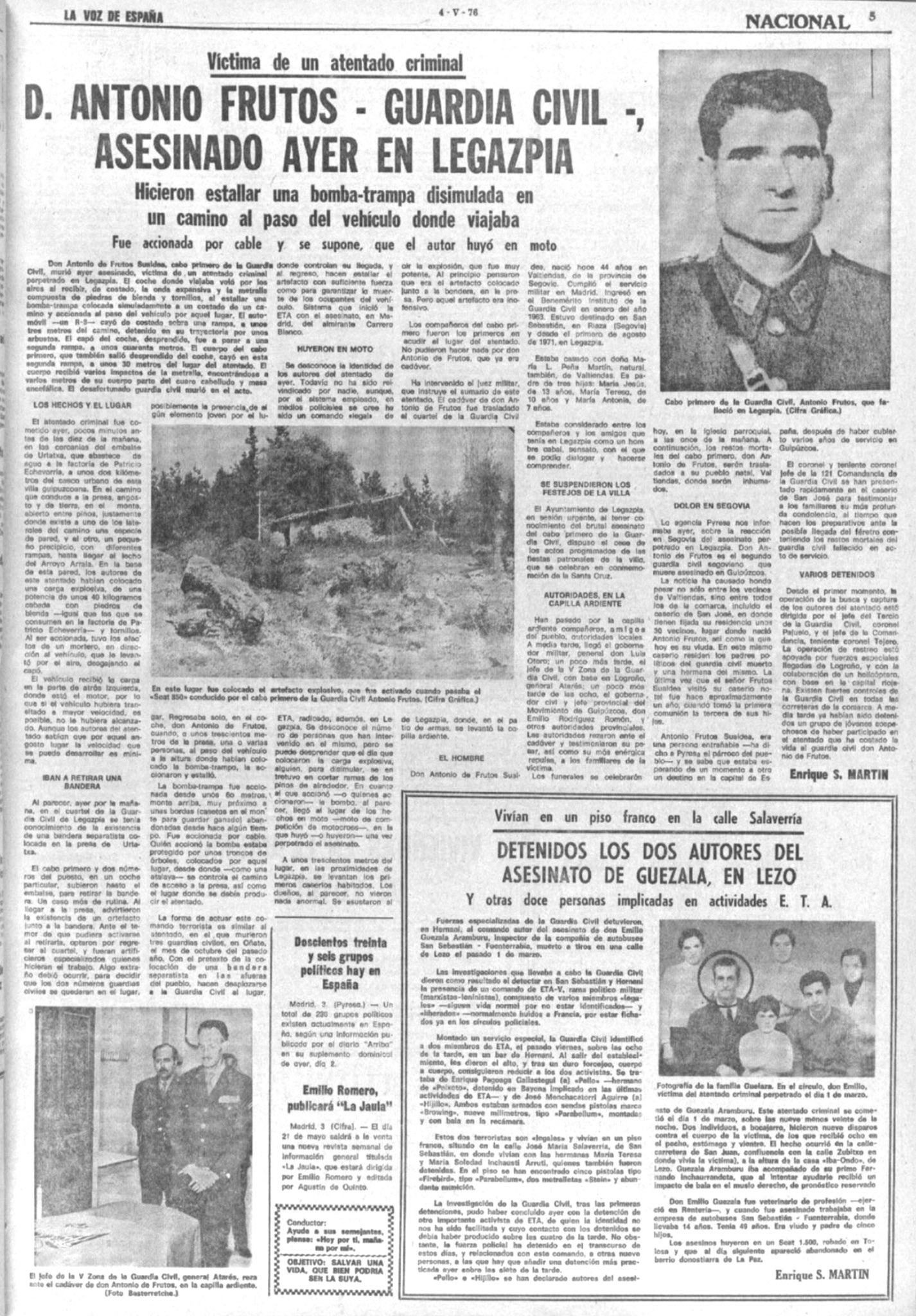 A las nueve y media de la mañana del lunes 3 de mayo de 1976 el cabo primero de la Guardia Civil ANTONIO DE FRUTOS SUALDEAfallecía en Legazpia (Guipúzcoa) como consecuencia de las heridas provocadas por la explosión de un artefacto que alcanzó de lleno al vehículo en el que viajaba. La ejecución del atentado incluyó la utilización, por parte de la banda terrorista, de una ikurriña como cebo.