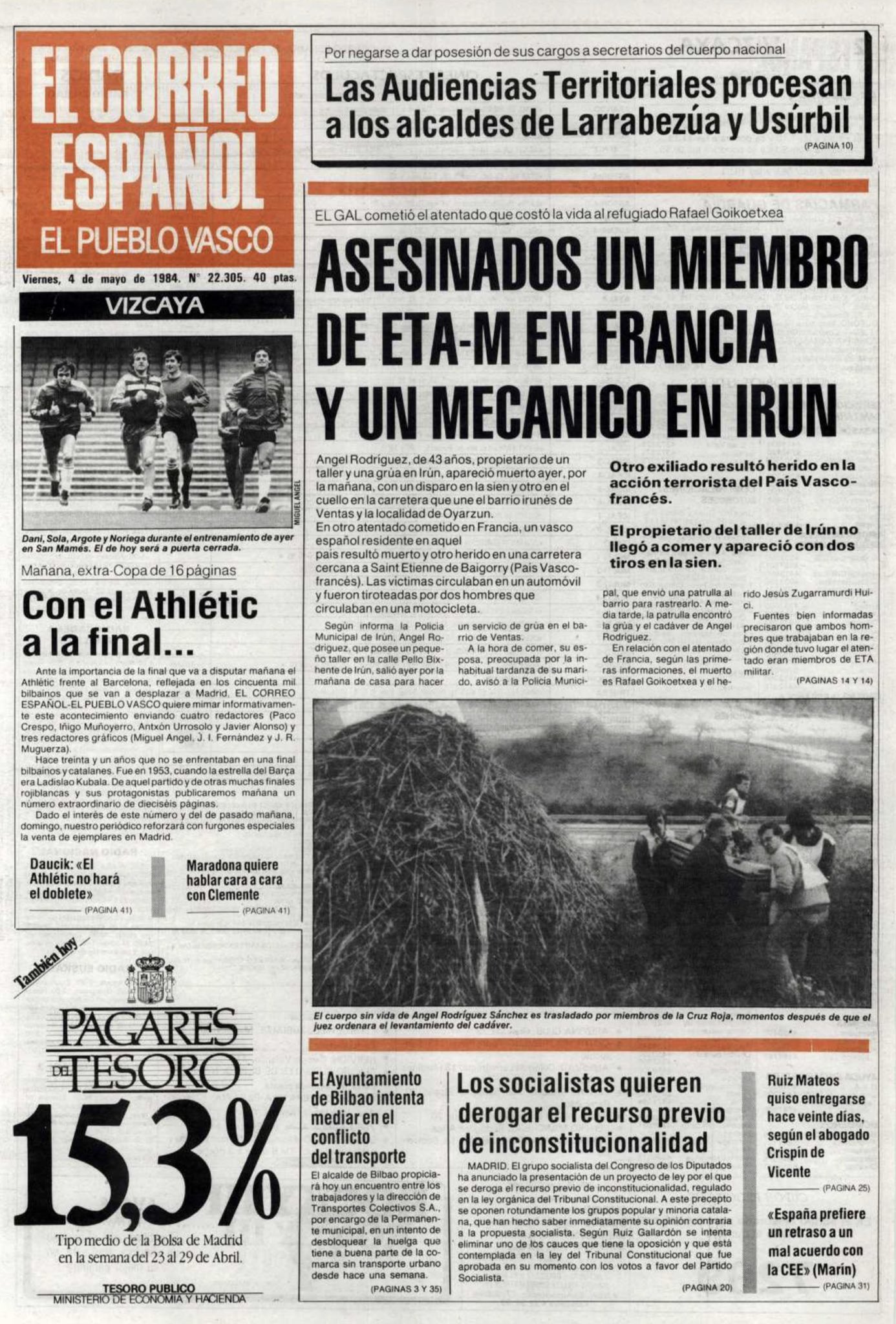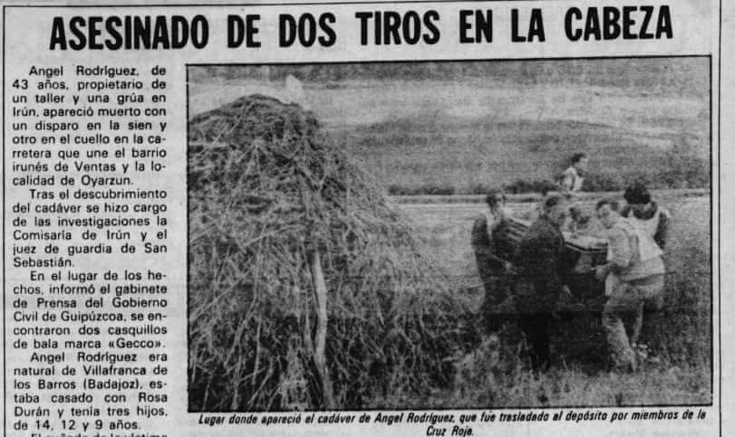 El 3 de mayo de 1984 ETA asesinaba en Oyarzun al mecánico ÁNGEL RODRÍGUEZ SÁNCHEZ. Su cadáver fue localizado, minutos después de las cuatro de la tarde, con dos tiros en la cabeza en una pista cercana a la carretera que conduce a la localidad.