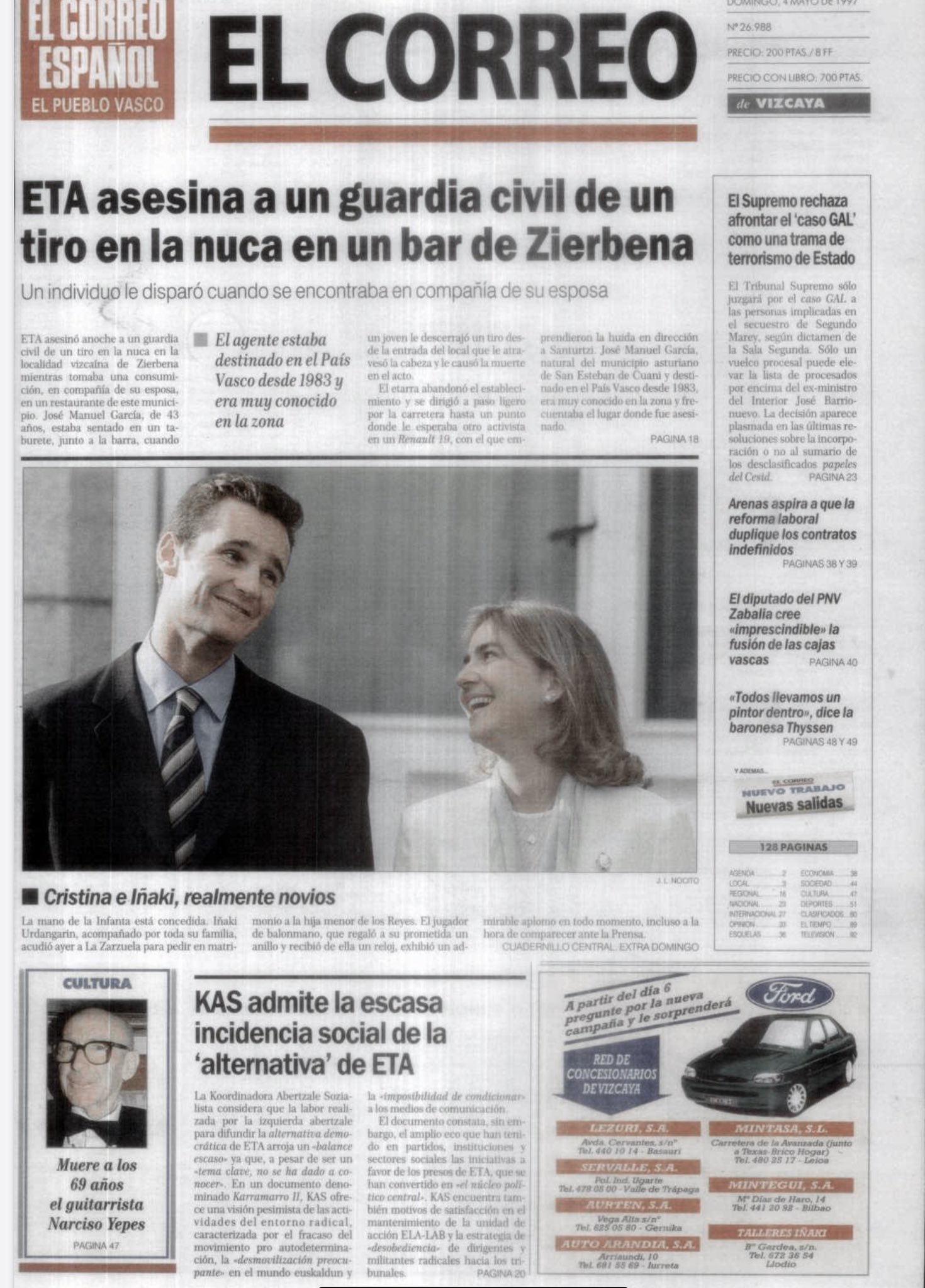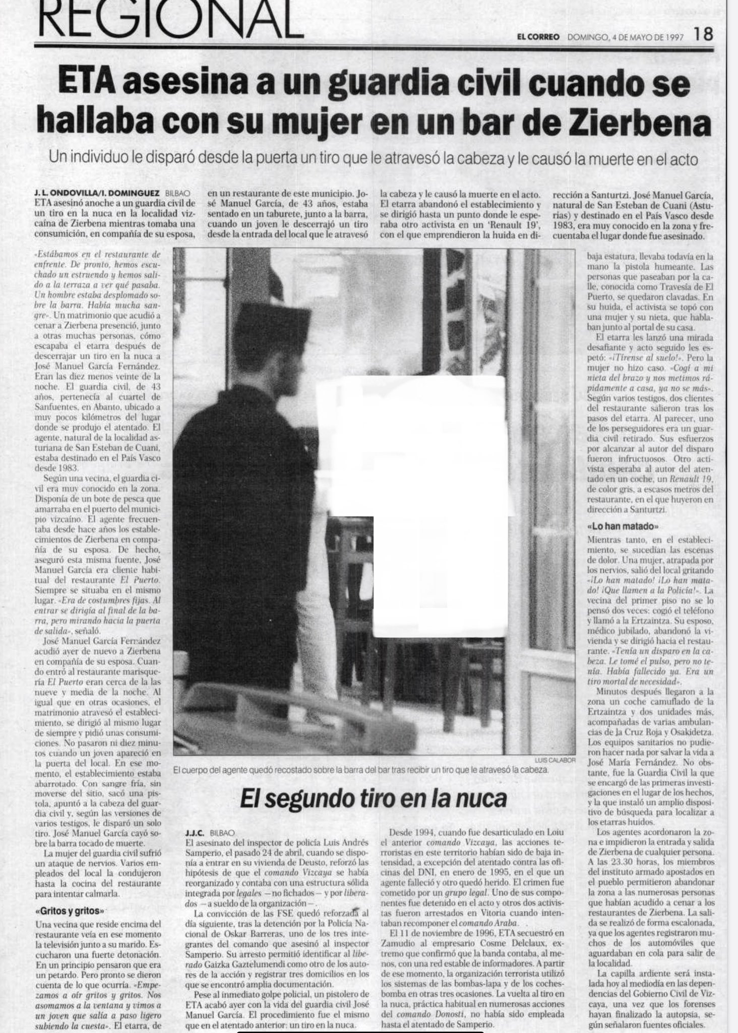A las 21:40 horas del sábado 3 de mayo de 1997 un terrorista entró a cara descubierta en la Marisquería El Puerto, en Ciérvana (Vizcaya), a 20 kilómetros de Bilbao. Tras gritar «¡Al suelo!» disparó un tiro en la nuca del guardia civil JOSÉ MANUEL GARCÍA FERNÁNDEZ, que en ese momento tomaba unas tapas en compañía de su esposa en la barra del restaurante.
