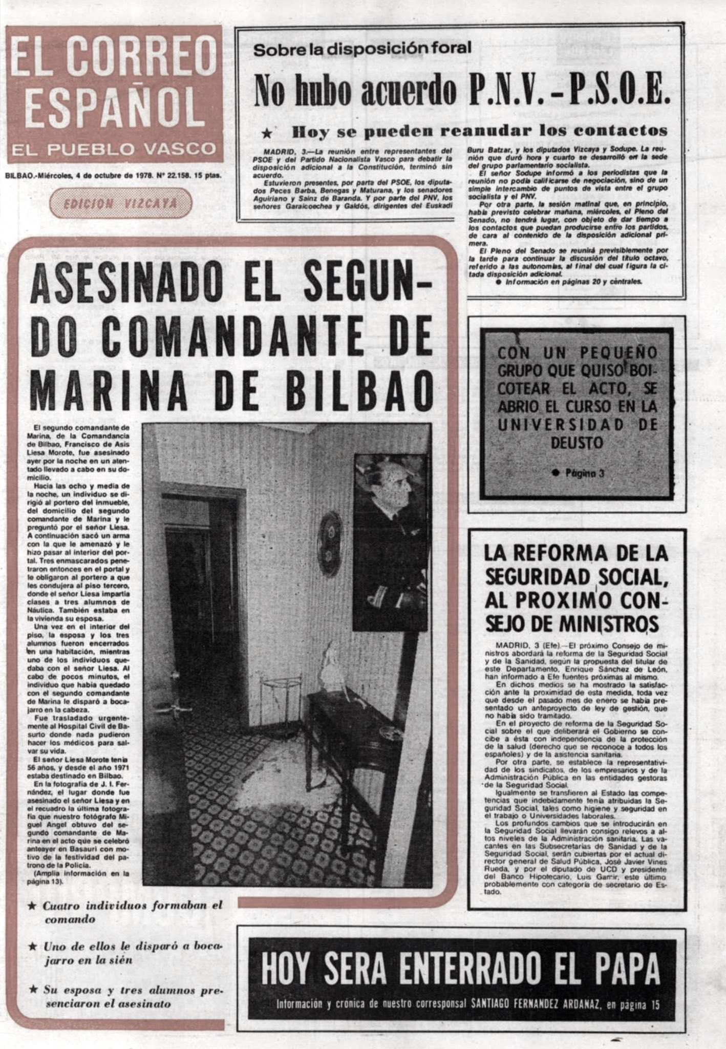 El 3 de octubre de 1978 la banda terrorista ETA asesinaba en Bilbao al segundo jefe de la Comandancia de Marina de Bilbao, el capitán de corbeta FRANCISCO DE ASÍS LIESA MOROTE, de un disparo en la sien en su domicilio en la calle Amadeo Deprit.