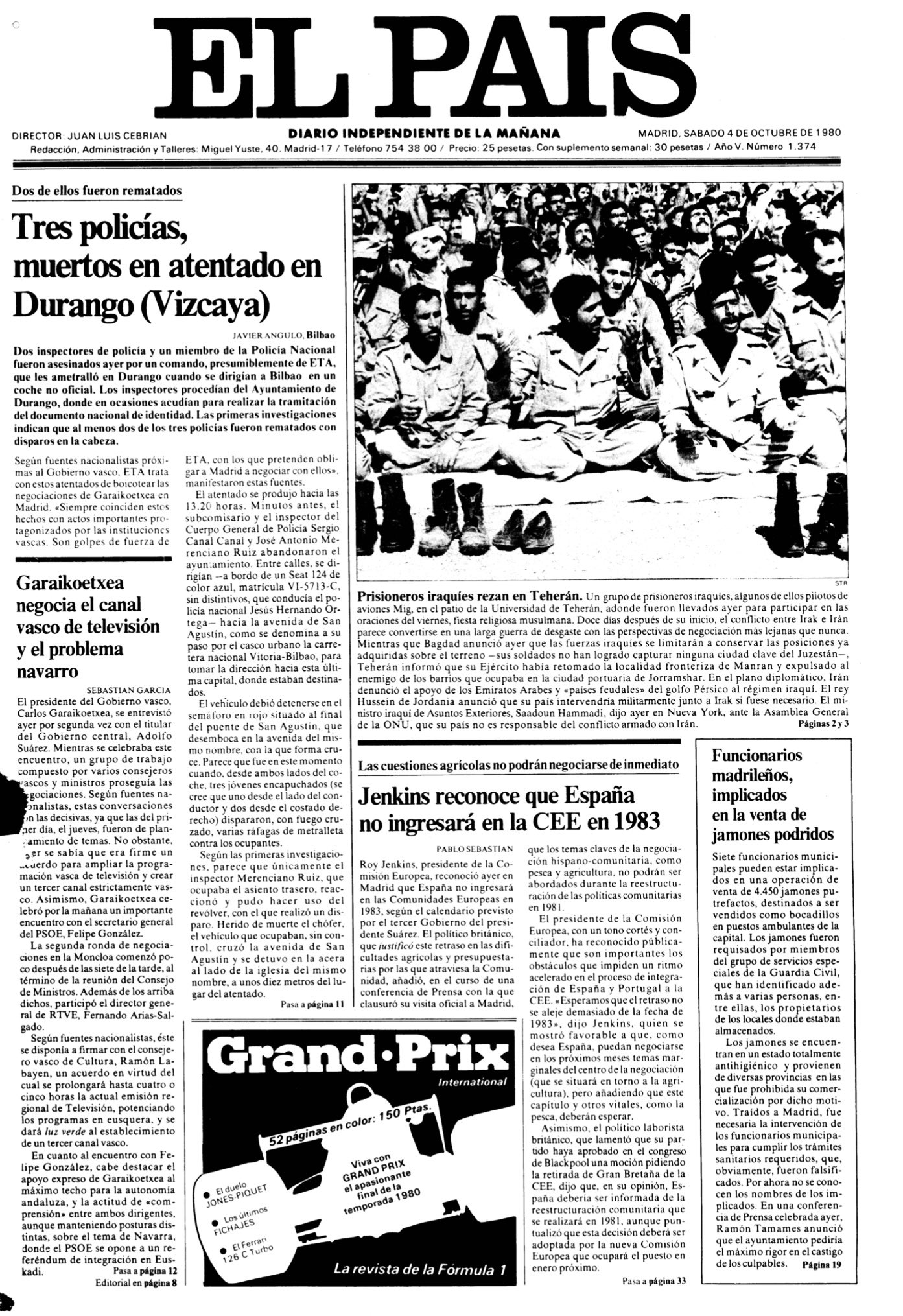 Hacia las 12:30 horas del 3 de octubre de 1980 la banda terrorista ETA ametrallaba en Durango (Vizcaya) un vehículo no oficial de la Policía matando a sus ocupantes: el subcomisario de Policía SERGIO CANAL CANAL, el policía nacional JESÚS HERNANDO ORTEGA, conductor del vehículo, y el inspector de Policía JOSÉ ANTONIO MERENCIANO RUIZ.