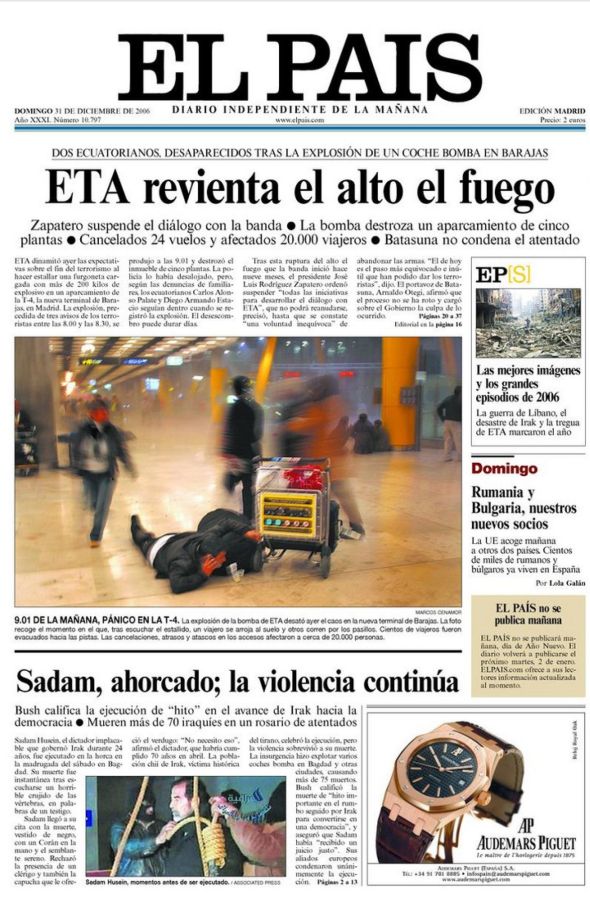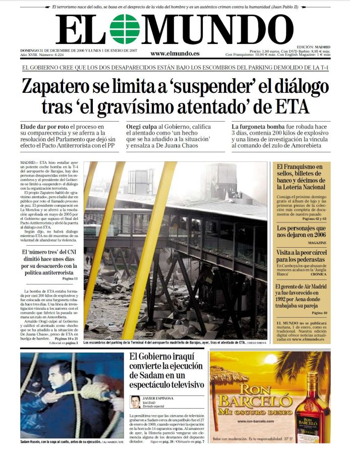 A las nueve de la mañana del sábado 30 de diciembre de 2006 la banda terrorista ETA hizo estallar una furgoneta-bomba en la terminal 4 (T-4) del aeropuerto de Barajas en Madrid. Según el auto de procesamiento de noviembre de 2008 la carga explosiva estaba compuesta por ciclonita, también conocida como exógeno o RDX, que constituye la base de explosivos de uso militar como C-4 o Semtex. La potente explosión destrozó prácticamente el módulo D del aparcamiento y mató a dos inmigrantes ecuatorianos, DIEGO ARMANDO ESTACIO SIVISAPA y CARLOS ALONSO PALATE SAILEMA, que se encontraban durmiendo dentro de sus respectivos vehículos esperando la llegada de familiares al aeropuerto.