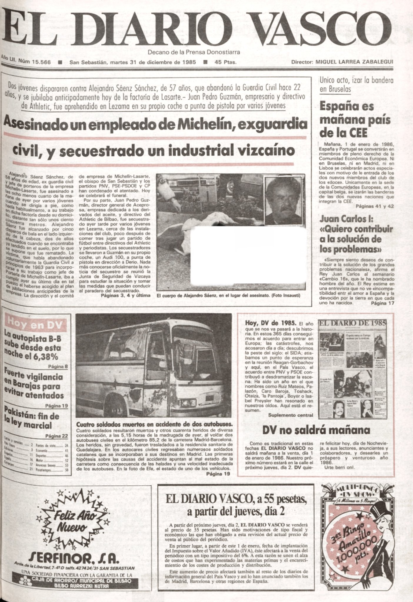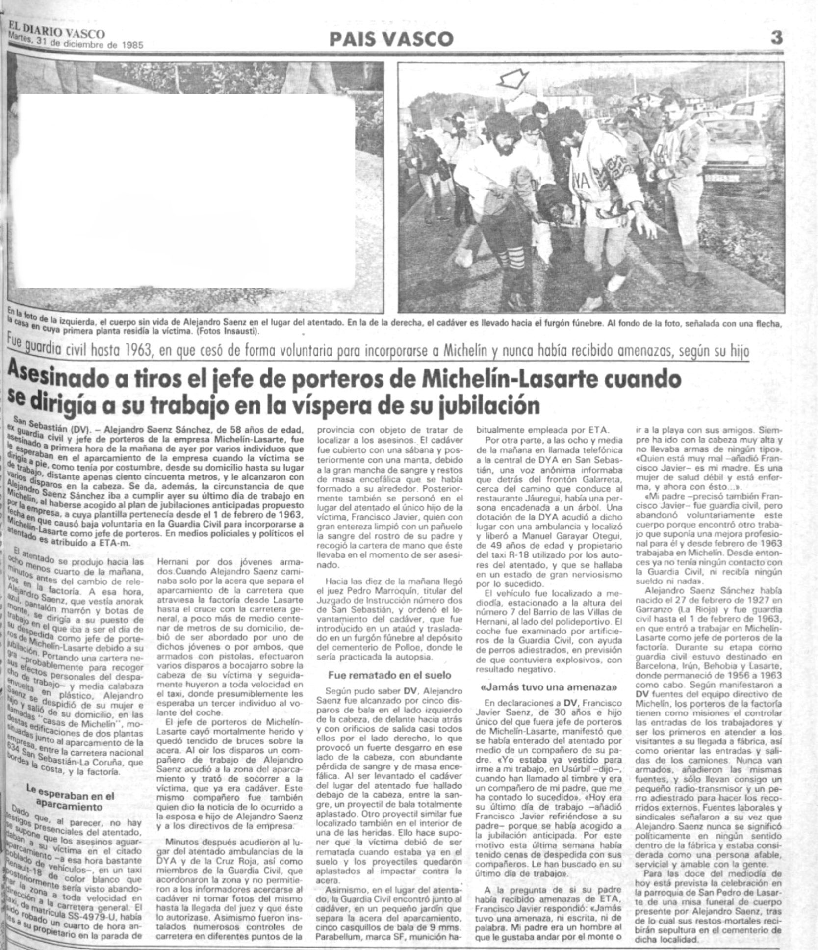 Minutos antes de las ocho de la mañana del 30 diciembre de 1985 la banda terrorista ETA asesinaba en Lasarte (Guipúzcoa), al ex guardia civil y jefe de vigilancia de la factoría Michelín de esa localidad ALEJANDRO SÁENZ SÁNCHEZ cuando se dirigía a pie a su trabajo en la que iba a ser su última jornada laboral tras haberse acogido, con otros noventa y tres empleados, a la propuesta de jubilación anticipada.