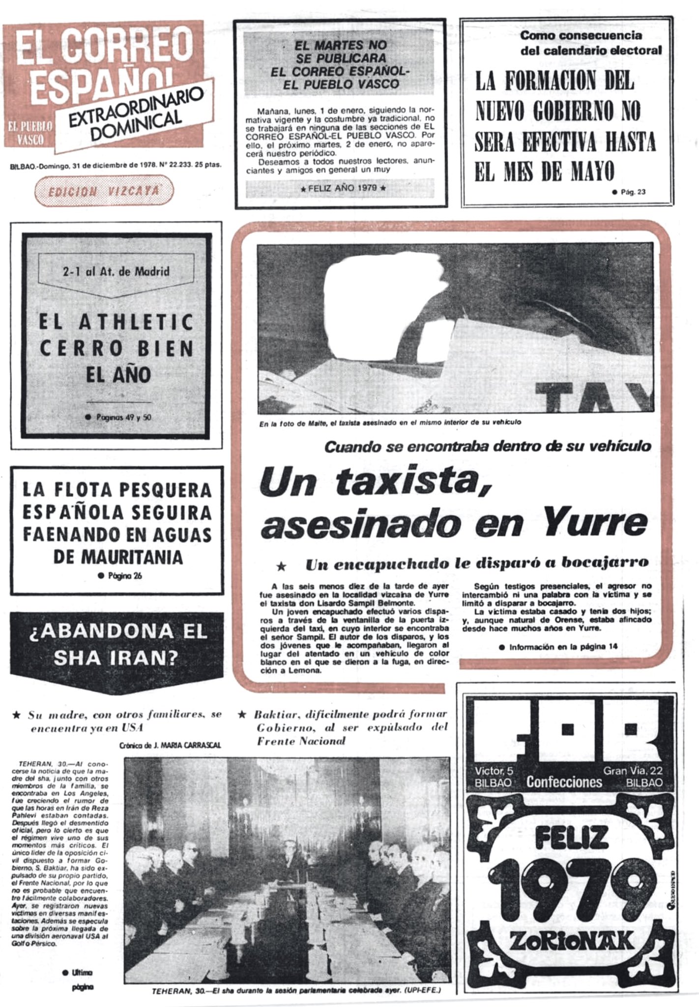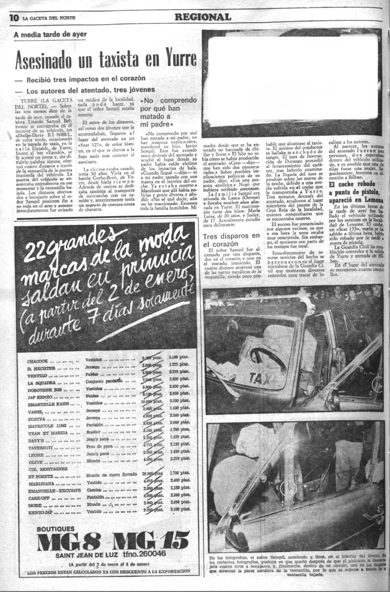 A las seis menos diez de la tarde del 30 de diciembre de 1978 miembros de la banda terrorista ETA asesinaban a tiros en Yurre (Vizcaya) al taxista LISARDO SAMPIL BELMONTE mientras esperaba la llegada de algún cliente dentro de su taxi junto a la puerta del Bar Eguzki en el barrio de Elejalde de la localidad vizcaína.
