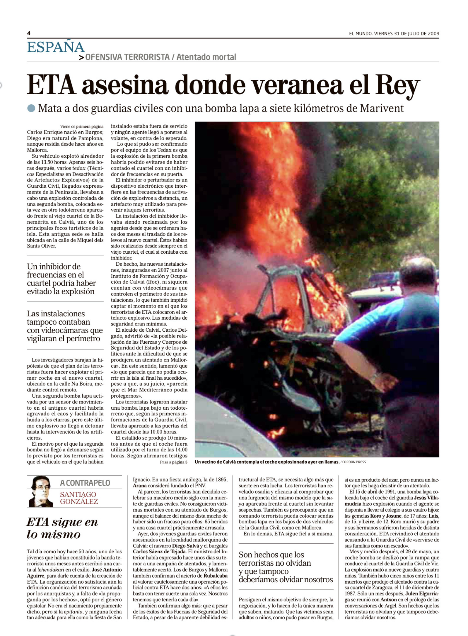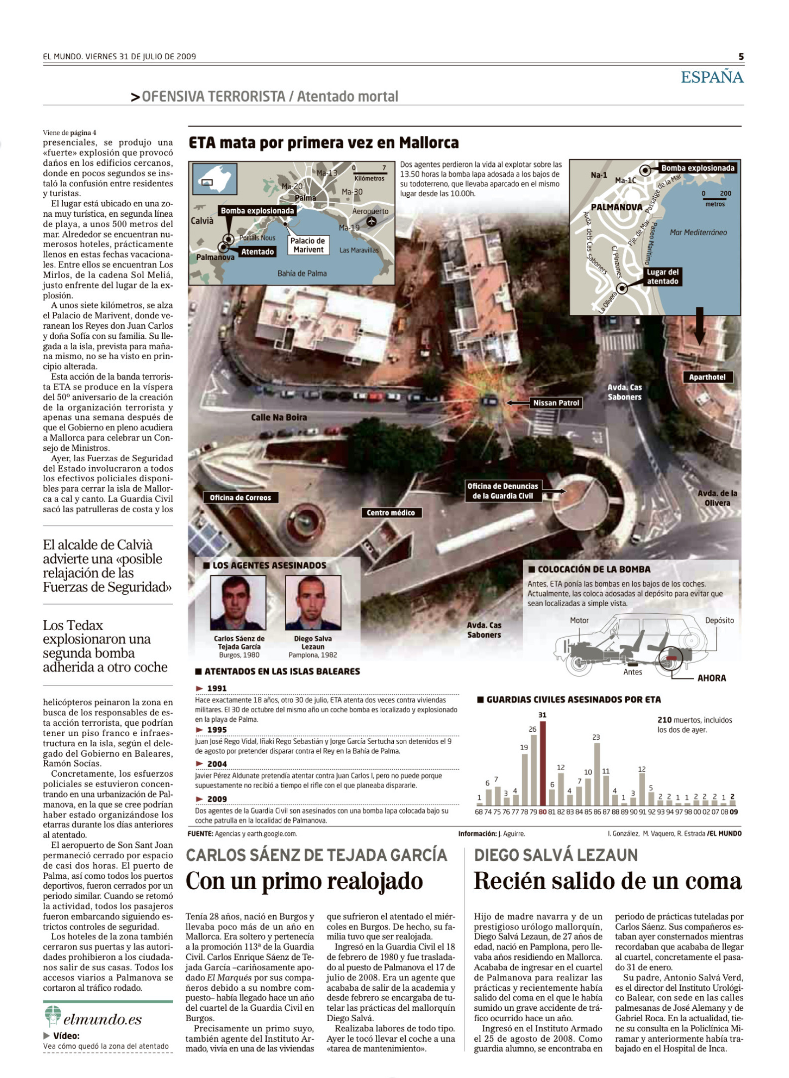 El 30 de julio de 2009 la banda terrorista ETA asesinaba en Palma de Mallorca, mediante una bomba-lapa en los bajos de un todoterreno del Instituto Armado, a los guardias civiles CARLOS ENRIQUE SÁENZ DE TEJADA GARCÍA y DIEGO SALVÀ LEZÁUN. El vehículo estaba aparcado frente a un edificio que sirve de sede a la Policía Local, Correos y la Oficina de Denuncias de la Guardia Civil situado en la zona turística de Palmanova. Poco antes de las 14:00 horas, los dos agentes se subieron al coche oficial y, en el momento en el que lo pusieron en marcha, el explosivo se activó por el movimiento. Los dos jóvenes murieron en el acto, destrozados por la potente explosión, convirtiéndose en las dos primeras víctimas mortales en la isla. El atentado se produjo dos días antes de la llegada de los Reyes.