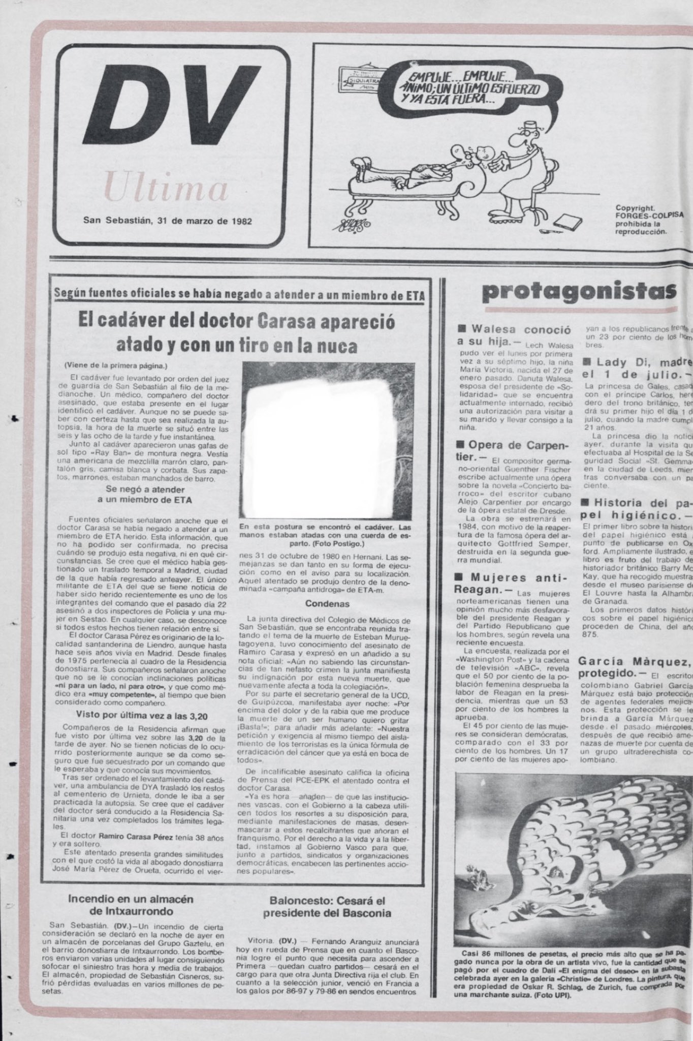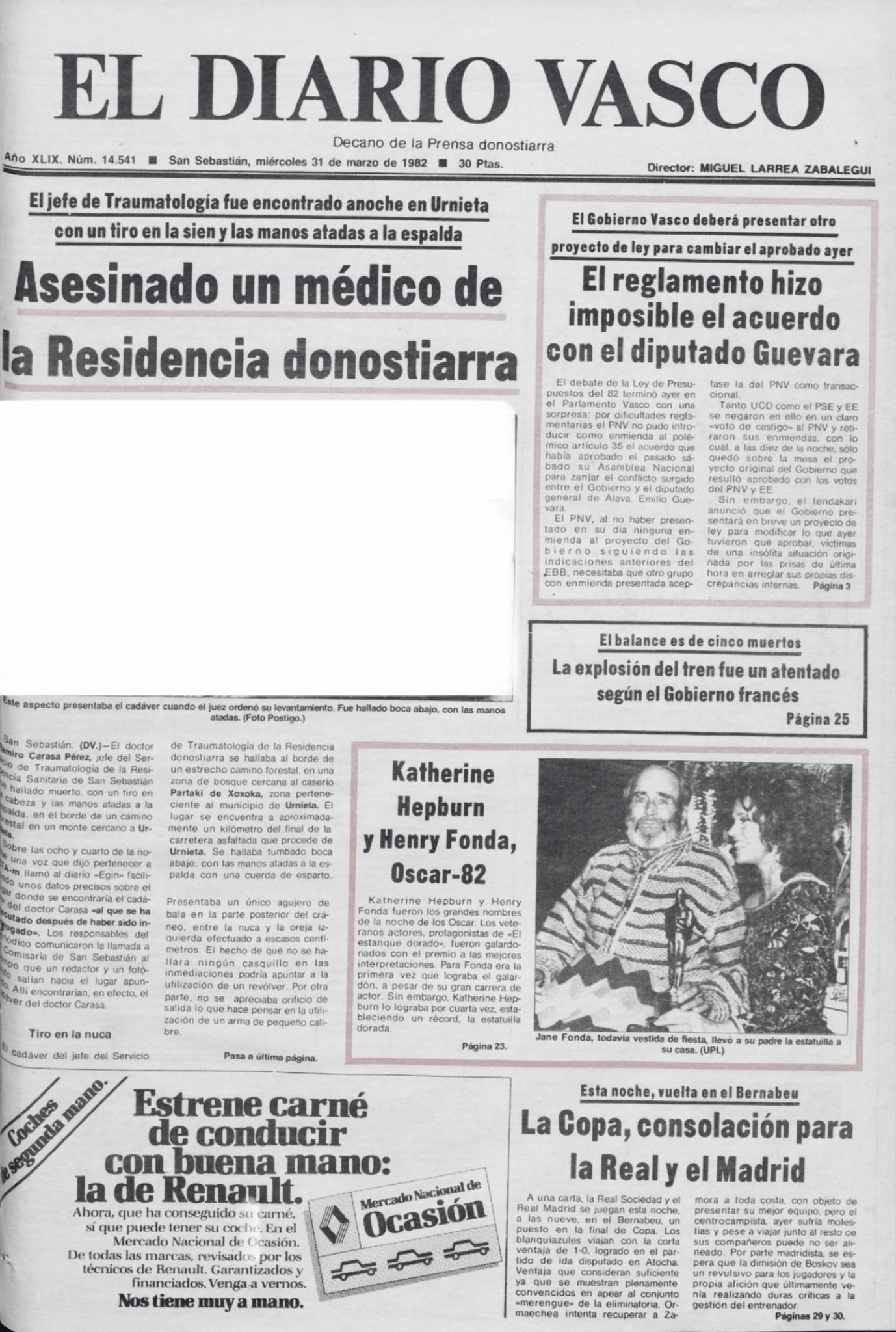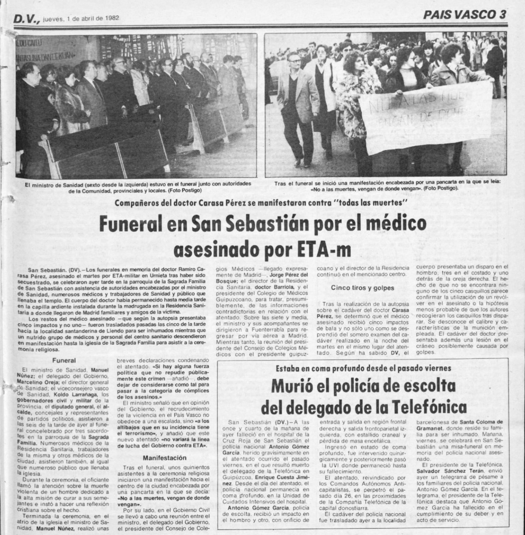 El martes 30 de marzo de 1982, ETA asesinaba al jefe del Departamento de Traumatología de la Residencia Nuestra Señora de Aránzazu de San Sebastián, el doctor RAMIRO CARASA PÉREZ. Ramiro apareció a las once de la noche con un tiro en la sien, en un monte cercano a la carretera entre Urnieta y Andoain, cerca de un caserío.