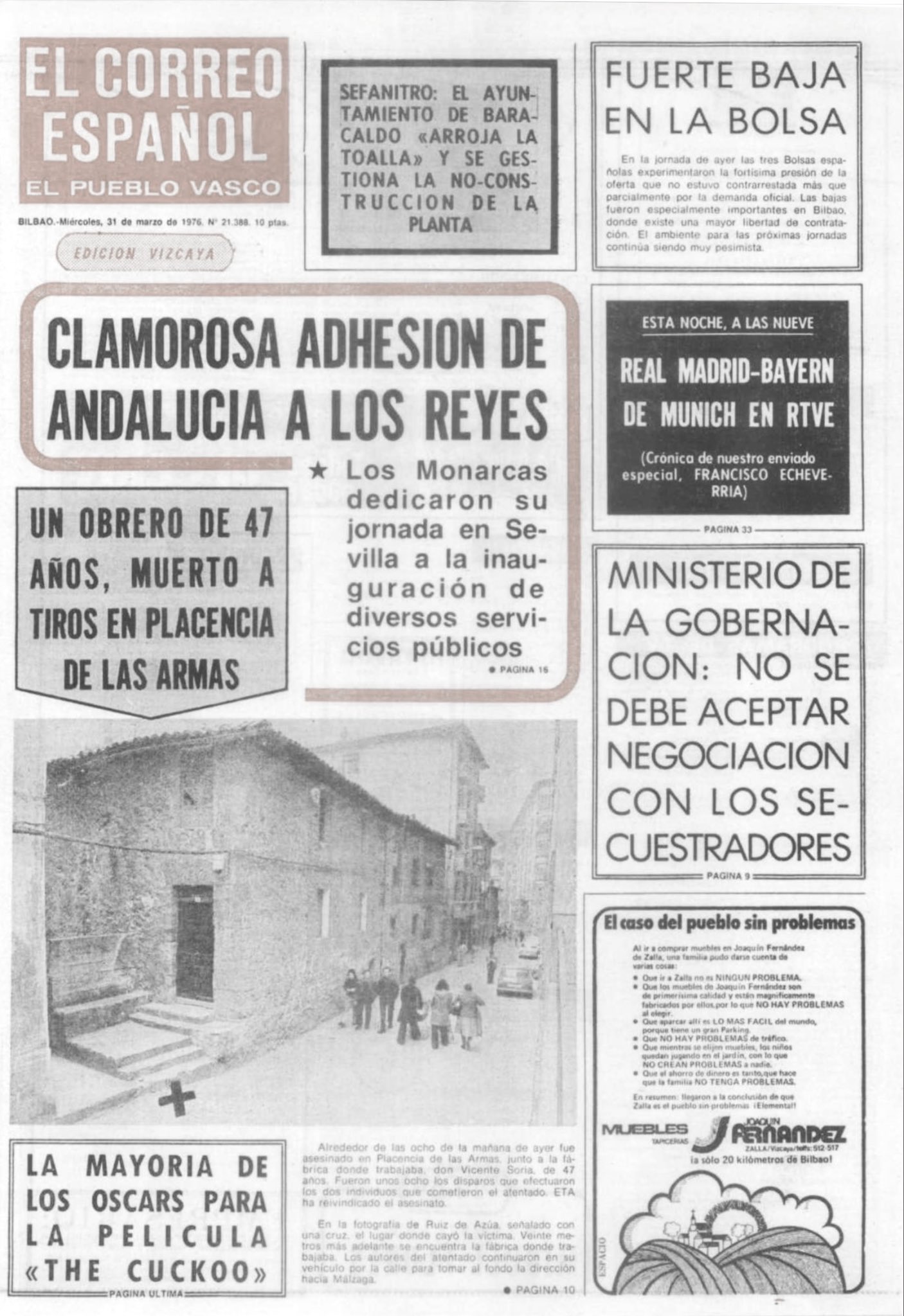El 30 de marzo de 1976, ETA asesina al obrero VICENTE SORIA BLASCO en Placencia de las Armas (Guipúzcoa). Eran aproximadamente las ocho de la mañana y Vicente se dirigía a su trabajo en la fábrica Tornillos Ormaechea. Dos etarras le dispararon a muy corta distancia con una pistola, e inmediatamente huyeron en un coche. Mientras se alejaban, dejaron caer una granada de fabricación alemana, que no llegó a explotar porque tenía puesto el seguro.
