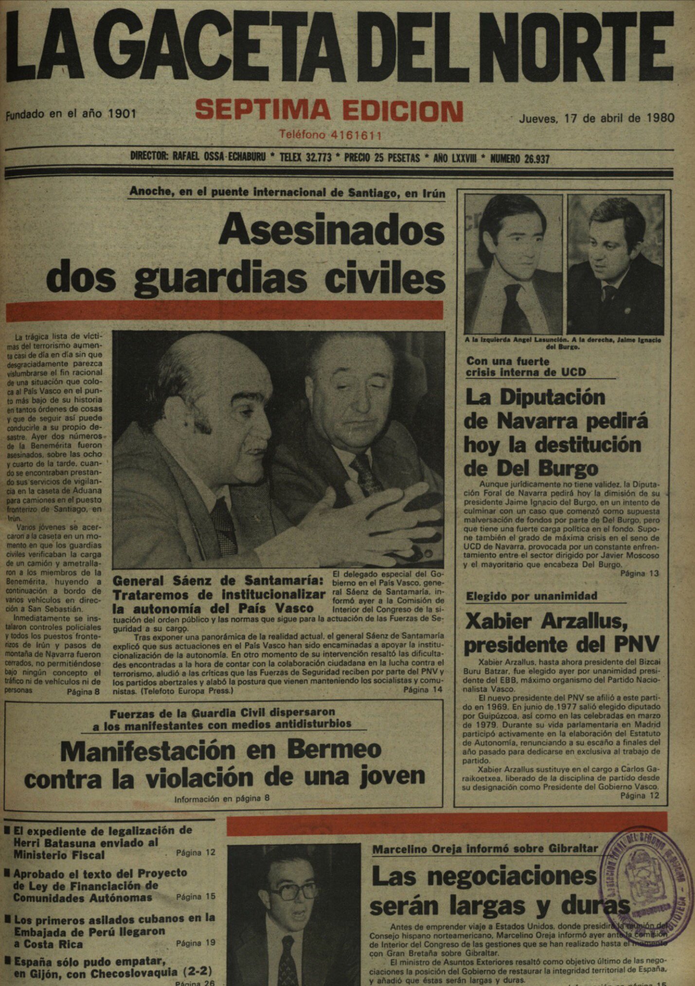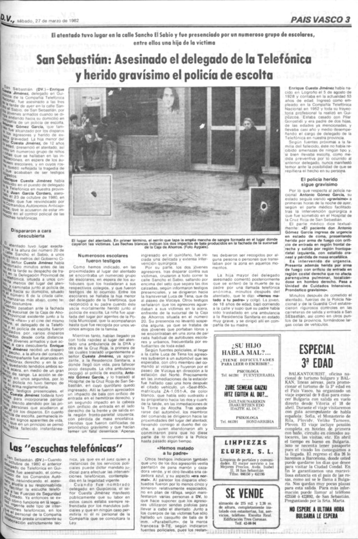 El 30 de marzo de 1978 fallece el policía JOSÉ VICENTE DEL VAL DEL RÍO, tras pasar veinticinco días entre la vida y la muerte, consecuencia del atentado sufrido el 5 de marzo