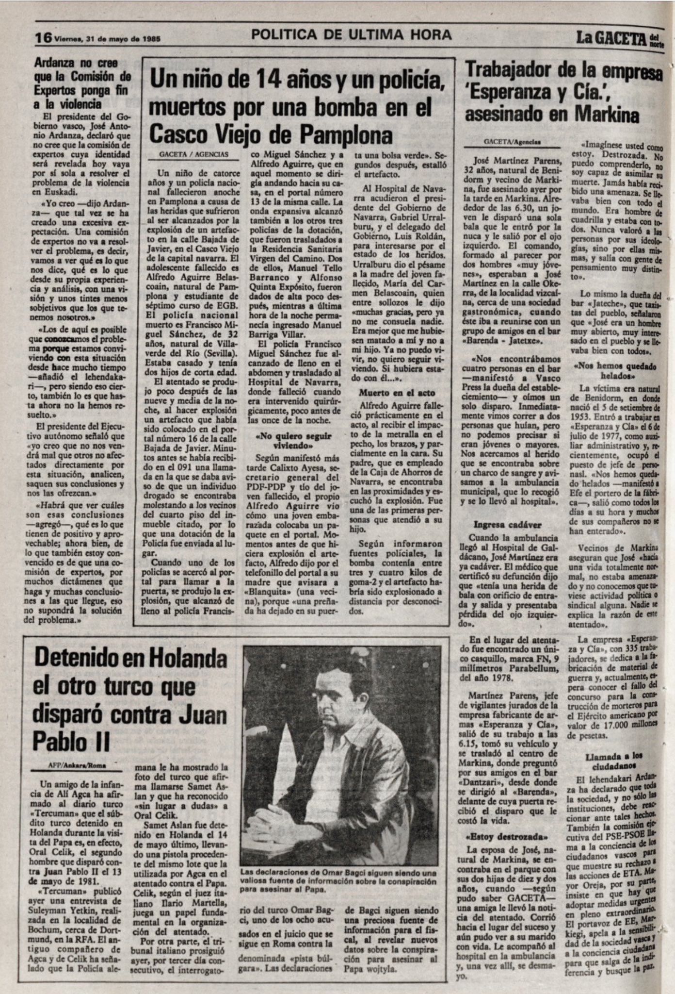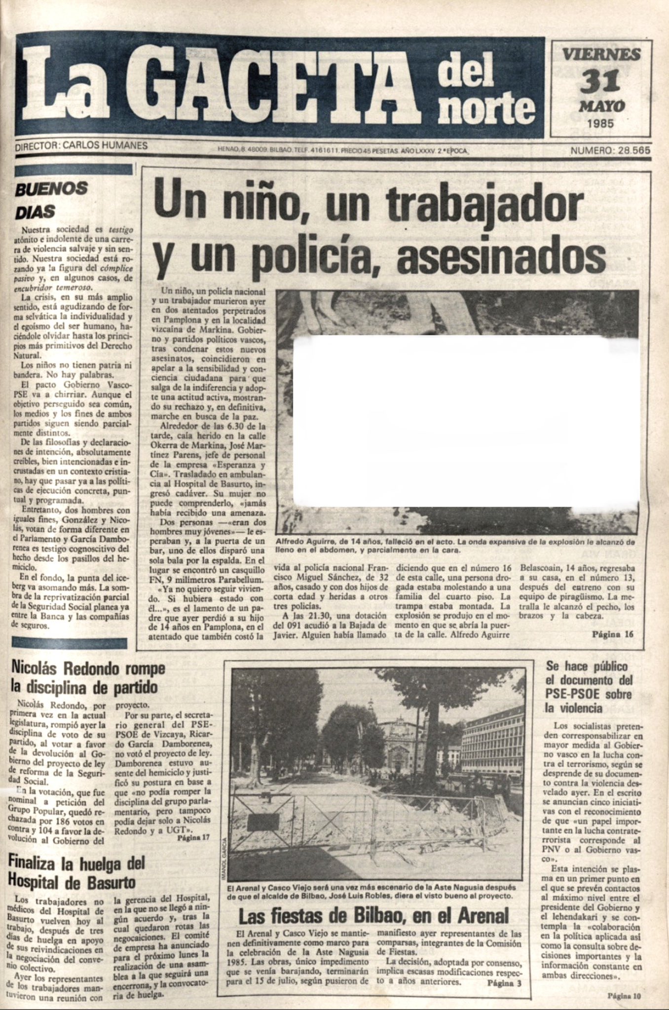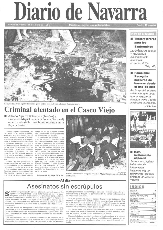 Apenas tres horas después, en torno a las 21:40 horas de ese 30 de mayo de 1985, un niño de 13 años, ALFREDO AGUIRRE BELASCOÁIN, y el policía nacional FRANCISCO MIGUEL SÁNCHEZ, son asesinados en Pamplona al hacer explosión un artefacto preparado contra la Policía Nacional. En el mismo atentado también sufrieron heridas de gravedad otros tres policías nacionales: Manuel Tello Barranco, Alfonso Quintá Expósito y Manuel Barrigas Villar.