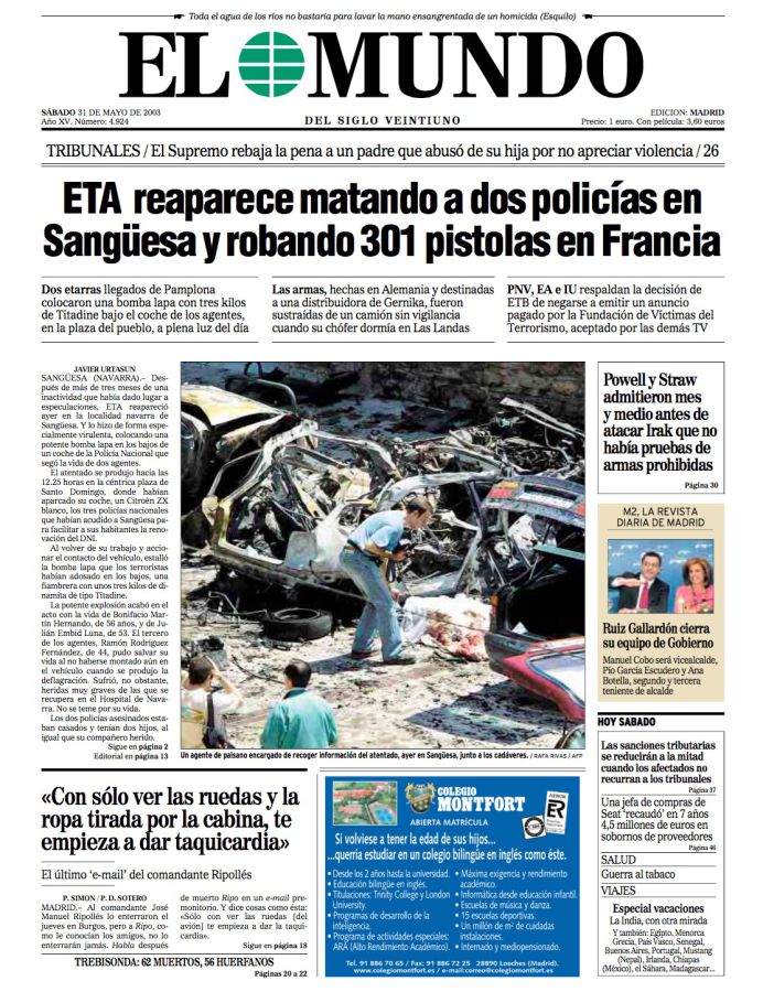 El viernes 30 de mayo de 2003, la banda terrorista ETA asesinaba en Sangüesa (Navarra) a los policías nacionales BONIFACIO MARTÍN HERNANDO y JULIÁN EMBID LUNA.