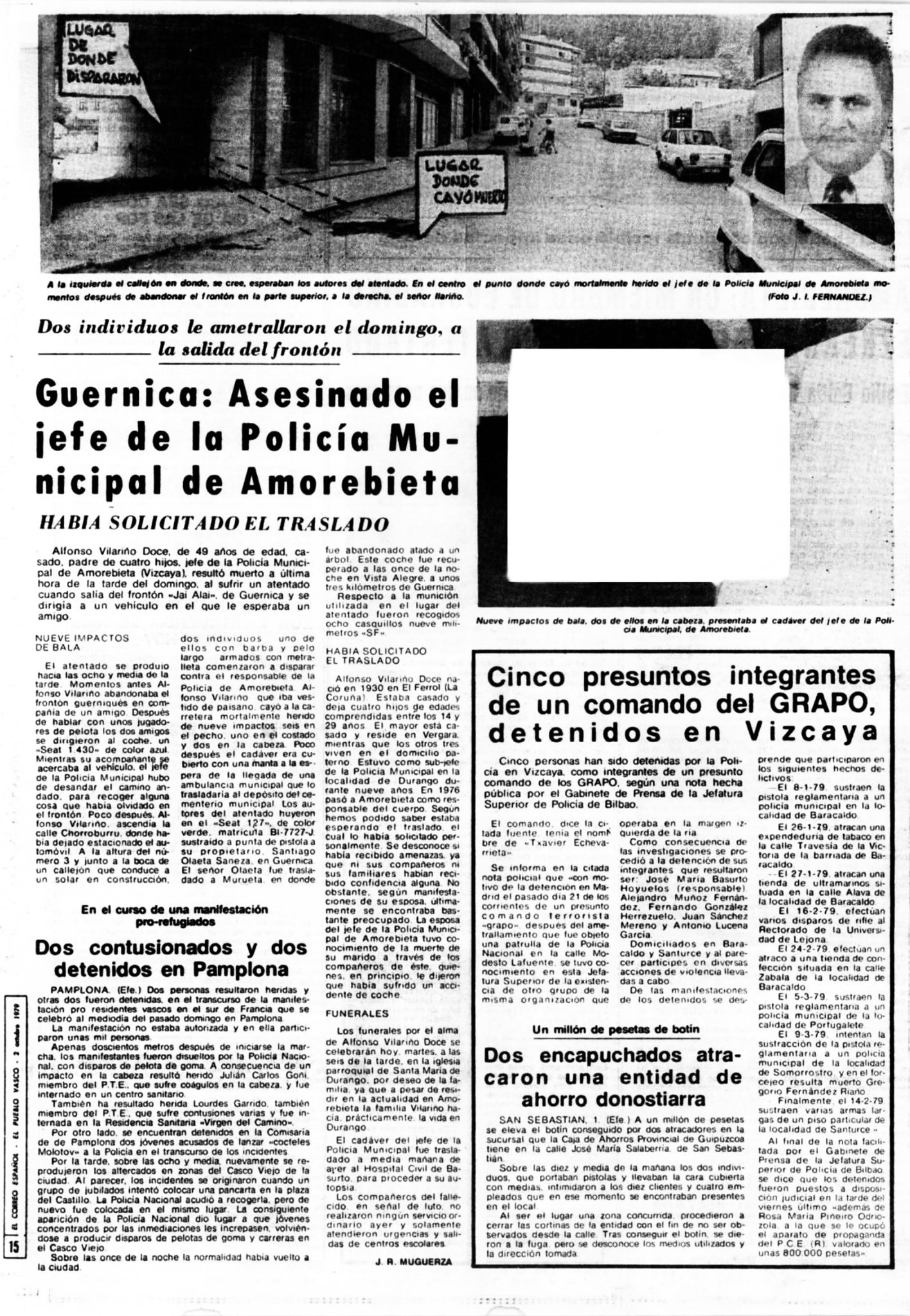 Pocas horas después, a las ocho y media de la tarde del 30 de septiembre de 1979, la banda terrorista ETA asesinaba en Guernica (Vizcaya) al jefe de la Policía Municipal de Amorebieta ALFONSO MANUEL VILARIÑO ORCE.