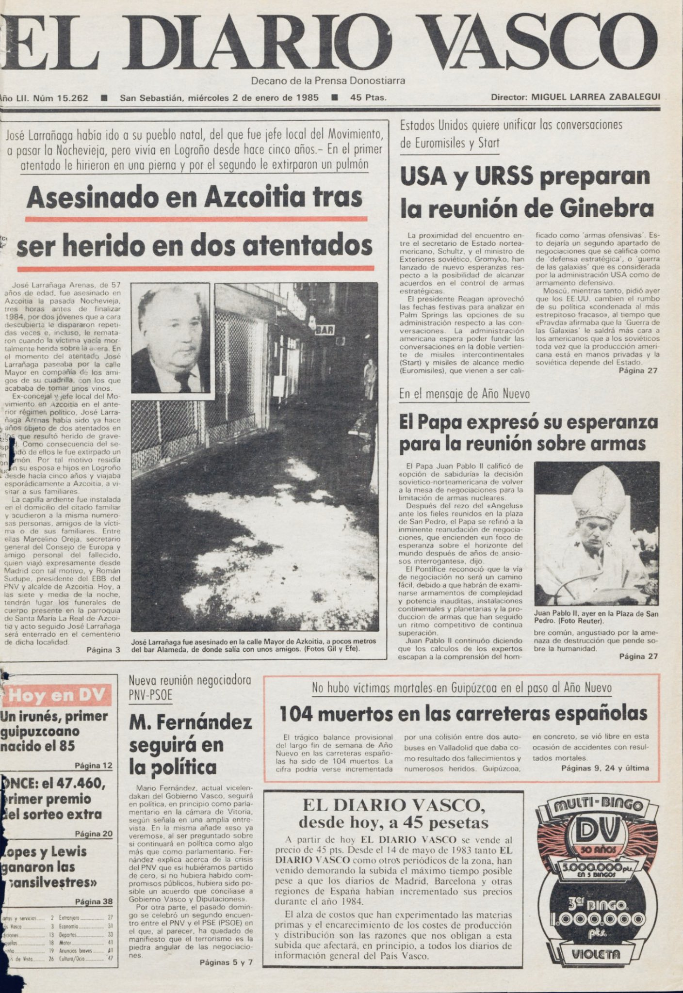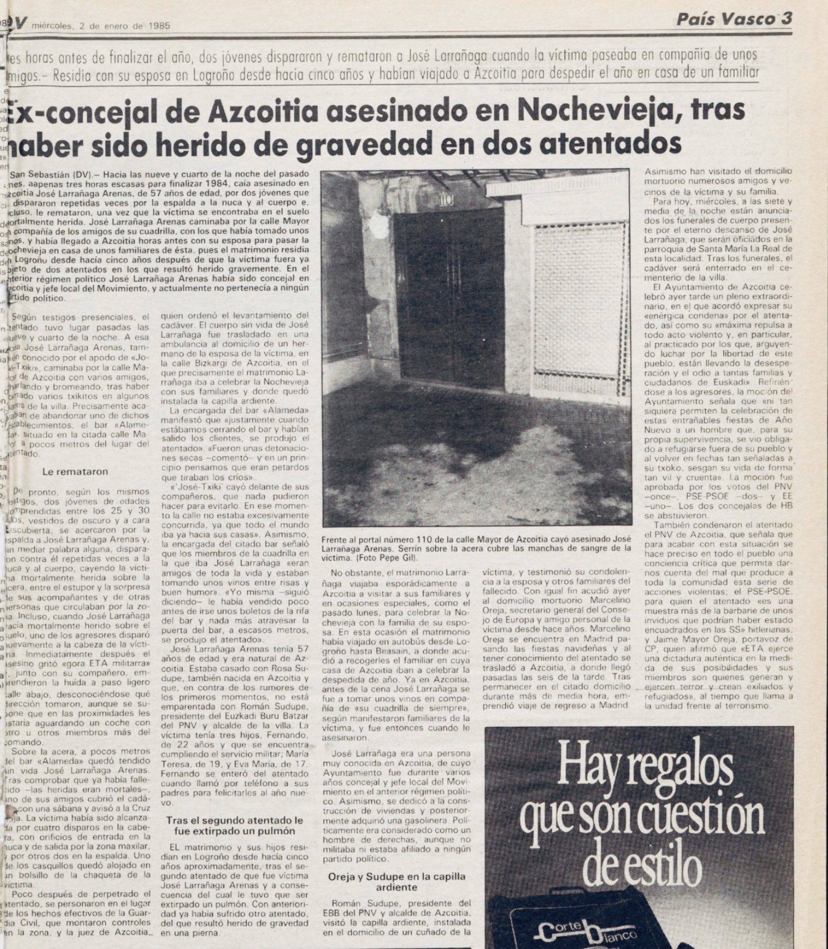 A las nueve de la noche del 31 de diciembre de 1984 la banda terrorista ETA asesinaba en la localidad guipuzcoana de Azcoitia al exconcejal y militante de Unión de Centro Democrático (UCD) JOSÉ TOMÁS LARRAÑAGA ARENAS, al que todos conocían como Txiki o José Txiki.