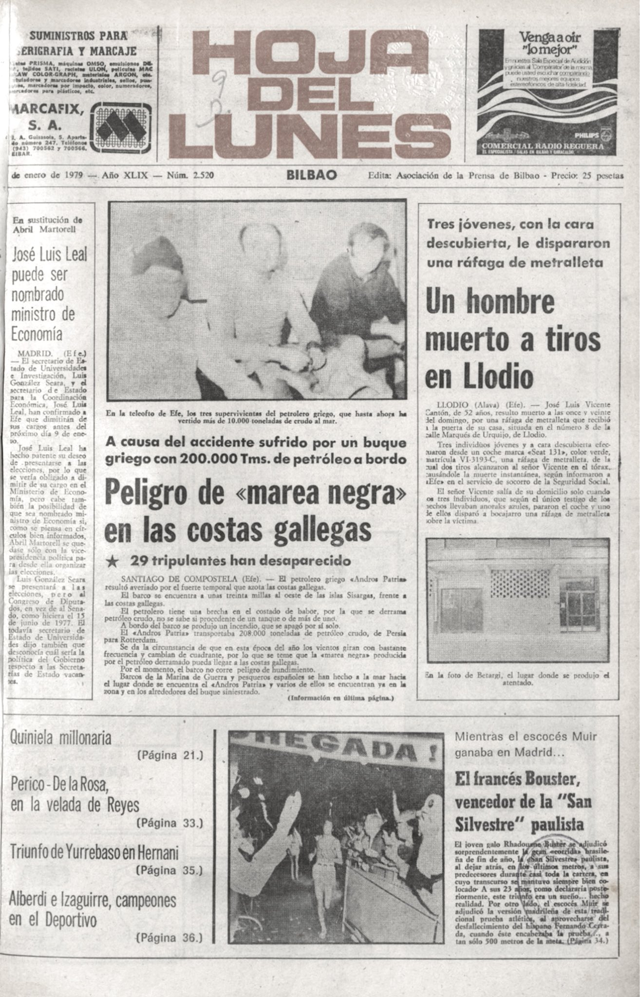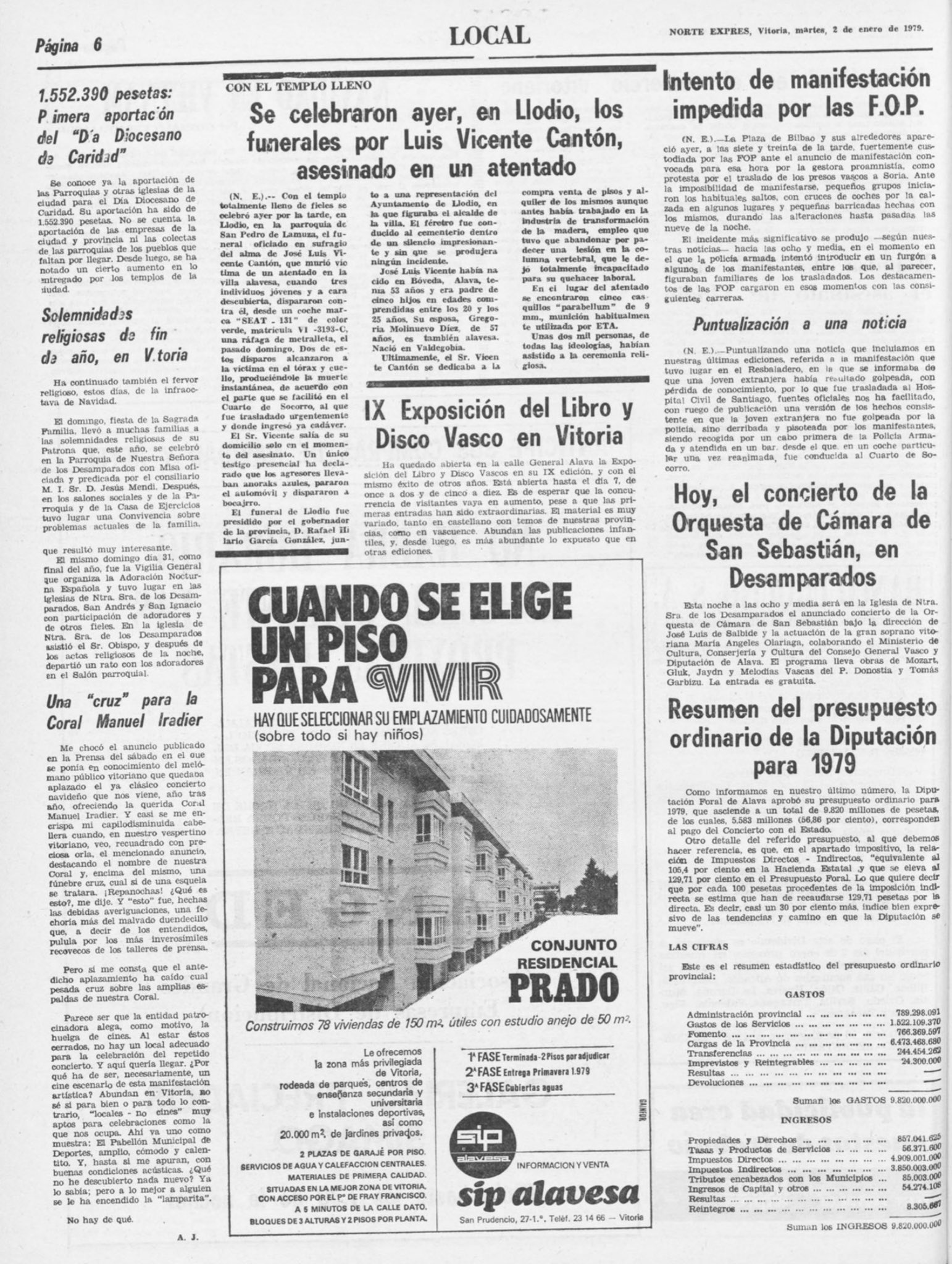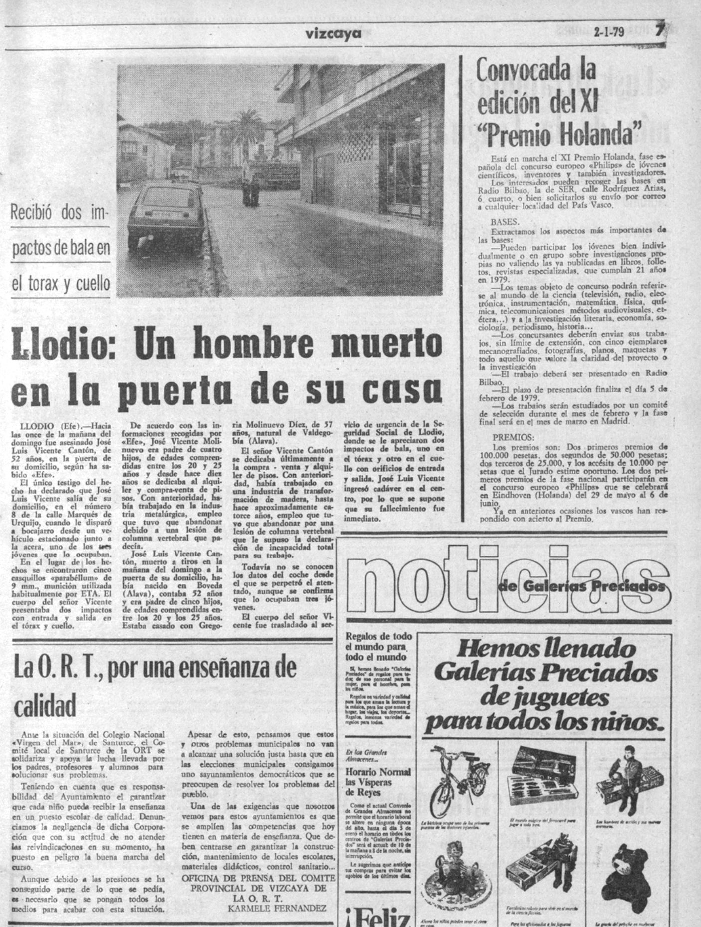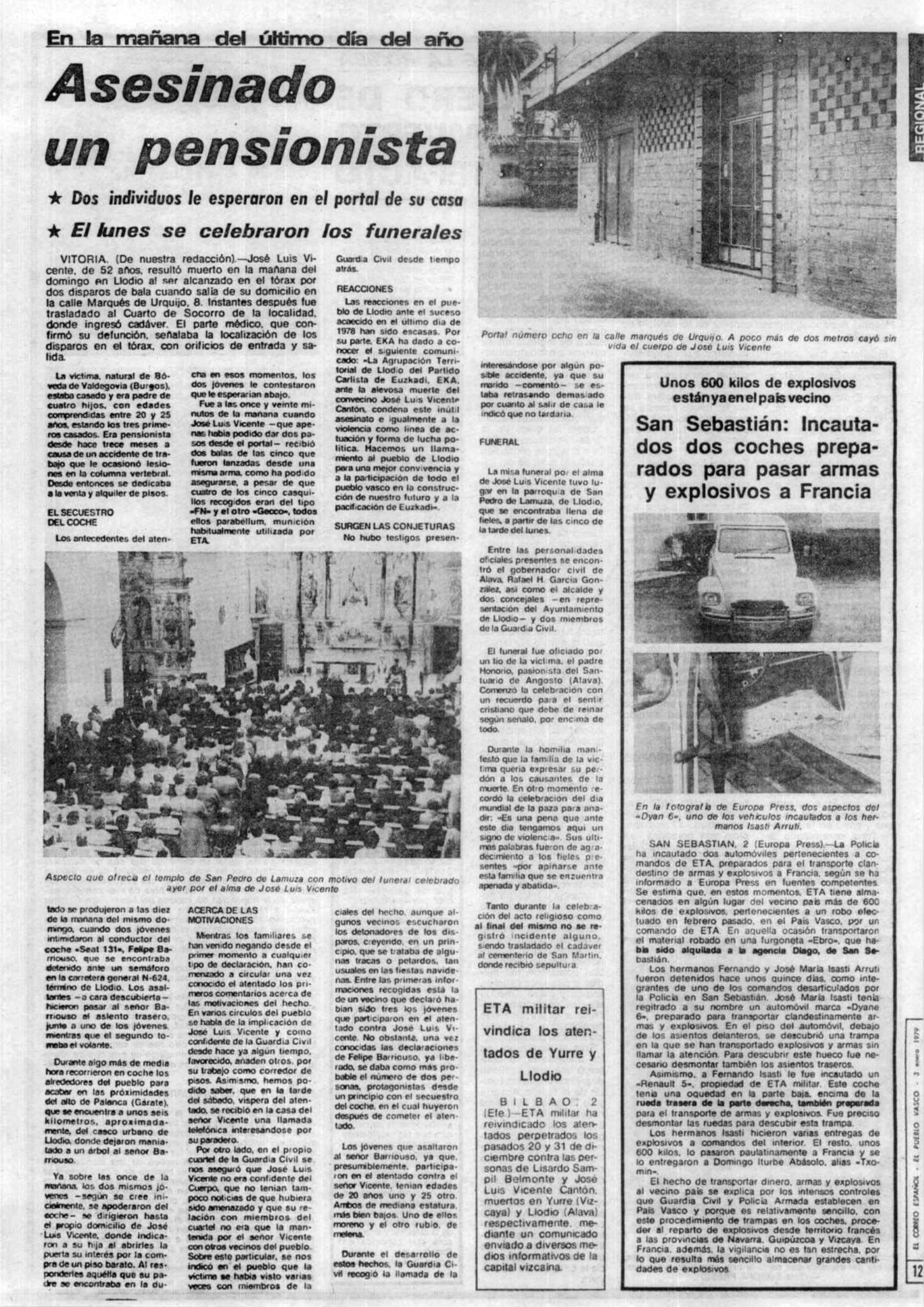 El 31 de diciembre de 1978 la banda terrorista ETA asesinaba en Llodio (Álava) a JOSÉ LUIS VICENTE CANTÓN que se convertía en la víctima mortal número 68 de un año en el que se había aprobado la Constitución española, lo que llevó a diversos ministros a afirmar que, con la aprobación de la Carta Magna, el terrorismo sería cortado de raíz. Incluso, el ministro de Defensa, Gutiérrez Mellado, manifestó que «la ETA está en el cepo».