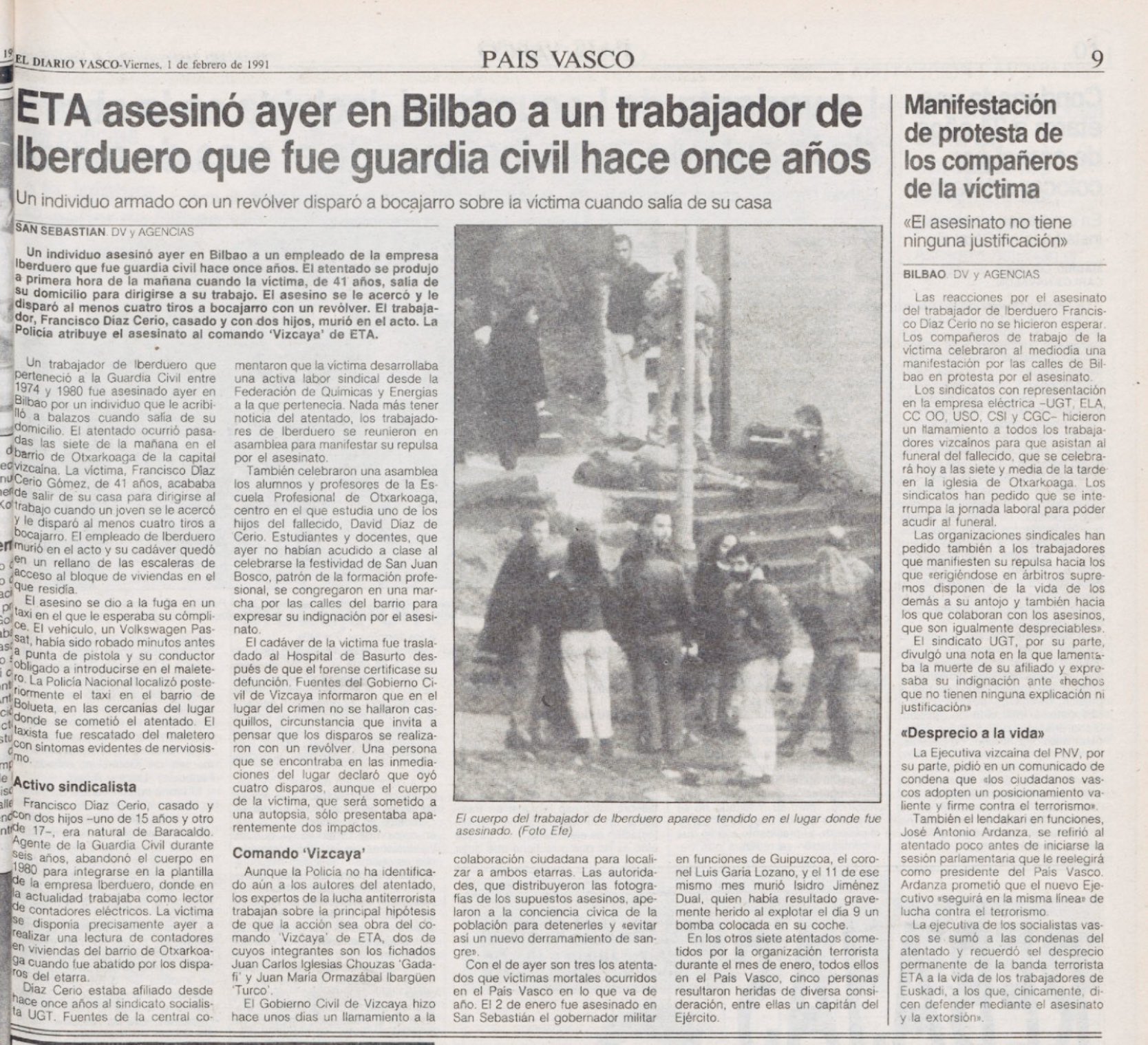 El 31 de enero de 1991 fue asesinado a tiros en el barrio bilbaíno de Ocharcoaga el ex guardia civil FRANCISCO DÍAZ DE CERIO GÓMEZ. Francisco salía de su domicilio en torno a las 7:00 horas para ir a trabajar. Tras recorrer unos metros, un pistolero de ETA se le acercó y le disparó seis tiros a bocajarro que le ocasionaron la muerte en el acto. Para cometer el atentado habían robado un vehículo a un taxista apenas un cuarto de hora antes.