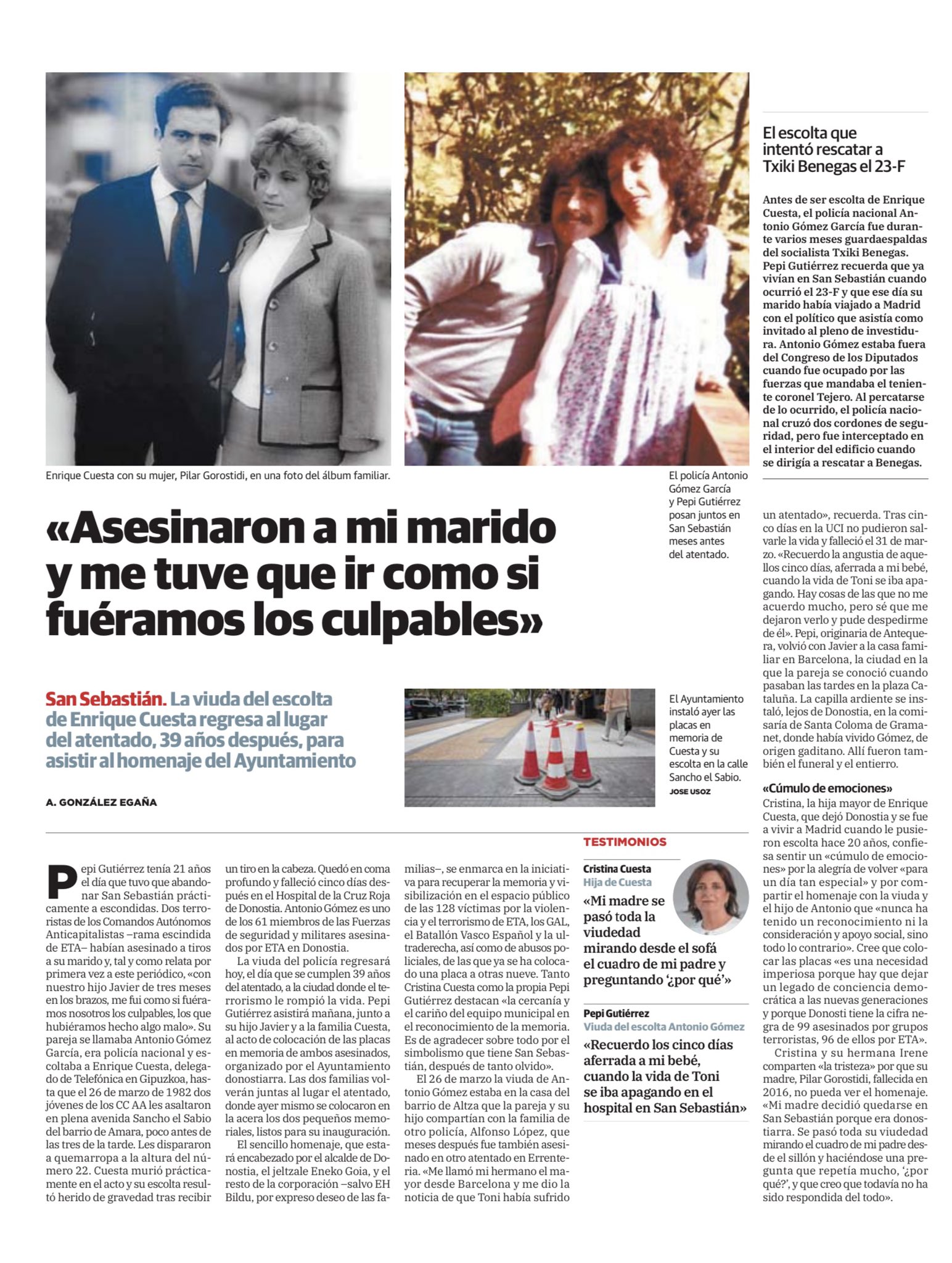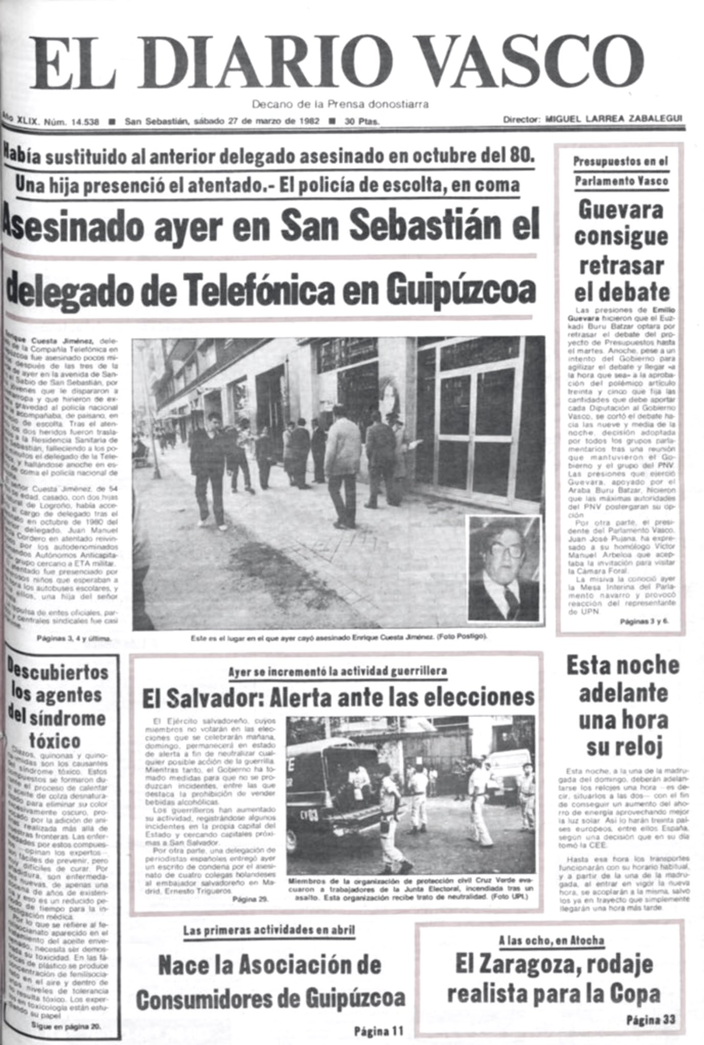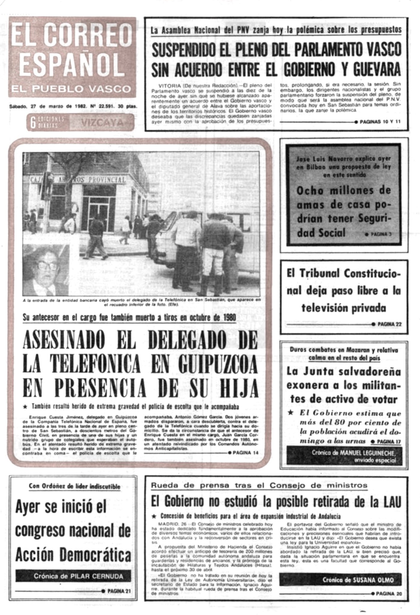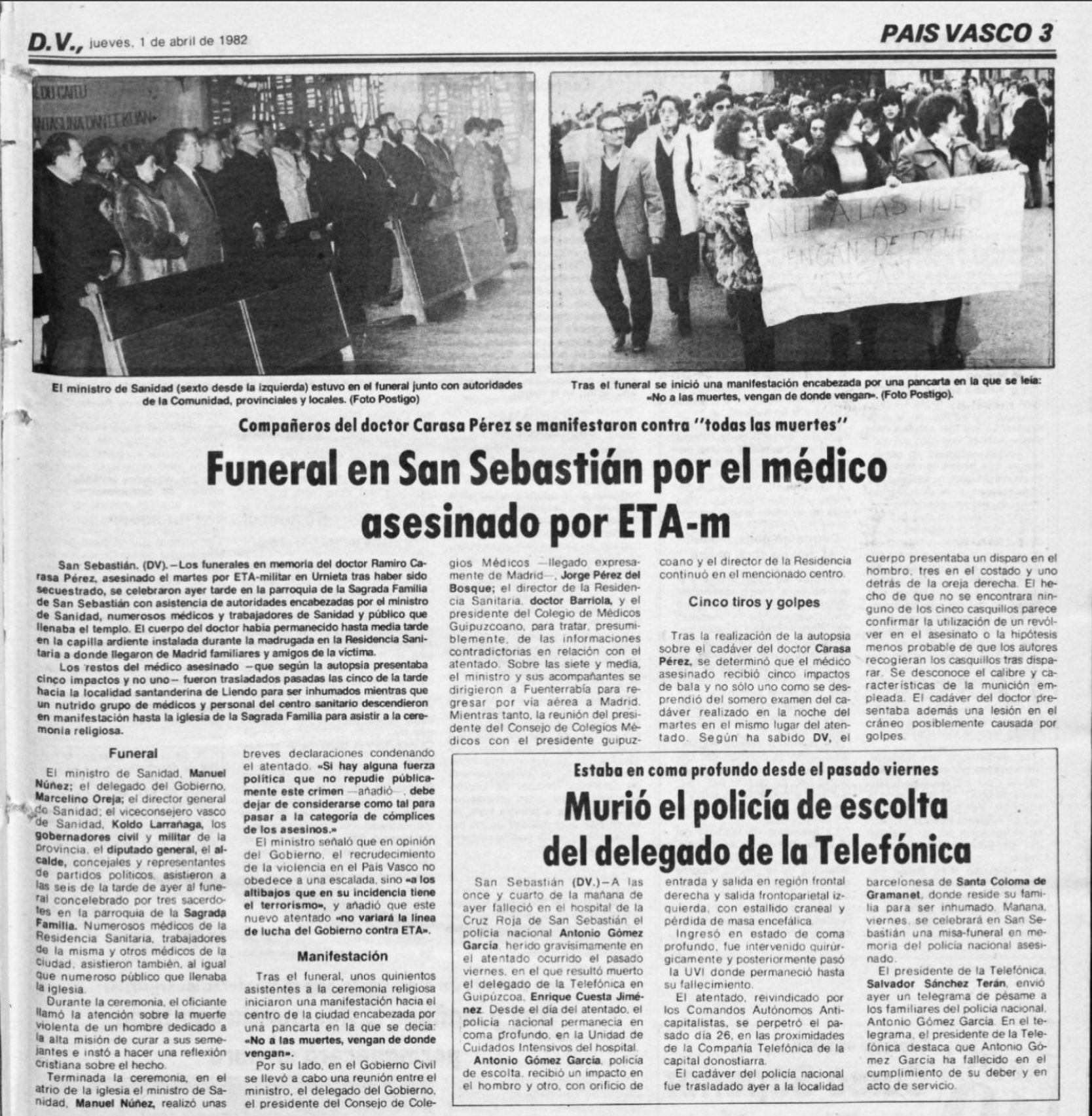 A media mañana del 31 de marzo de 1982 fallece en el Hospital de la Cruz Roja de San Sebastián el policía nacional ANTONIO GÓMEZ GARCÍA, consecuencia del atentado que, cinco días antes, acabó con la vida del delegado de Telefónica en San Sebastián, Enrique Cuesta Jiménez, del que Antonio era escolta.