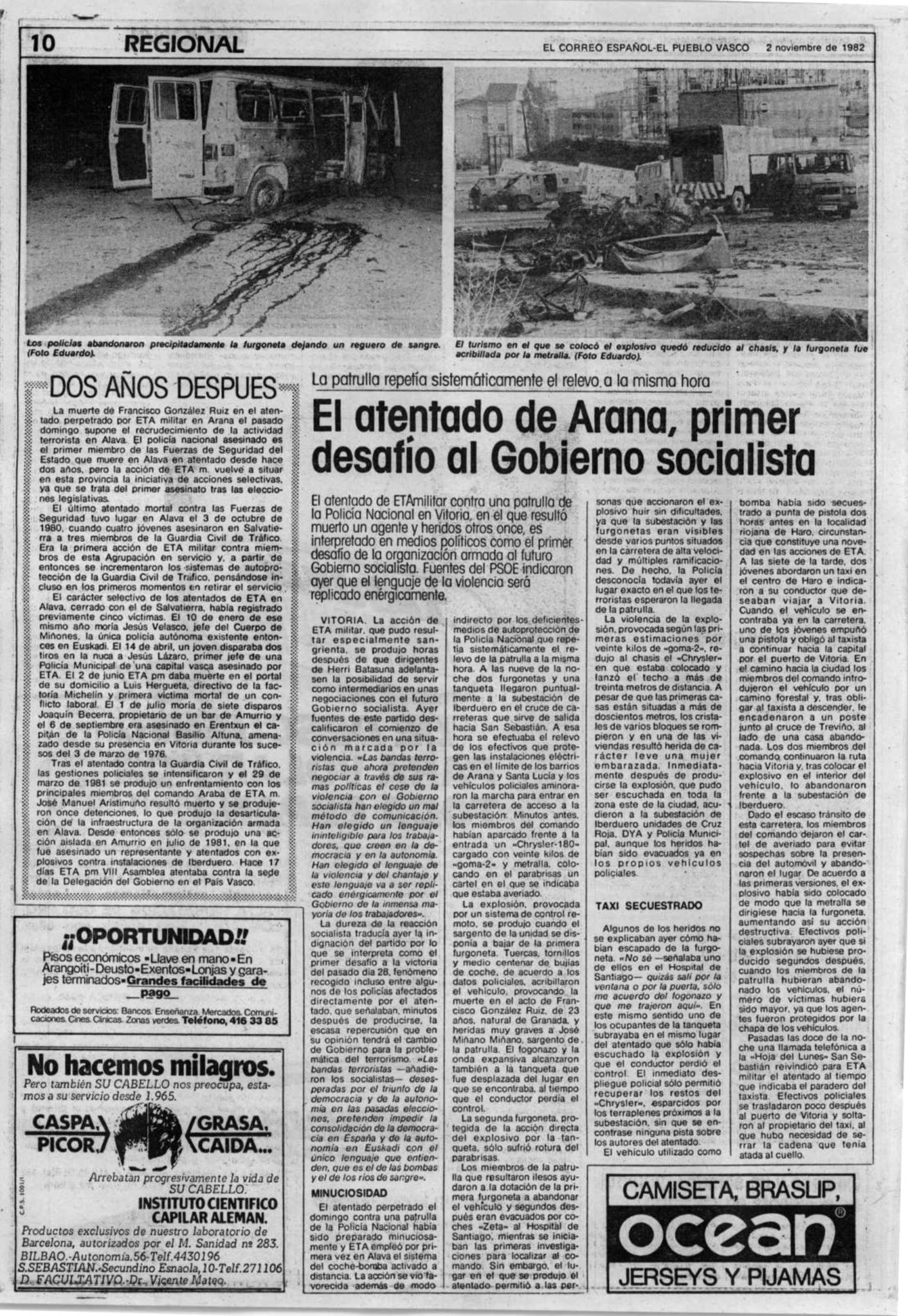 Hacia las nueve y veinte de la noche del 31 de octubre de 1982 la banda terrorista ETA asesinaba en Vitoria mediante la explosión de un coche-bomba compuesto por diez kilos de Goma 2, al policía nacional FRANCISCO GONZÁLEZ RUIZ y hería de gravedad al sargento José Miñano, de 38 años, natural de Alcantarilla (Murcia). Otros diez policías resultaron heridos de carácter leve, así como una mujer embarazada de siete meses que se encontraba en su domicilio y que fue alcanzada por los cristales de una ventana rota por la onda expansiva.