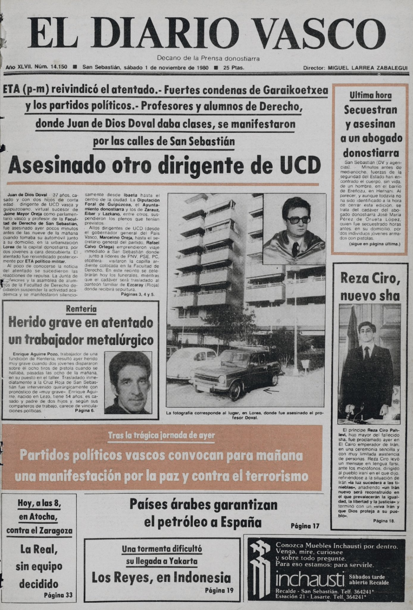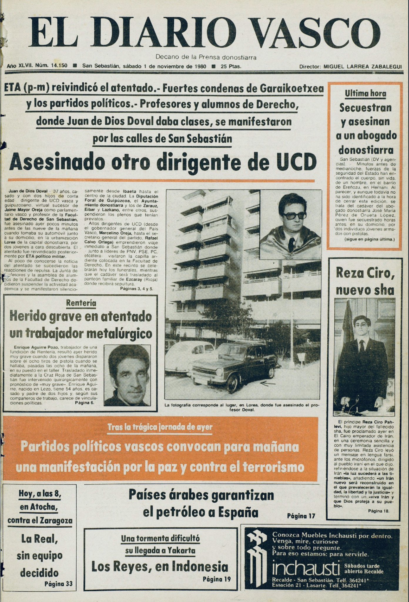 A las nueve menos cinco de la mañana del jueves 31 de octubre de 1980 la banda terrorista ETA asesinaba a JUAN DE DIOS DOVAL DE MATEO, miembro del comité ejecutivo de Guipúzcoa de Unión de Centro Democrático (UCD). Dos desconocidos dispararon contra él cuando había cogido el coche para dirigirse a su trabajo en la facultad de Derecho.