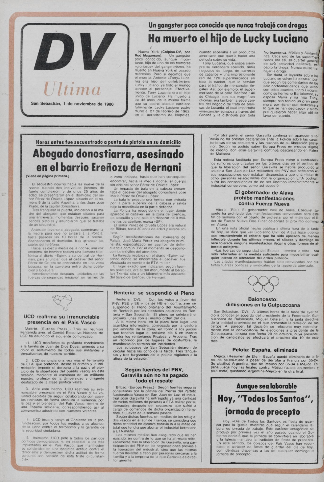 Pocas horas después del asesinato en San Sebastián de Juan de Dios Doval, en la tarde del 31 de octubre de 1980 la banda terrorista ETA secuestraba y asesinaba en Hernani (Guipúzcoa) al abogado JOSÉ MARÍA PÉREZ LÓPEZ DE ORUETA. Su cadáver fue encontrado por la Policía antes de la medianoche en las proximidades de la localidad guipuzcoana, en un punto de la carretera que va a Goizueta (Navarra). El hallazgo se produjo después de que una llamada anónima al diario Egin comunicase que había una persona muerta en ese punto de la carretera. El cuerpo del abogado presentaba un solo orifico de bala en la sien izquierda.