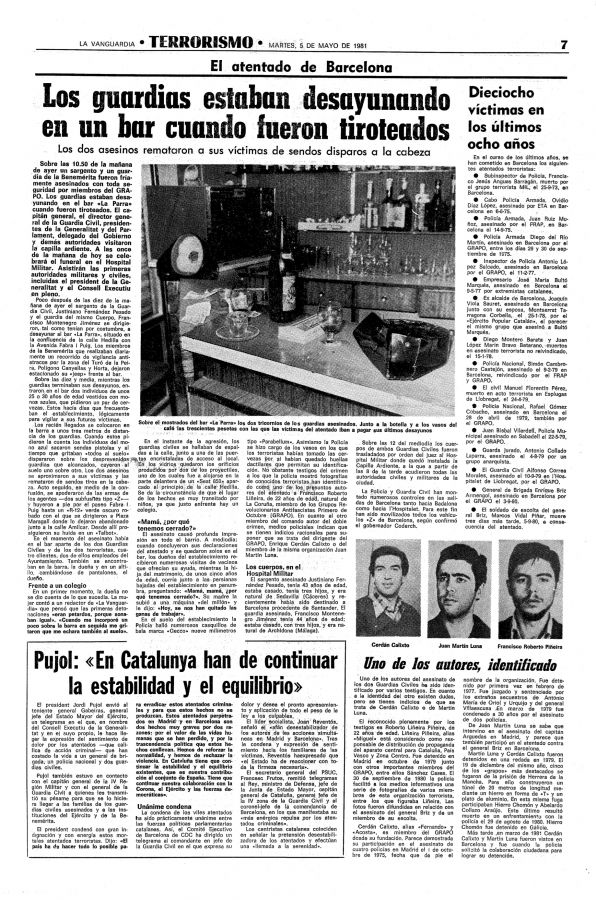 El 4 de mayo de 1981 los guardias civiles Justiniano Fernández Pesado y Francisco Montenegro Jiménez tomaban café en el bar La Parra, en el número 397 del paseo de Fabra i Puig, casi esquina con la calle de Hedilla de Barcelona cuando dos miembros de los GRAPO entraron al local y les dispararon varios tiros. Los guardias civiles murieron inmediatamente. Ambos agentes vestían de uniforme y portaban subfusiles zeta. Se encontraban patrullando por el barrio, vigilando las estafetas de Correos y las entidades bancarias, una labor rutinaria en cuyo transcurso solían parar en el bar.