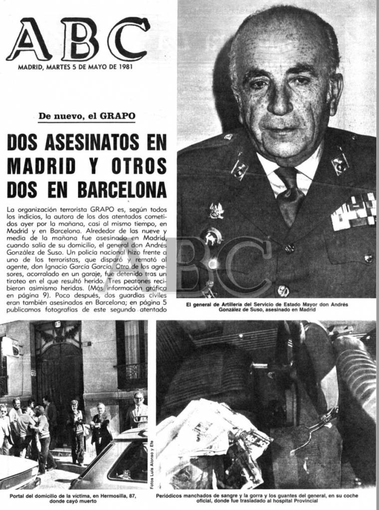 El general Andrés González de Suso salió de su portal en el número 78 de la calle Hermosilla a las 9.30 del 4 de mayo de 1981, y se subió al asiento trasero del coche oficial que le esperaba para llevarle al trabajo. No había ni cerrado la puerta cuando se le acercaron dos jóvenes con pistolas, y uno de ellos le pegó un tiro en la cabeza. El conductor rápidamente trasladó al general hasta el hospital más cercano, sin saber que Andrés González ya estaba muerto. Los terroristas, por su parte, salieron corriendo, y en la calle Hermosilla se toparon con un vehículo de la Policía Nacional que cumplía servicio por la zona. El cabo Ignacio García García trató de detener a uno de los terroristas e incluso, según declararían los testigos, llegó a golpearle en la cabeza con la culata del revólver. El segundo terrorista aprovechó ese instante para disparar contra el agente y, posteriormente, lo remató en el suelo.