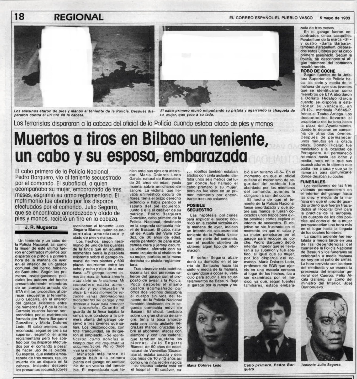 Cuando estaban a punto de meterlo en el maletero de un vehículo, entraron en el garaje PEDRO BARQUERO GONZÁLEZ, cabo de la Policía Nacional, y su mujer, MARÍA DOLORES LEDO GARCÍA, embarazada de casi siete meses. Pedro sacó su arma, pero los terroristas se adelantaron y dispararon contra el policía y su mujer. A continuación, hicieron lo mismo con Julio, que estaba atado y amordazado. El triple asesinato se produjo cuatro días antes de las elecciones municipales.