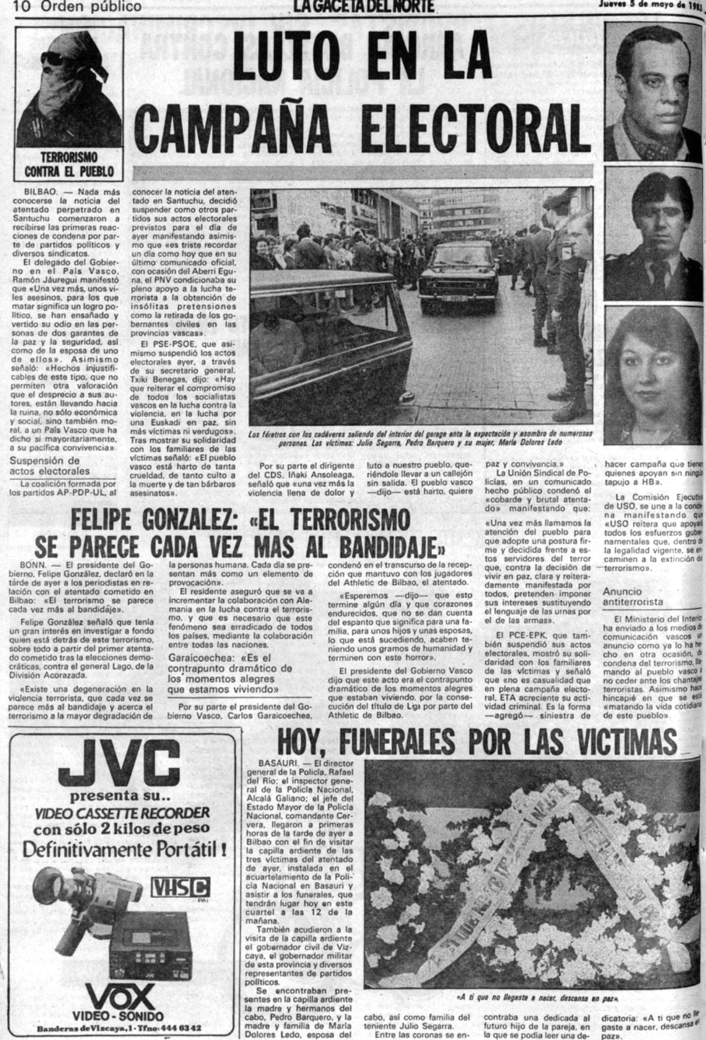 El 4 de mayo de 1983 la banda terrorista ETA intentó secuestrar al teniente de la Policía Nacional JULIO SEGARRA BLANCO con el objetivo de canjearlo por presos de la banda. Para ello robaron un coche a punta de pistola y se introdujeron en el interior de un garaje situado en la plaza del Carmelo del barrio de Santuchu en Bilbao. Ahí sorprendieron los terroristas al policía, que bajó en torno a las 8:00 horas a recoger su automóvil para trasladarse al cuartel de Basauri. Lo ataron de pies y manos con alambres y lo amordazaron con esparadrapo.