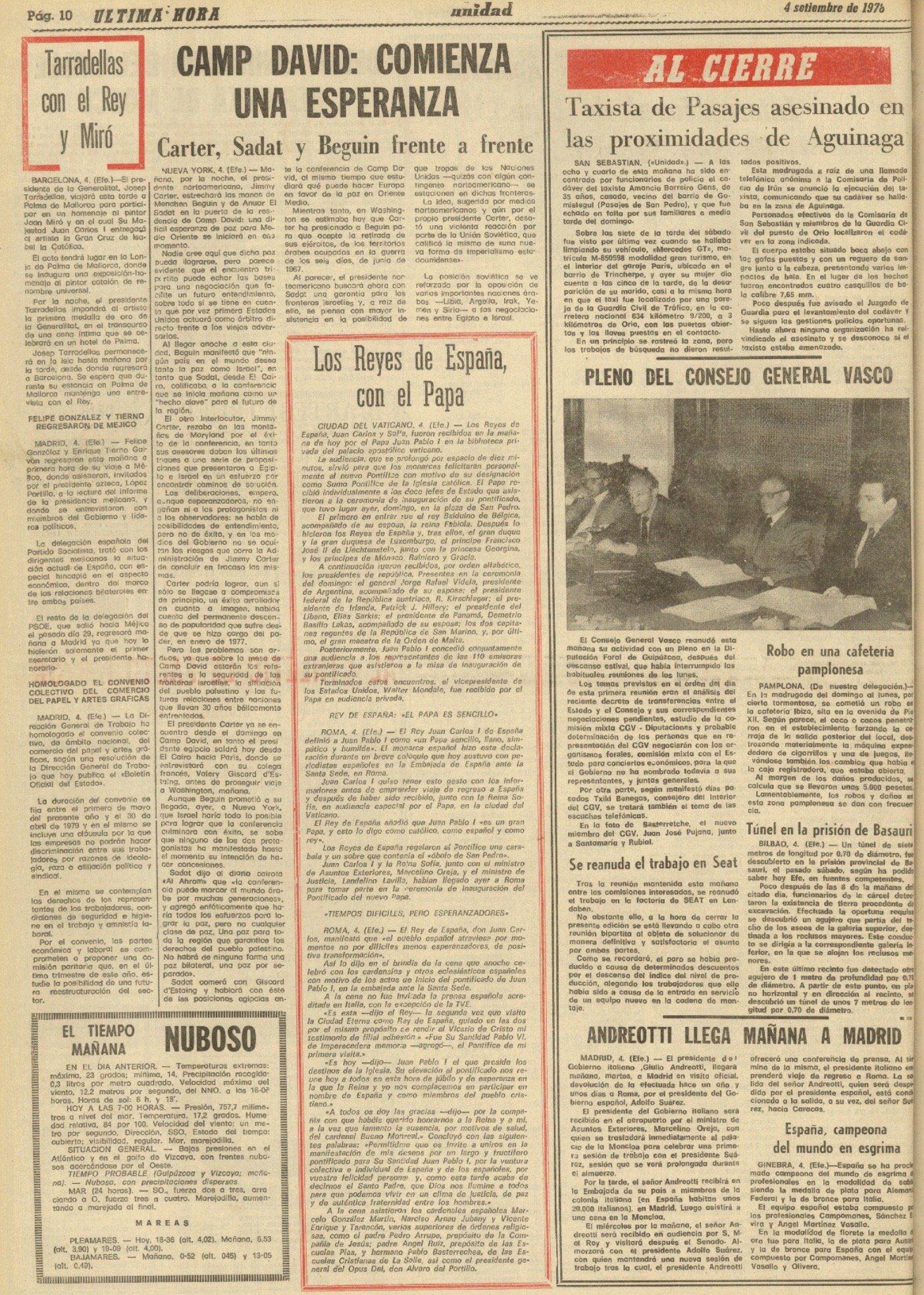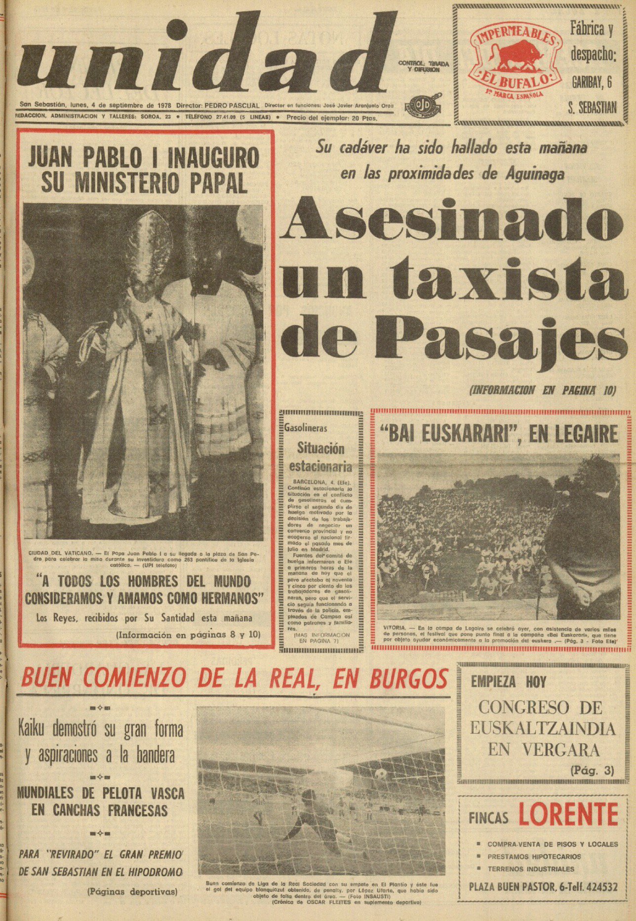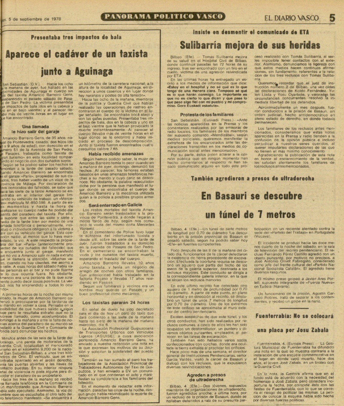 En la madrugada del 4 de septiembre de 1978 apareció en Aguinaga (Guipúzcoa) el cadáver del taxista AMANCIO BARREIRO GENS, visto por última vez con vida el sábado 2 de septiembre cerca de Pasajes. El taxista había sido asesinado con dos tiros a bocajarro en la cabeza tras ser secuestrado por dos miembros de la banda terrorista ETA. El cadáver se encontraba boca abajo, con las gafas puestas y un gran charco de sangre junto a la cabeza. Presentaba también un impacto de bala en el vientre. La Policía recogió en el lugar de los hechos cuatro casquillos de bala del calibre 7,65 mm.
