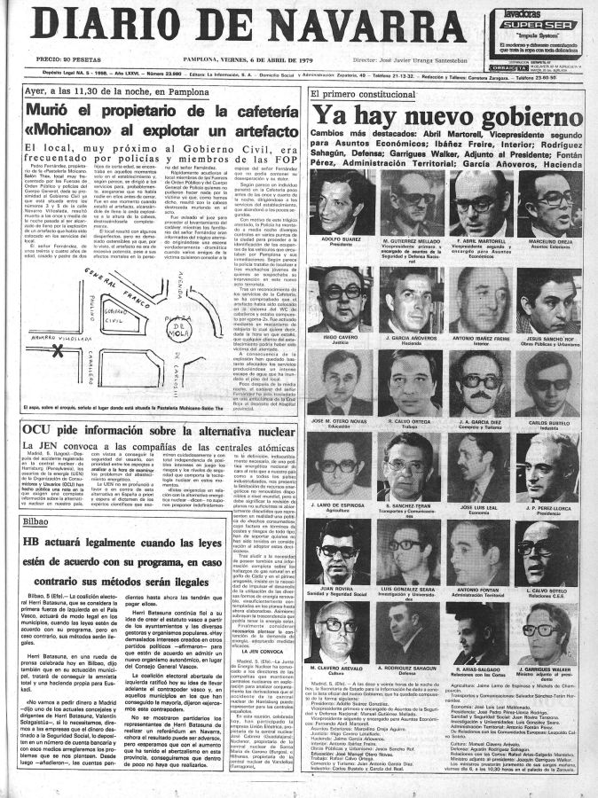 El 5 de abril de 1979 la explosión de una bomba colocada por ETA en la cafetería El Mohicano de Pamplona acabó con la vida de su propietario, PEDRO FERNÁNDEZ SERRANO, que era la única persona que se encontraba en ese momento en el establecimiento. El Mohicano, situado frente al Gobierno Civil de Navarra, donde estaba instalada la Jefatura Superior de Policía, era frecuentado por policías y guardias civiles.