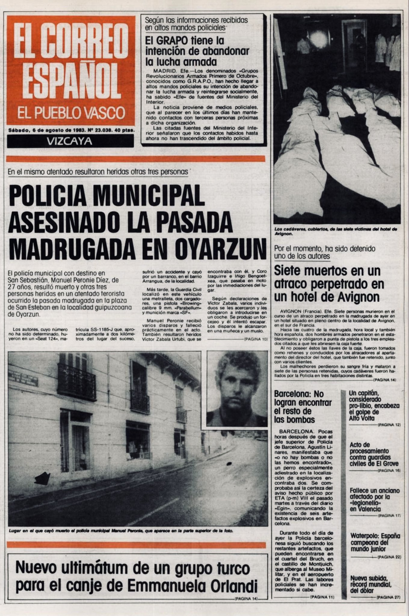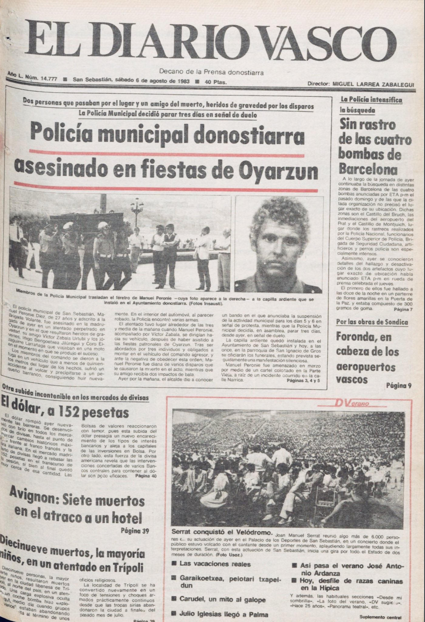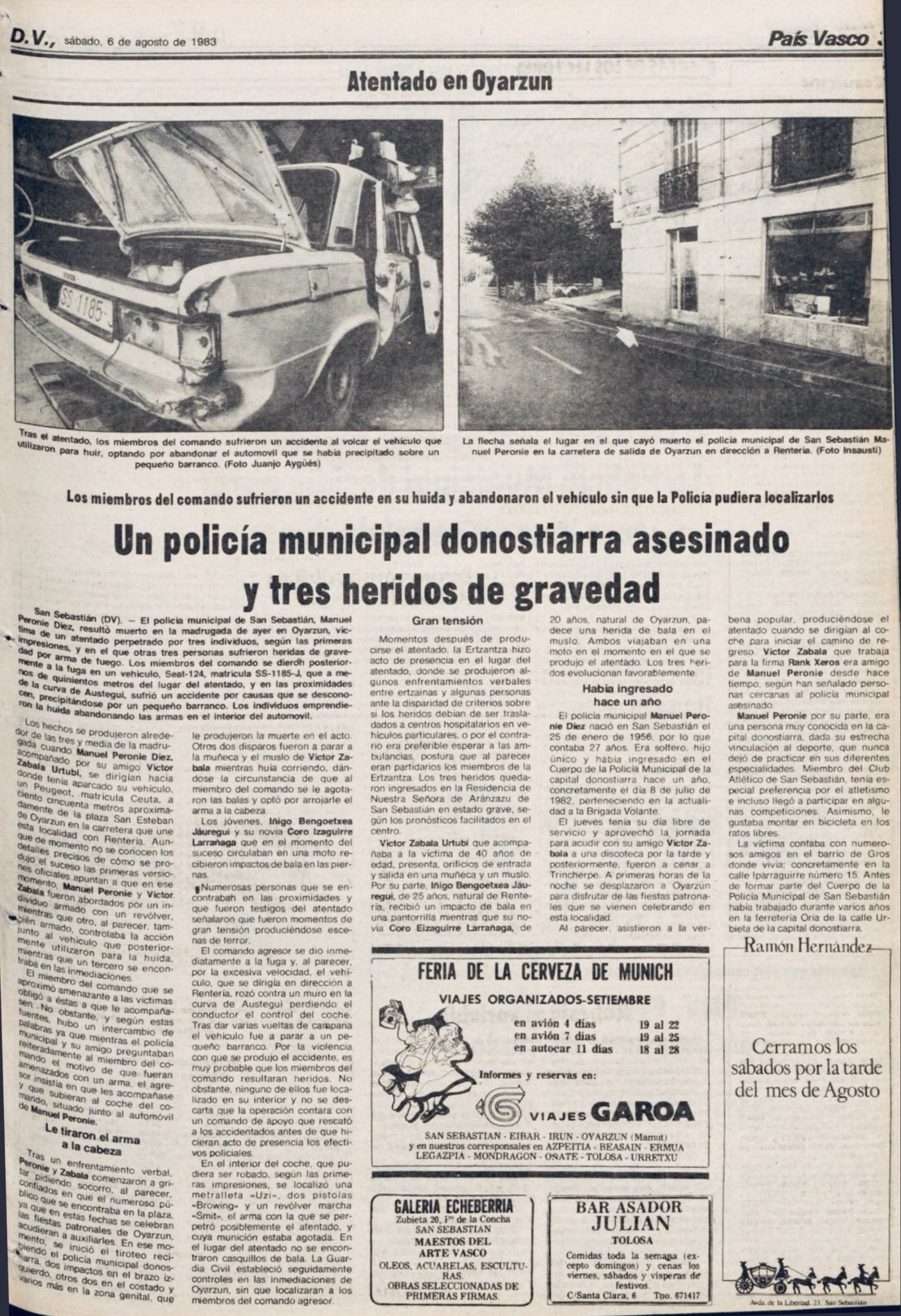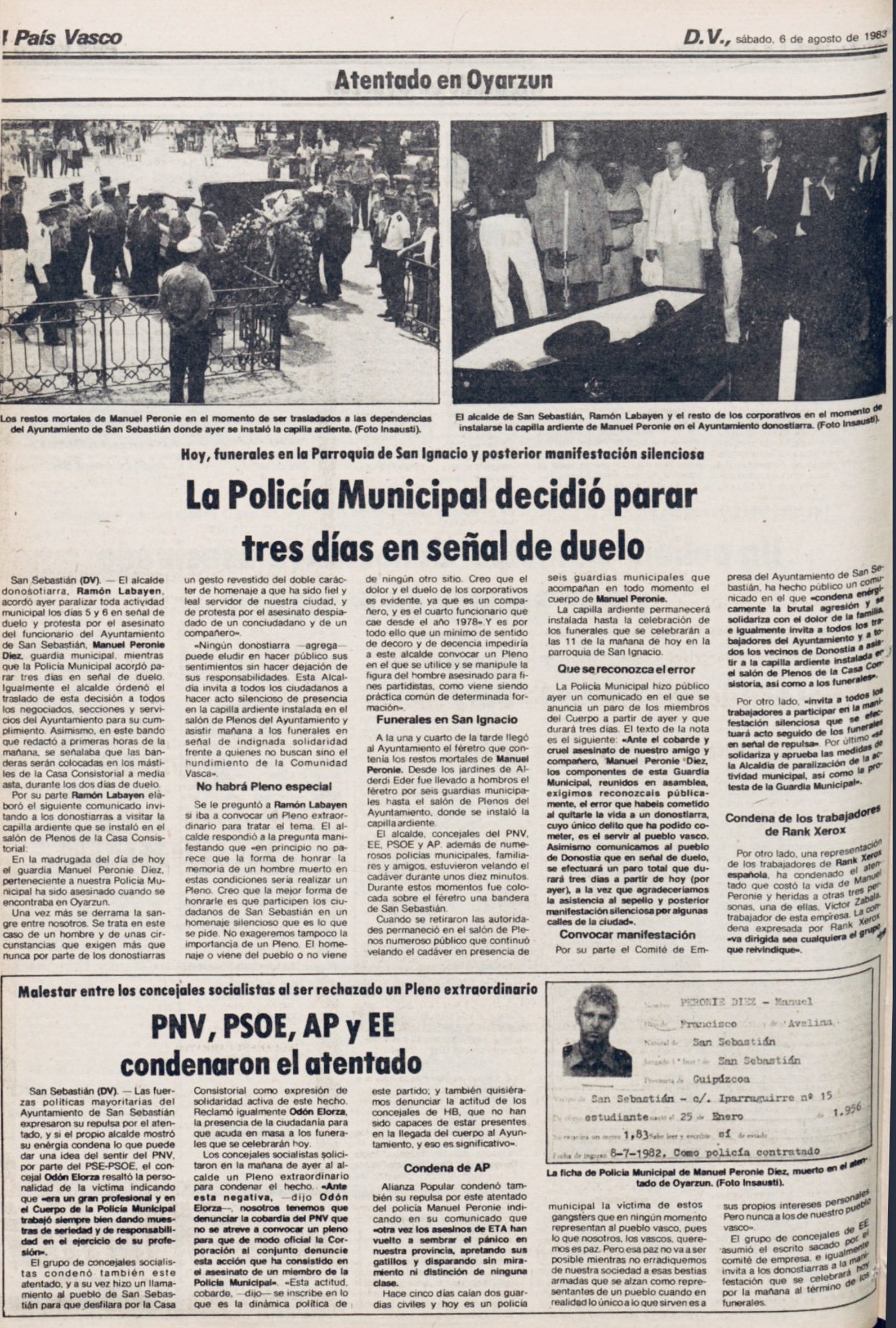 Pasadas las tres y cuarto de la madrugada del 5 de agosto de 1983, la banda terrorista ETA asesinaba en la localidad guipuzcoana de Oyarzun al policía municipal de San Sebastián MANUEL PERONIÉ DÍEZ, cuando regresaba a su domicilio tras cenar en un restaurante junto a su amigo Víctor Zabala Urturi y ambos se resistieron a ser secuestrados.