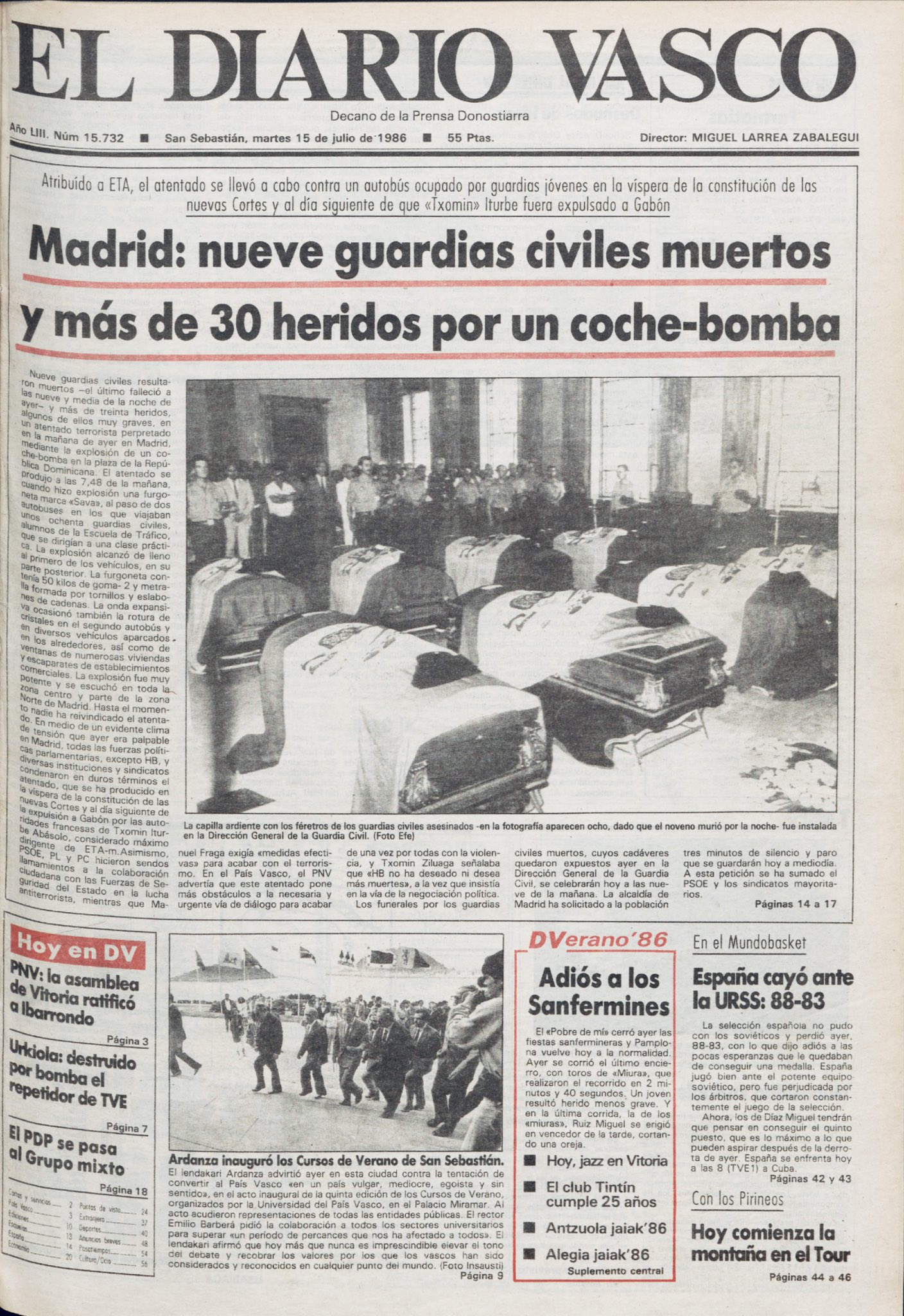 En la madrugada del 5 de agosto de 1986 falleció en el Hospital de La Paz el guardia JUAN IGNACIO CALVO GUERRERO, que resultó gravemente herido en el atentado que la banda terrorista ETA cometió el 14 de julio en la plaza de la República Dominicana de Madrid. De esta forma se convirtió en la decimosegunda víctima mortal del atentado, todos ellos jóvenes guardias civiles. Juan Ignacio se encontraba desde el día del atentado en la UVI de La Paz. A pesar de los esfuerzos médicos, no pudo superar las graves heridas sufridas.
