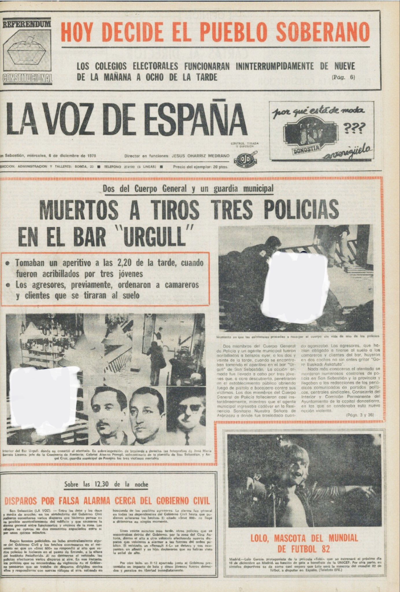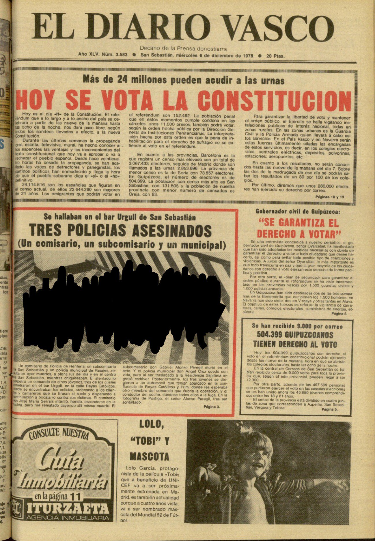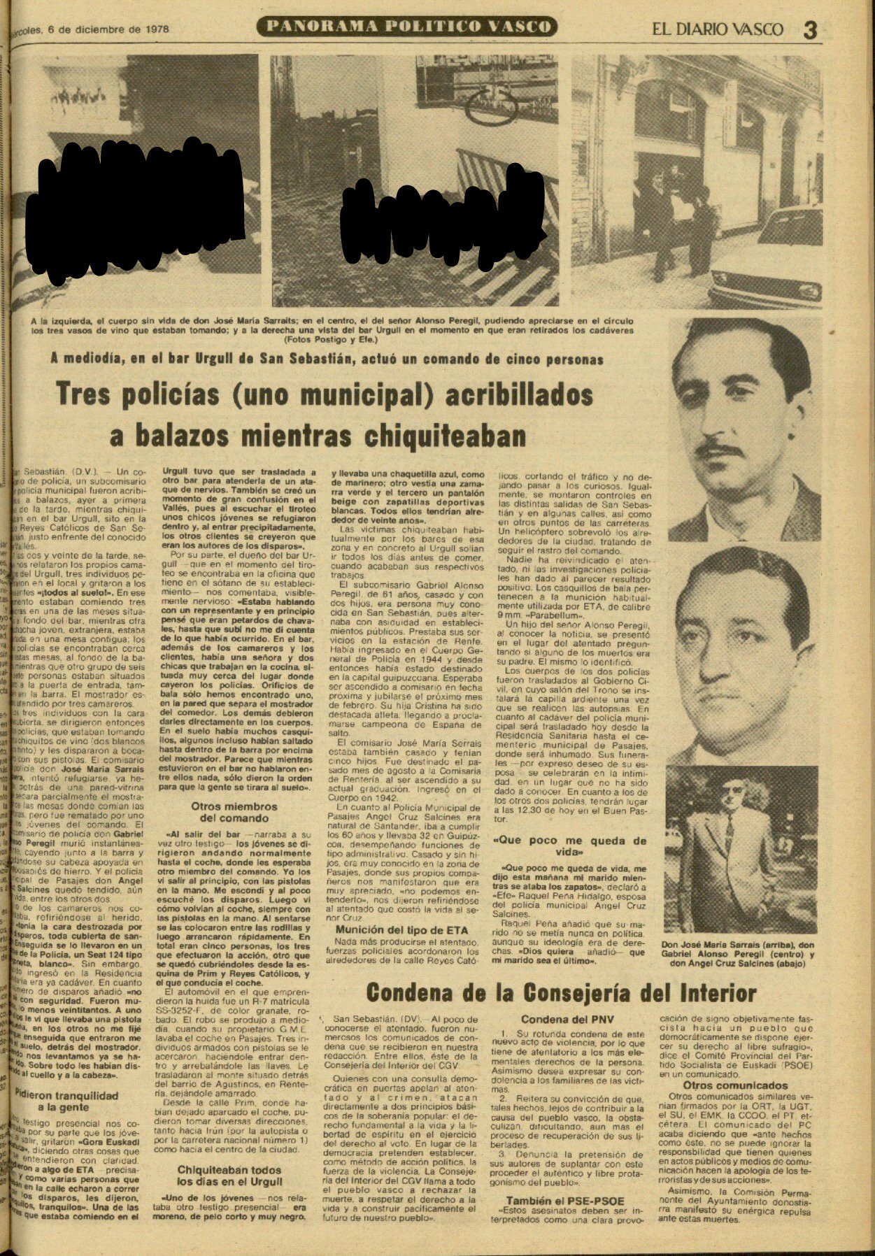 A las dos y veinte de la tarde del 5 de diciembre de 1978, la víspera del referéndum de la Constitución, la banda terrorista ETA acribillaba a balazos en un bar de San Sebastián al subcomisario de Policía GABRIEL ALONSO PEREJIL, al policía municipal ANGEL CRUZ SALCINES, y al comisario de Policía JOSE MARÍA SARRAIS LLASERA.
