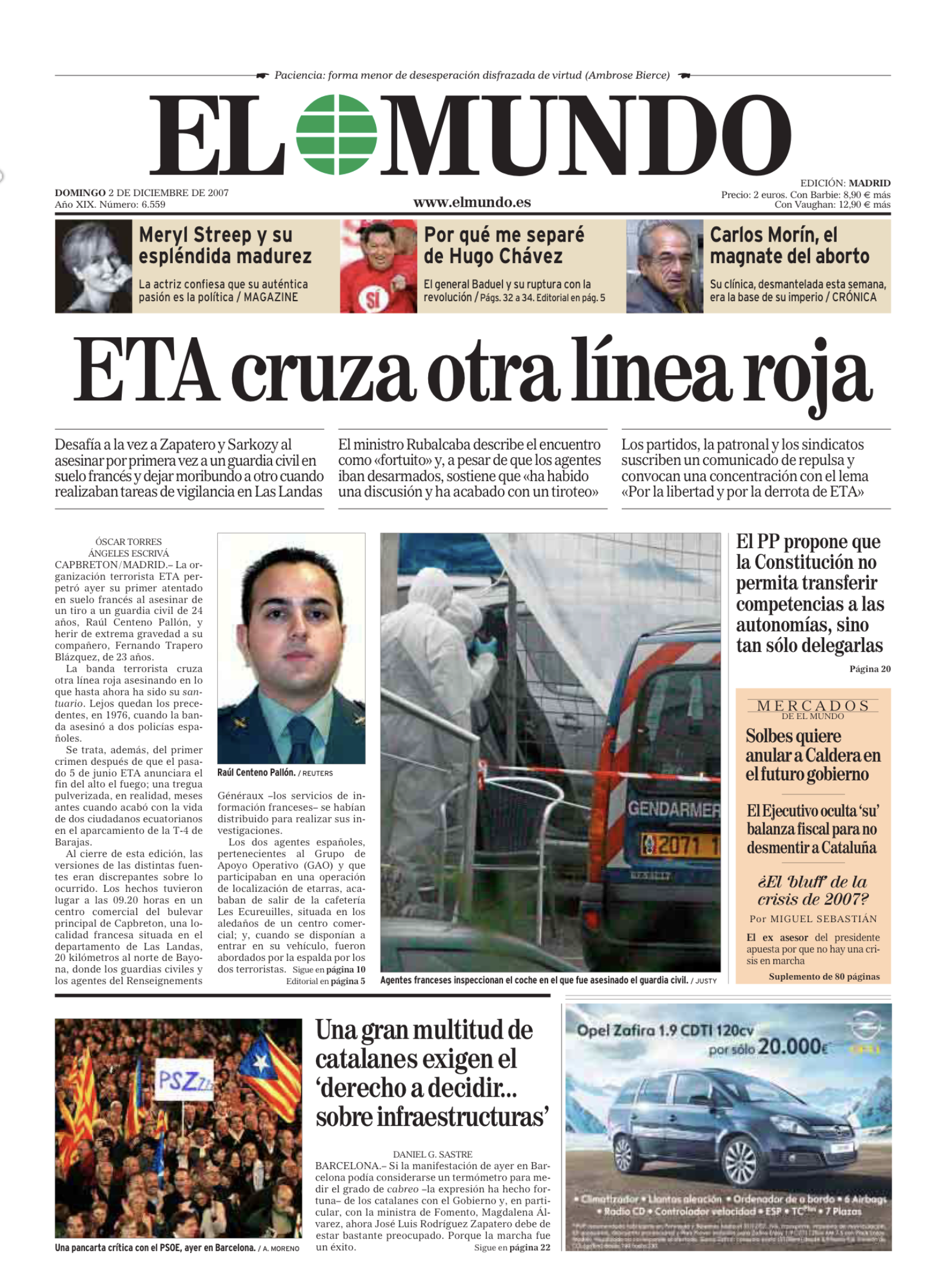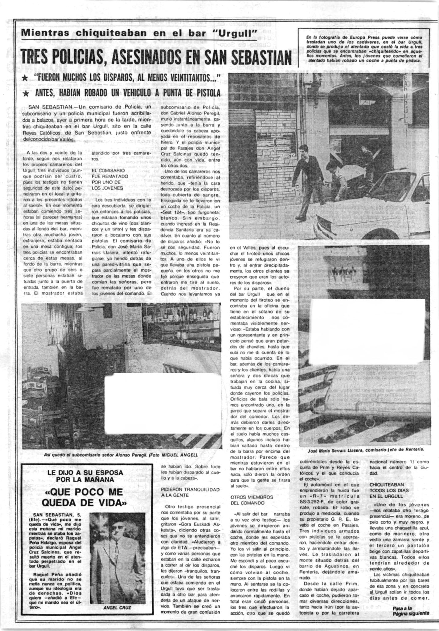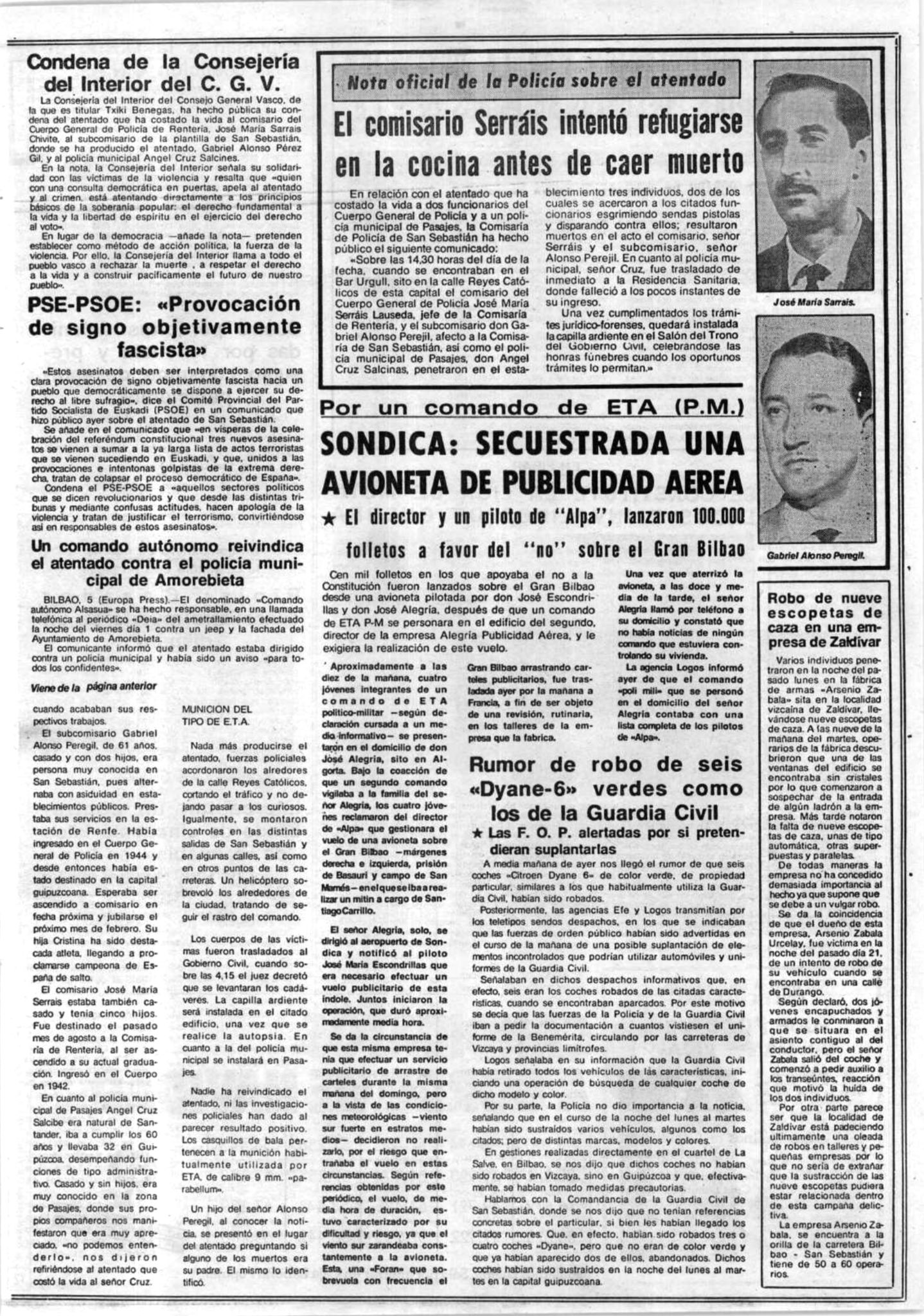 A las dos y veinte de la tarde del 5 de diciembre de 1978, la víspera del referéndum de la Constitución, la banda terrorista ETA acribillaba a balazos en un bar de San Sebastián al subcomisario de Policía GABRIEL ALONSO PEREJIL, al policía municipal ANGEL CRUZ SALCINES, y al comisario de Policía JOSE MARÍA SARRAIS LLASERA.