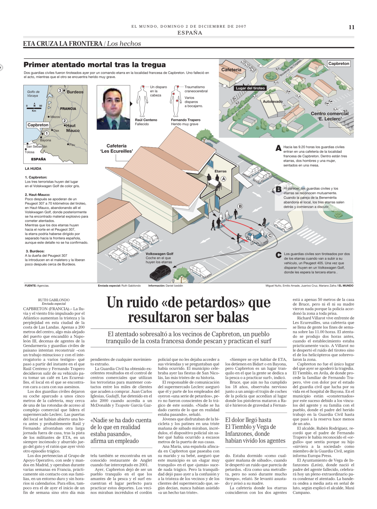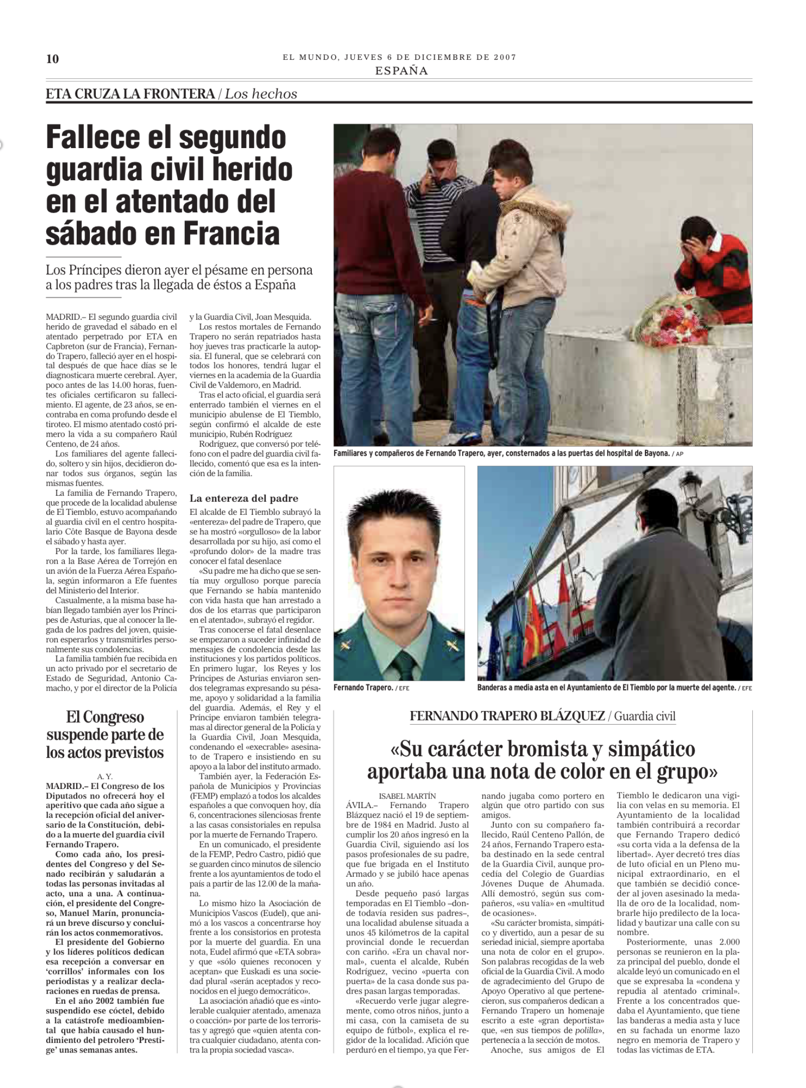 El 5 de diciembre de 2007 fallece, tras cuatro días de agonía, el guardia civil FERNANDO TRAPERO BLÁZQUEZ, herido en el atentado que la banda terrorista ETA cometió en Capbreton (Francia) y en el que falleció en el acto su compañero Raúl Centeno Bayón.