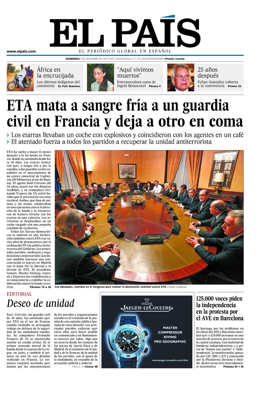 El 5 de diciembre de 2007 fallece, tras cuatro días de agonía, el guardia civil FERNANDO TRAPERO BLÁZQUEZ, herido en el atentado que la banda terrorista ETA cometió en Capbreton