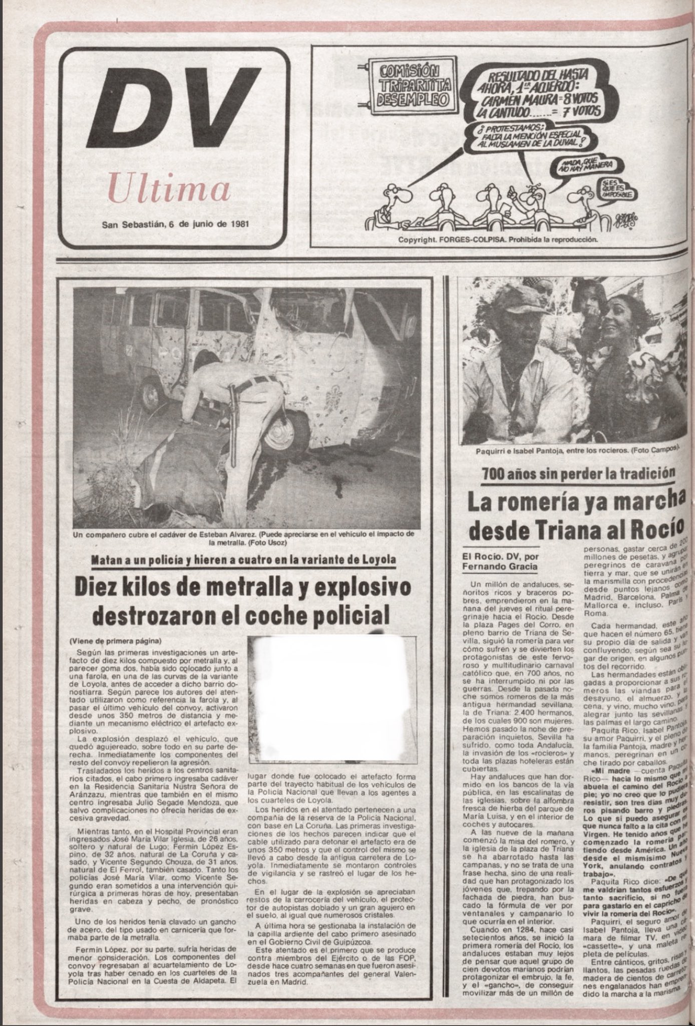 Minutos después de las once de la noche del 5 de junio de 1981, la banda terrorista ETA asesinaba en San Sebastián al cabo primero de la Policía Nacional ESTEBAN ÁLVAREZ MERAYO mediante la explosión de un potente artefacto al paso de la furgoneta en la que regresaba a su acuartelamiento. Los otros cuatro policías que integraban la dotación del vehículo sufrieron heridas de diversa consideración.El artefacto explosivo era del tipo hornillo, preparado para concentrar la onda expansiva en una dirección determinada, y estaba colocado en el lado derecho de la autovía. Contenía una cantidad considerable de Goma 2, además de ocho o diez kilos de tornillos y tuercas de gran tamaño, a modo de metralla. Fue accionado por un cebo eléctrico que alimentaban seis pilas, desde una distancia superior a los doscientos metros. El estallido abrió un agujero en la chapa de la carrocería y alcanzó de lleno al cabo primero, que ocupaba el asiento delantero junto al conductor.