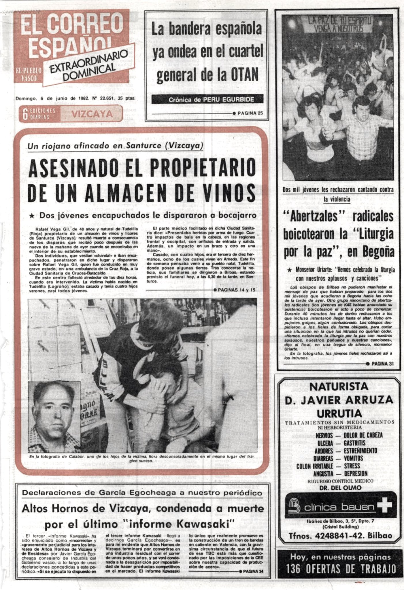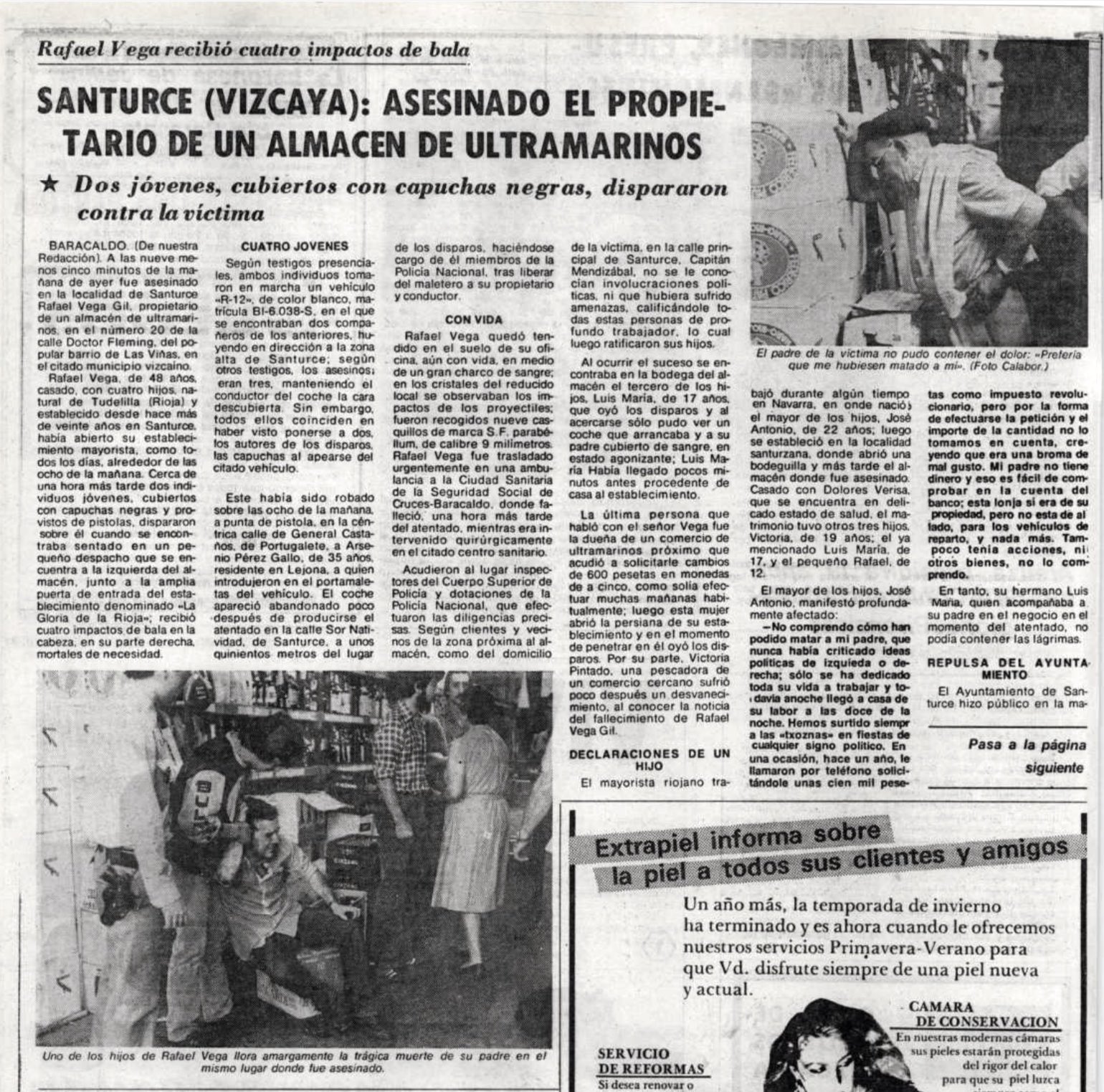 Un año después, a las nueve de la mañana del 5 de junio de 1982, la banda terrorista ETA asesinaba a tiros en Santurce (Vizcaya) al empresario y vinatero riojano RAFAEL VEGA GIL. En torno a las ocho de la mañana, y acompañado por uno de sus hijos, la víctima había abierto su almacén de vinos y licores La Gloria de La Rioja, en el número 22 de la calle del Doctor Fleming, de Santurce. Una hora después, y cuando se encontraba en el interior de la pequeña oficina acristalada situada a la entrada del almacén, dos encapuchados se apearon de un vehículo, se acercaron al empresario y, sin mediar palabra, efectuaron contra él varios disparos de pistola. La víctima fue alcanzada por seis impactos de bala, cuatro de ellos en la cabeza.