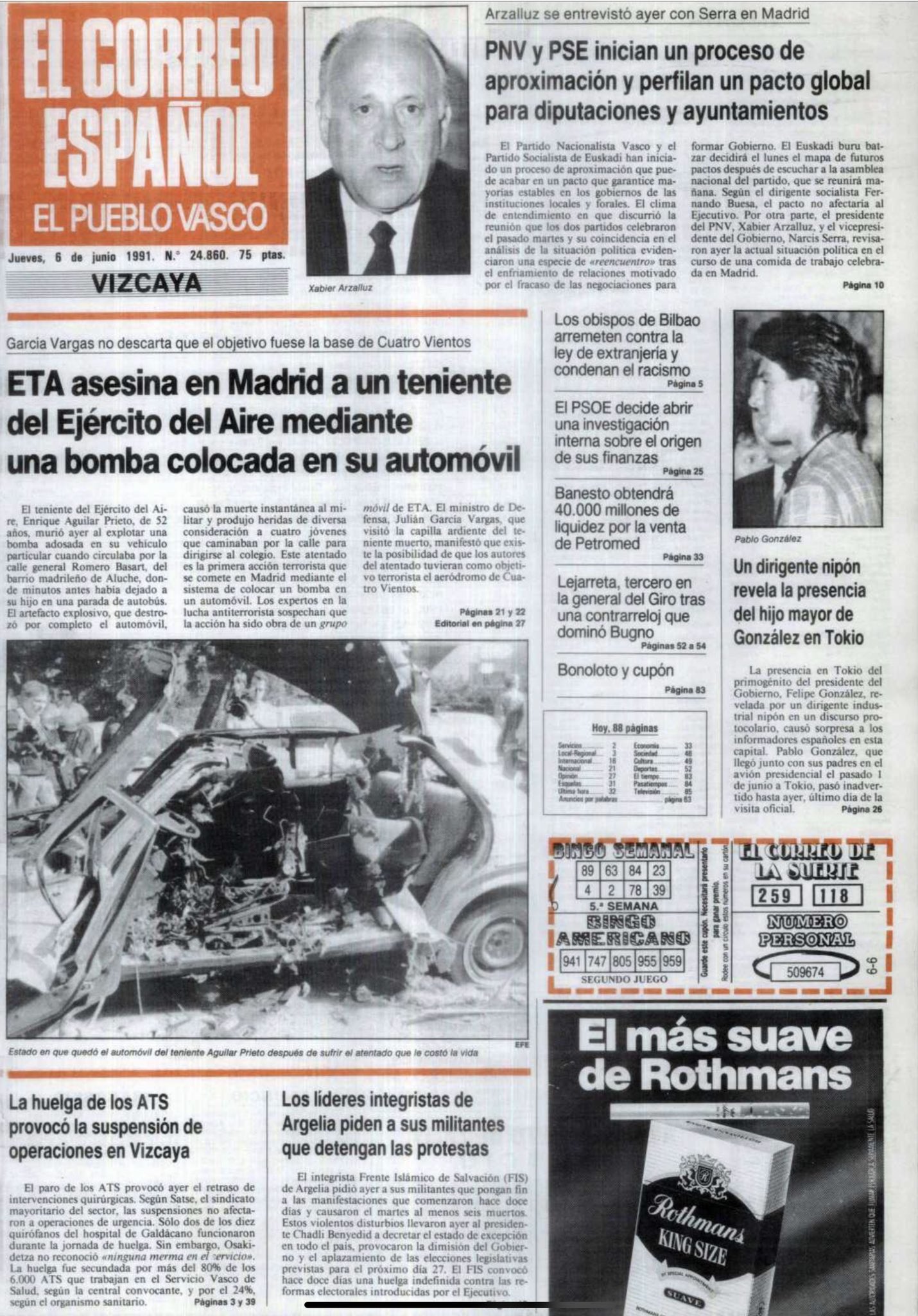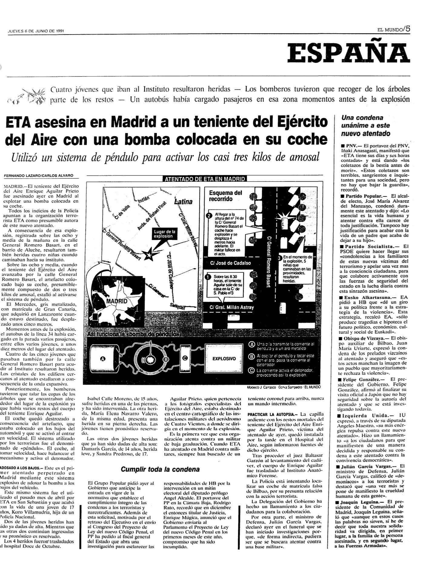 El 5 de junio de 1991 la banda terrorista ETA asesinaba en Madrid al teniente del Ejército del Aire ENRIQUE AGUILAR PRIETO. El método utilizado fue una bomba-lapa adosada a los bajos de su coche. La explosión, que tuvo lugar frente al número 115 de la calle del General Romero Basart, en el barrio madrileño de Aluche, hirió también a cuatro adolescentes que esperaban en la parada del autobús.