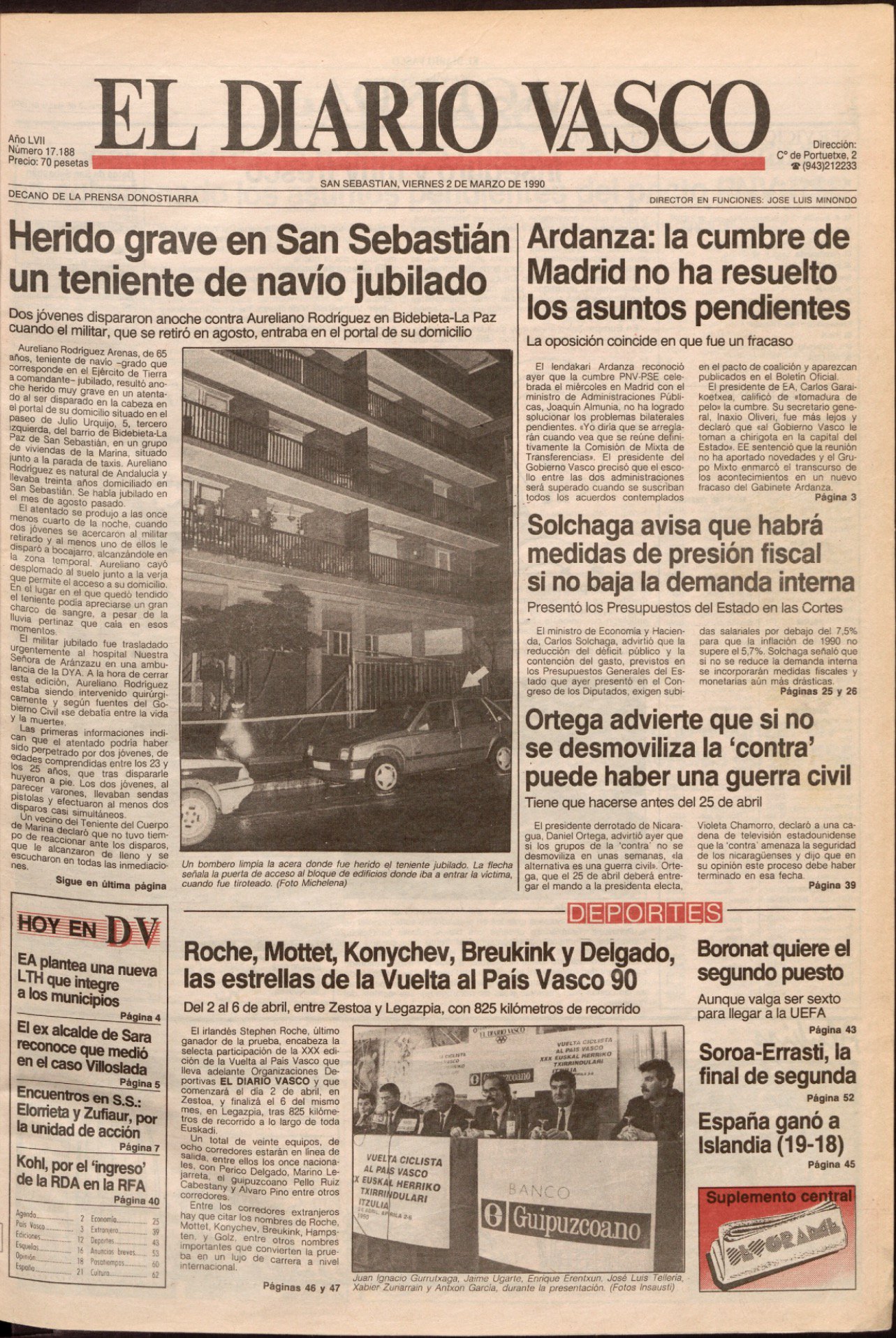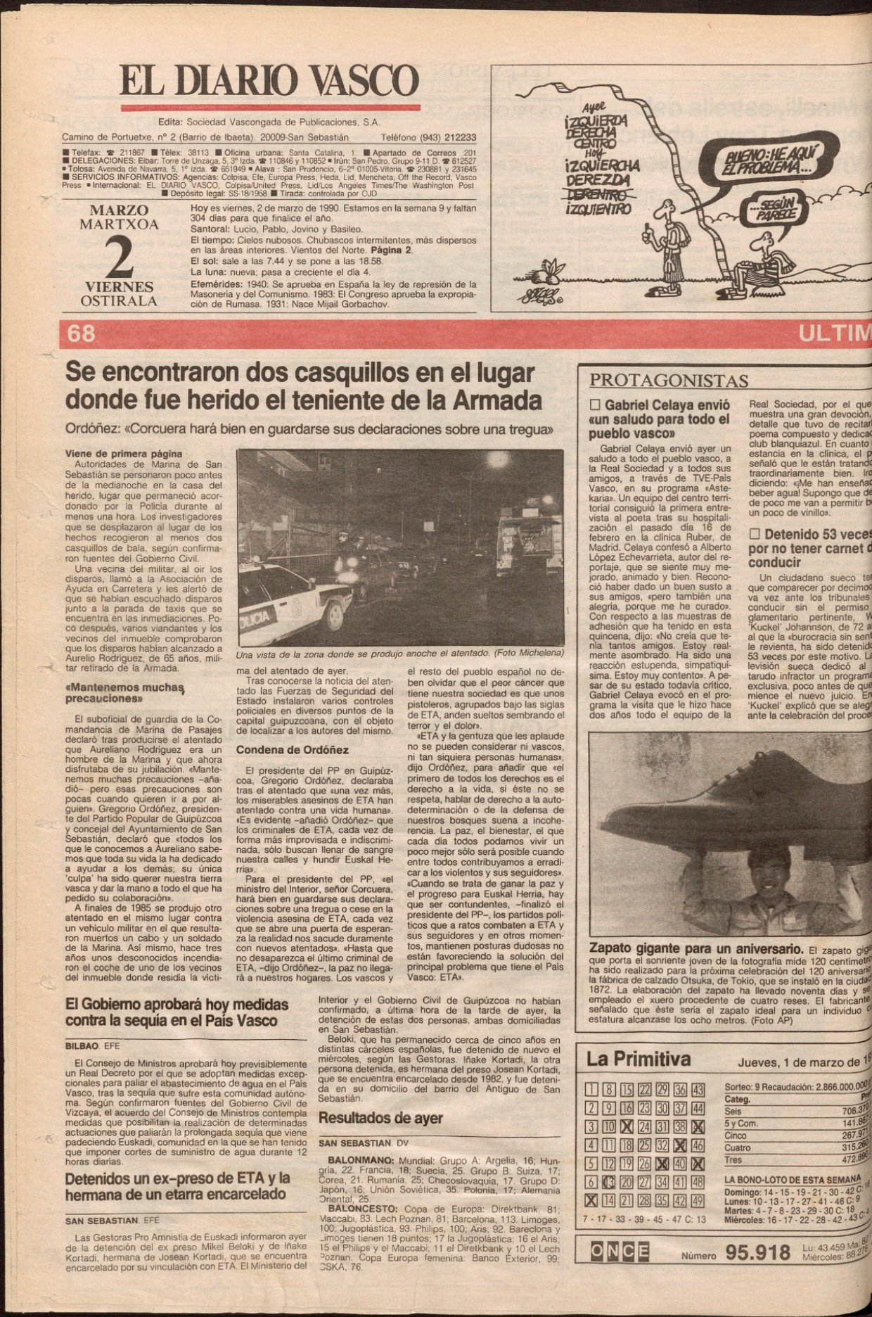 El 05 de marzo de 1990 fallecía el teniente de navío retirado AURELIANO RODRÍGUEZ ARENAS, que había recibido dos tiros en la cabeza cuatro días antes en San Sebastián.