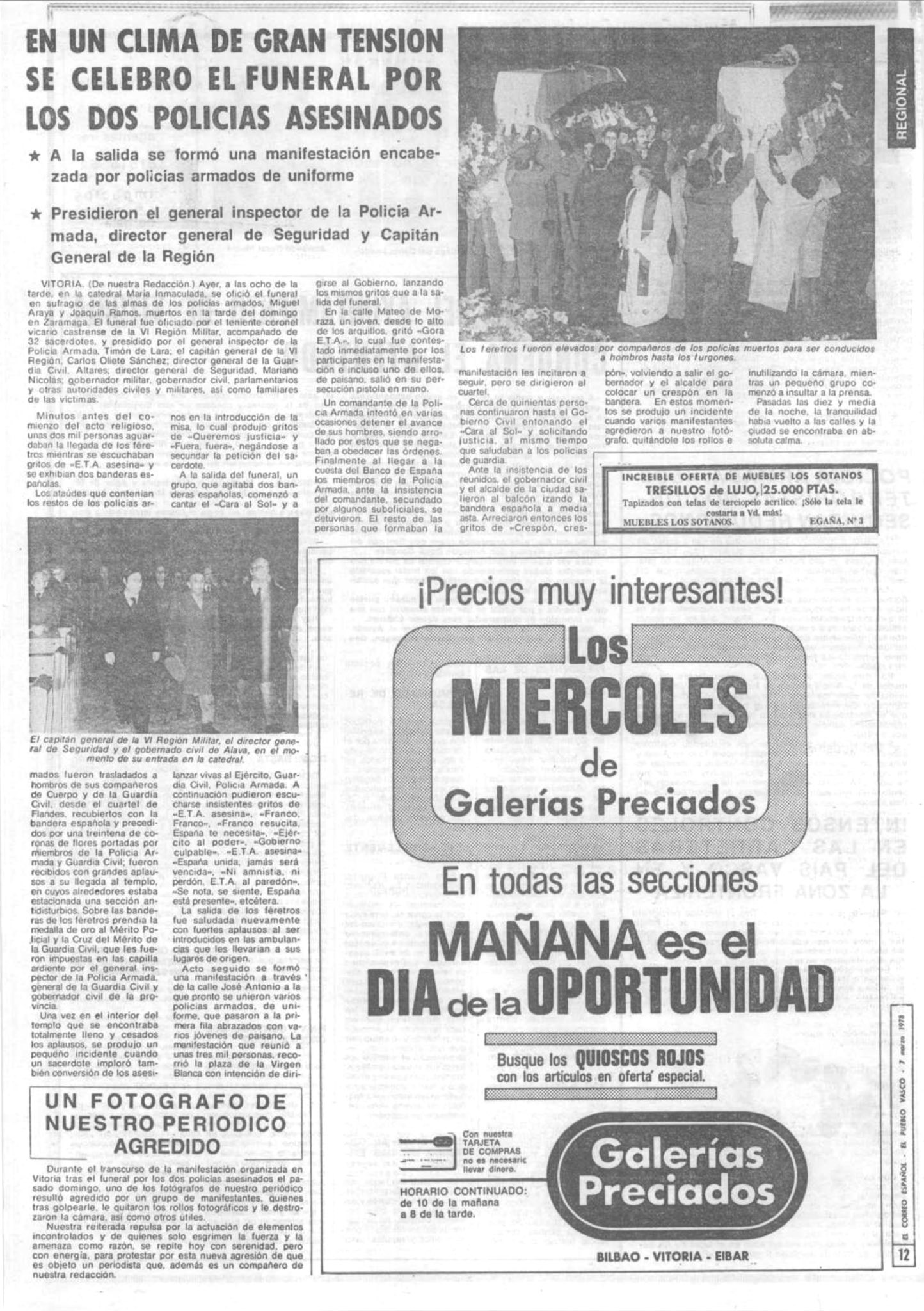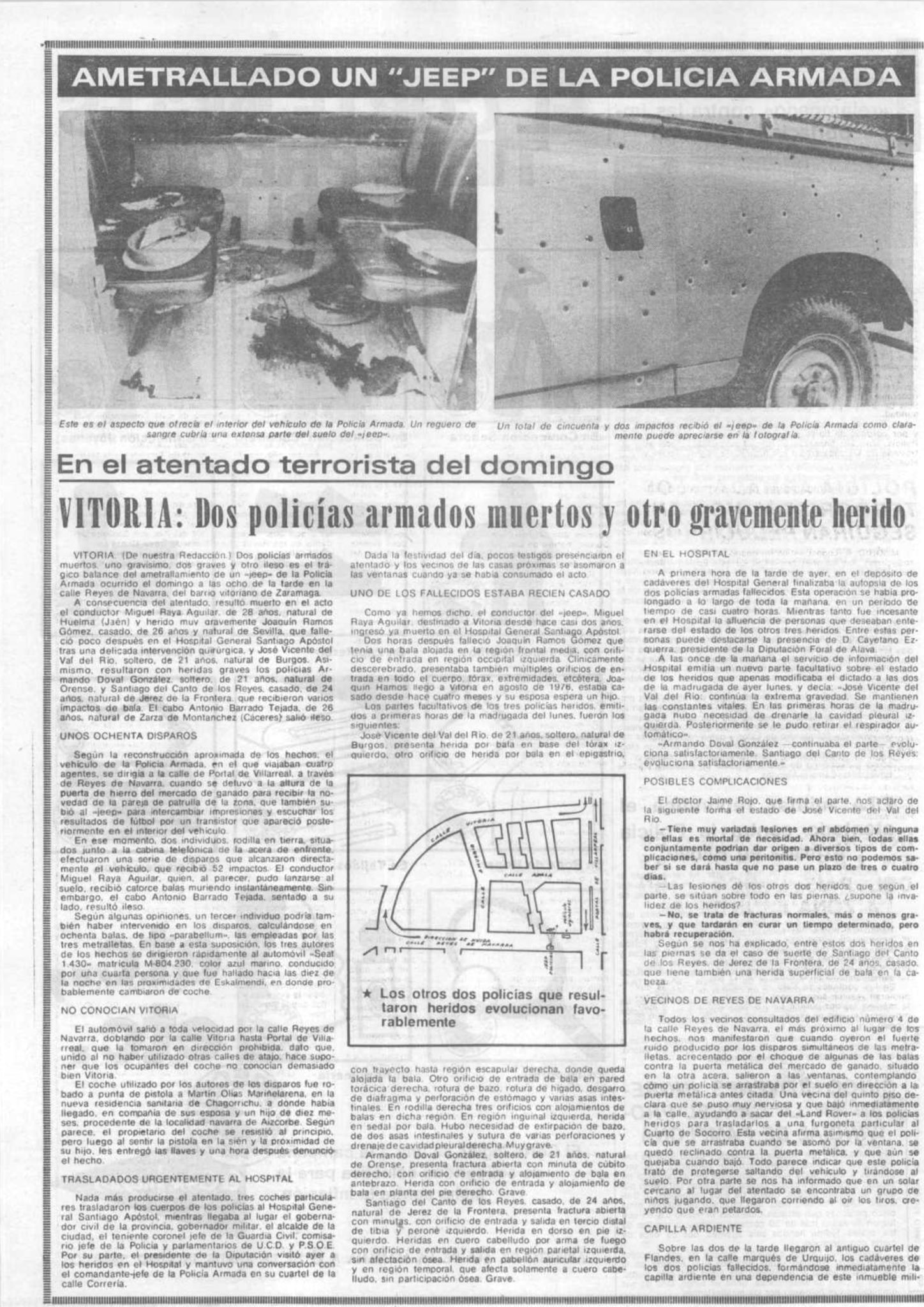 A las 20:00 horas del 5 de marzo de 1978, dos policías nacionales resultaron muertos y tres heridos -uno de ellos de extrema gravedad- al ser ametrallado el Jeep que ocupaban por dos o tres terroristas de ETA. Los fallecidos eran MIGUEL ÁNGEL RAYA AGUILAR y JOAQUÍN RAMOS GÓMEZ. El agente que resultó gravemente herido fue José Vicente del Val del Río, de 21 años y natural de Burgos. Presentaba heridas de bala en hemitórax, hepigastrio, pared torácica derecha y rotura de bazo -que le fue extirpado- e hígado. Su estado fue calificado por los médicos como de extrema gravedad. Se debatió entre la vida y la muerte durante veinticinco días, falleciendo finalmente el 30 de marzo.