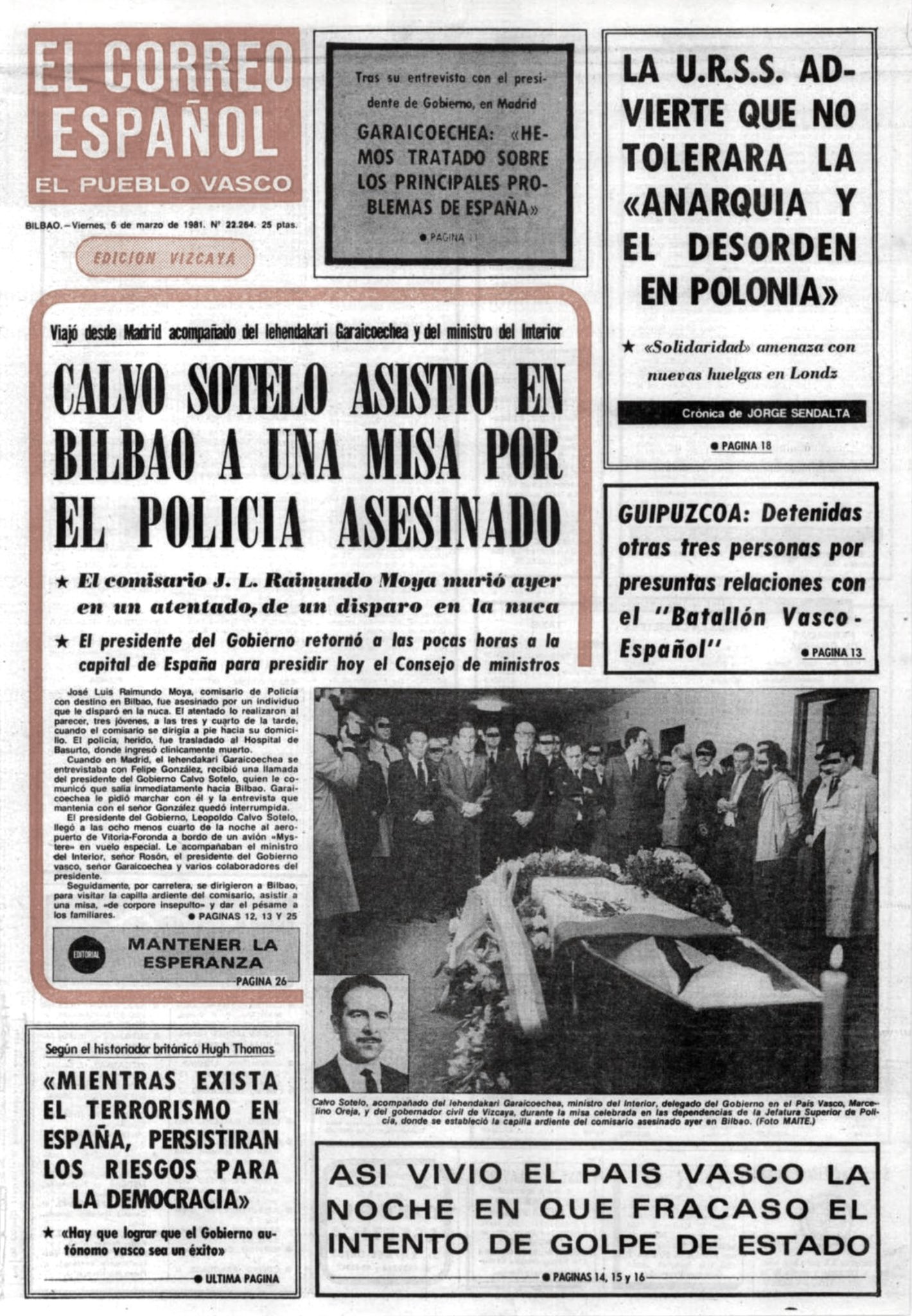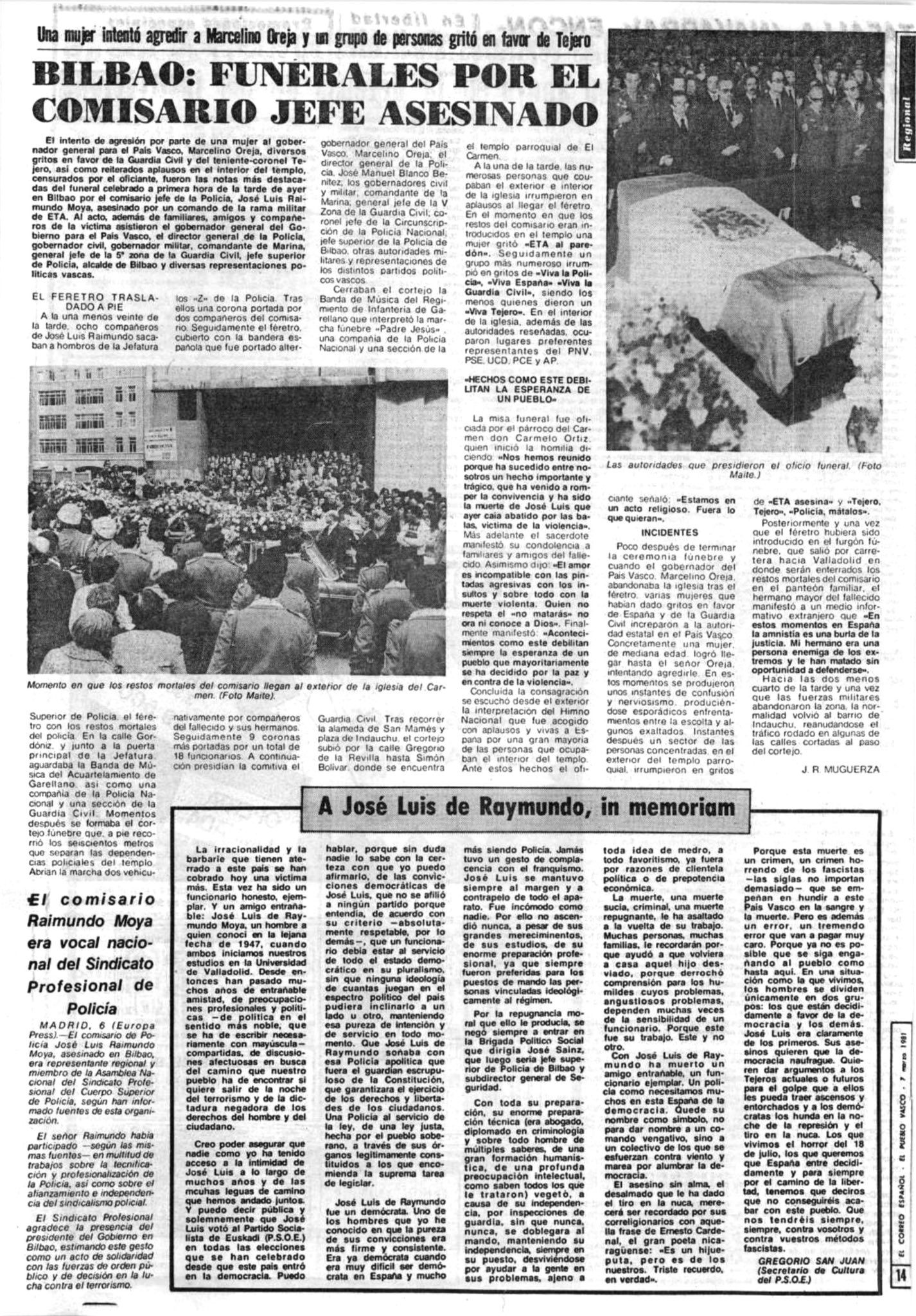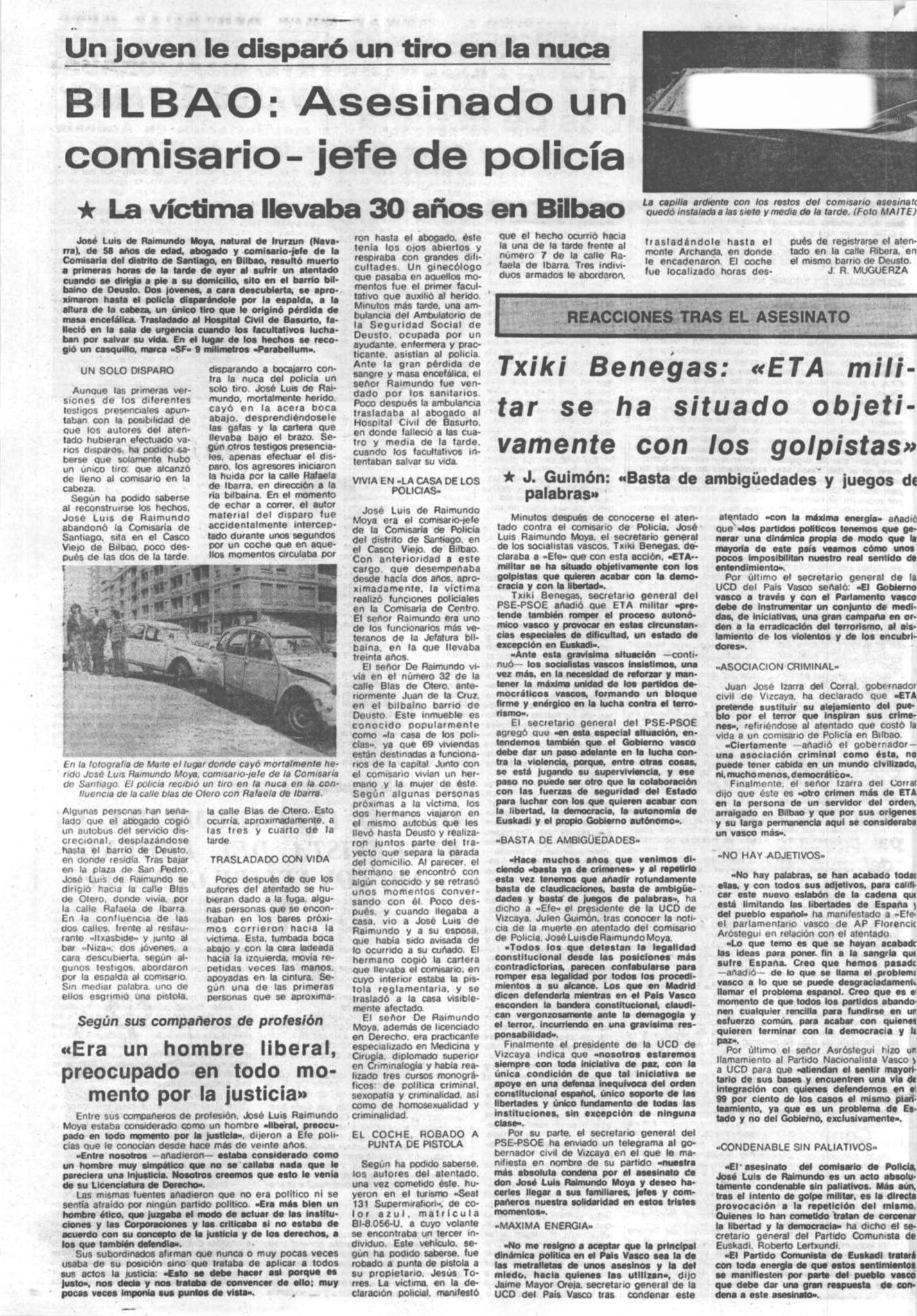 Un mes después del asesinato, previo secuestro, del ingeniero Ryan, y menos de dos semanas después del 23-F, a las 15:15 horas del 5 de marzo de 1981, ETA asesinaba en el barrio bilbaíno de Deusto al comisario de Policía JOSÉ LUIS RAIMUNDO MOYA. Un etarra, que se había bajado de un vehículo en el que había otros dos terroristas, se dirigió a él y le disparó a bocajarro un tiro en la nuca cuando se dirigía a pie a su domicilio en la calle Blas de Otero, donde vivía con su hermano y su cuñada.